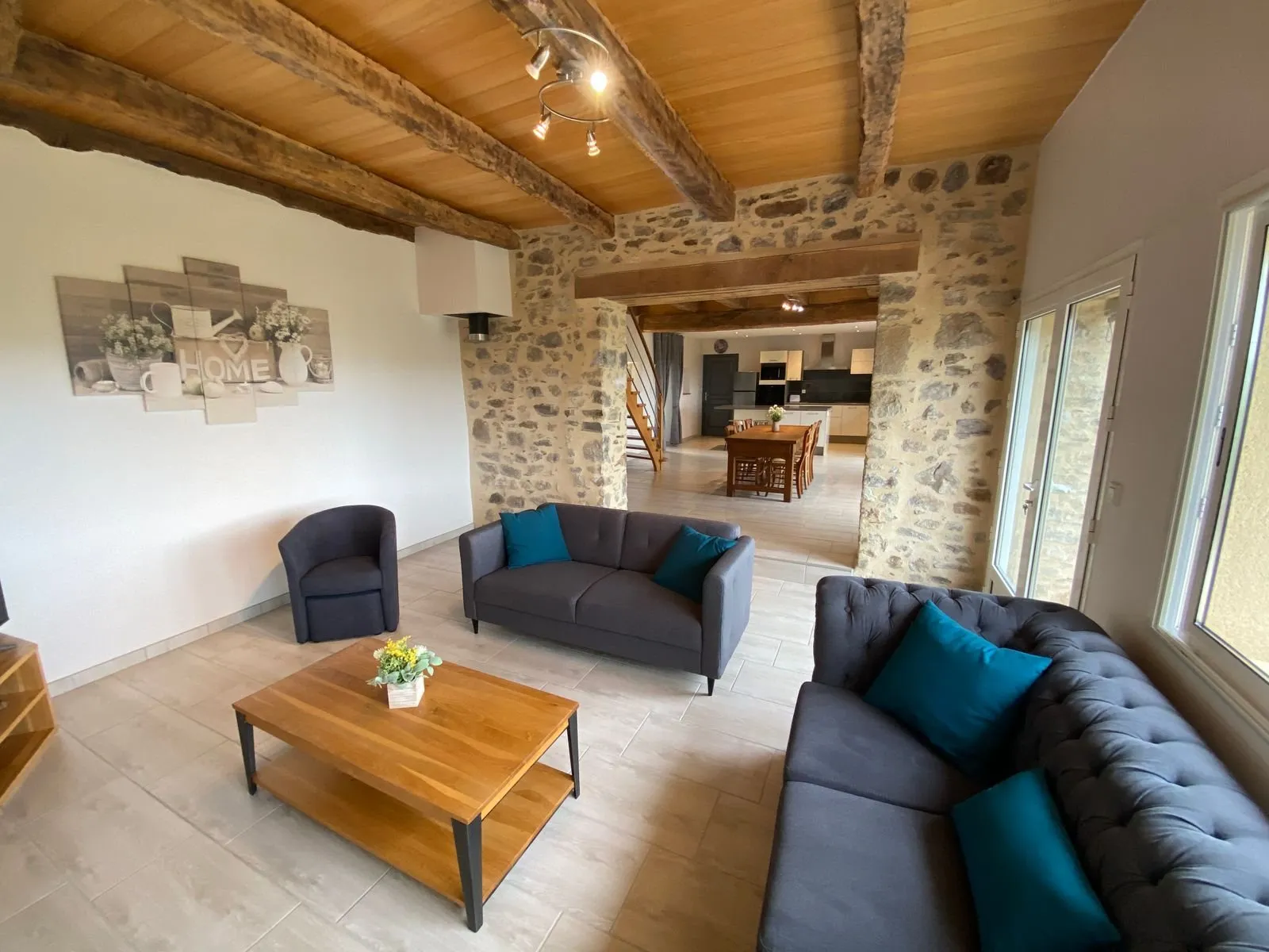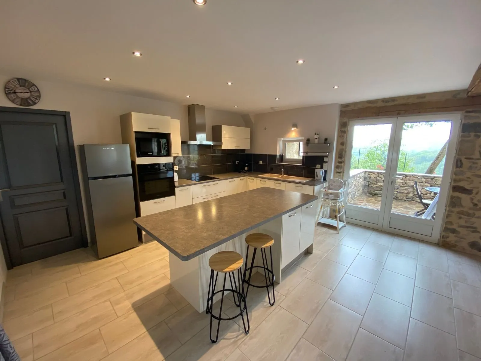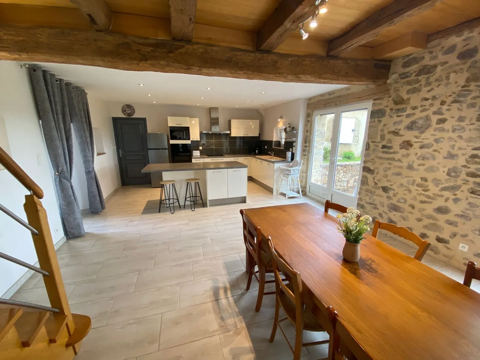 Au rez-de-chaussée : coin cuisine/séjour avec induction, four micro-ondes, réfrigérateur-congélateur, cafetière traditionnelle et Senséo, bouilloire, grille pain, mixeur, lave-vaisselle – 2 canapés et 1 fauteuil, tv connectée, wifi. Cellier avec lave-linge, aspirateur, fer et table à repasser. Wc indépendant.