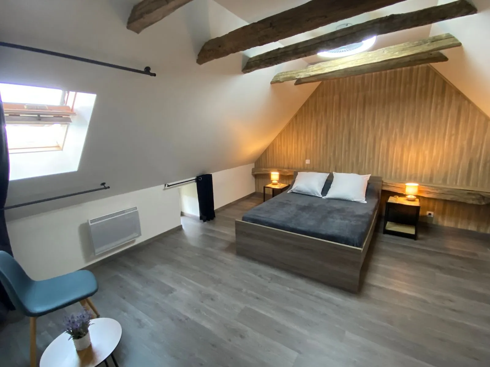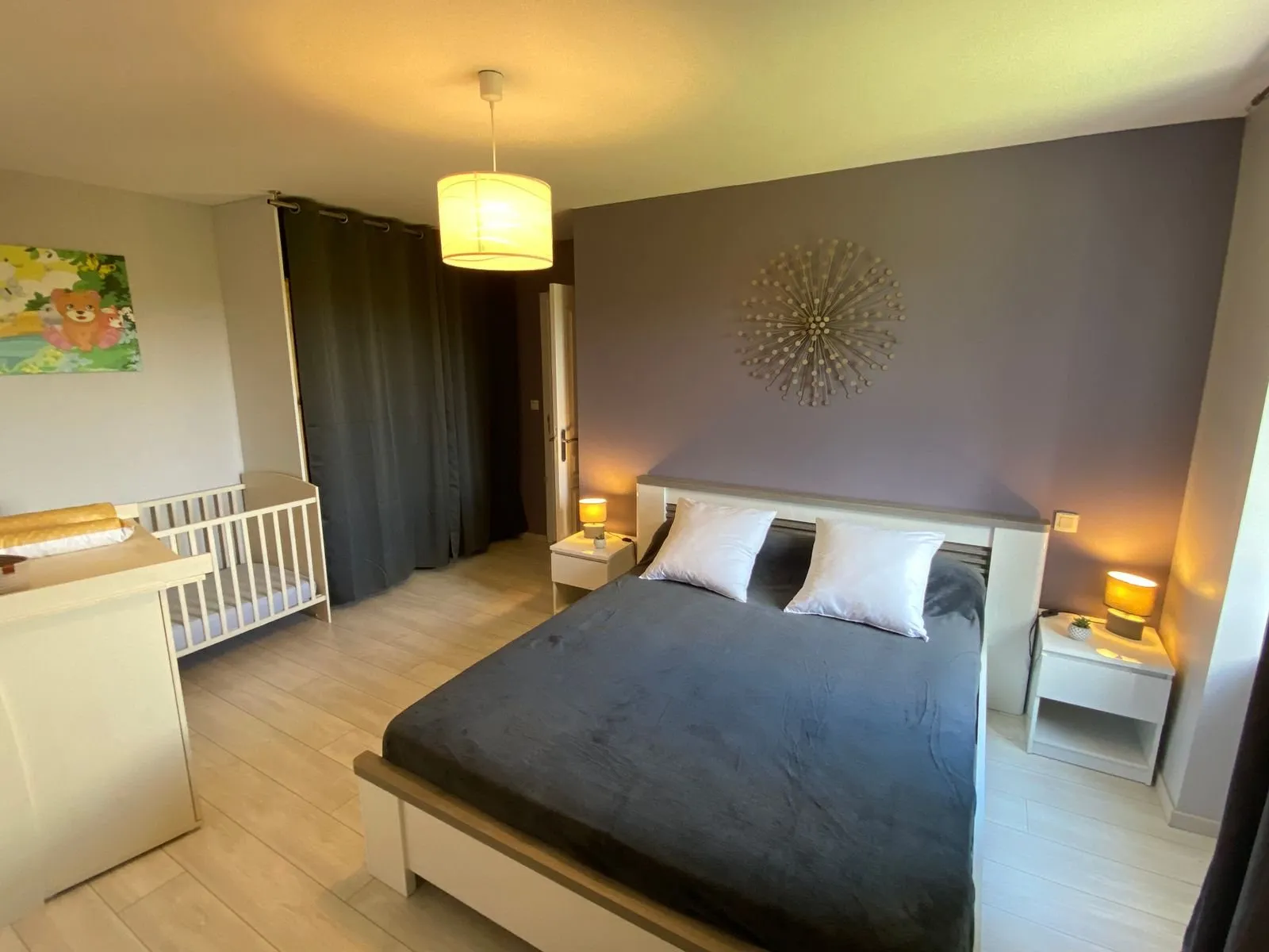 Au 1er étage : chambre 1 (un lit en 160 et un lit bébé), chambre 2 (un lit en 140), salle d’eau avec wc.