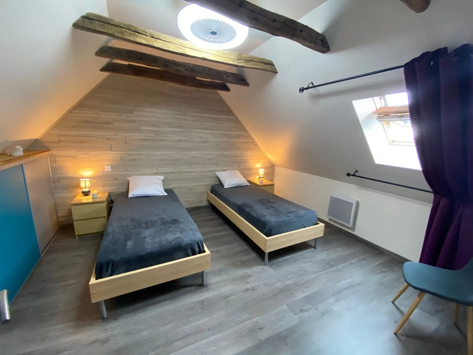 Au 2nd étage : chambre 3 (deux lits en 90, ventilateur plafond), une salle de jeux et chambre 4 (un lit en 140, ventilateur plafond).