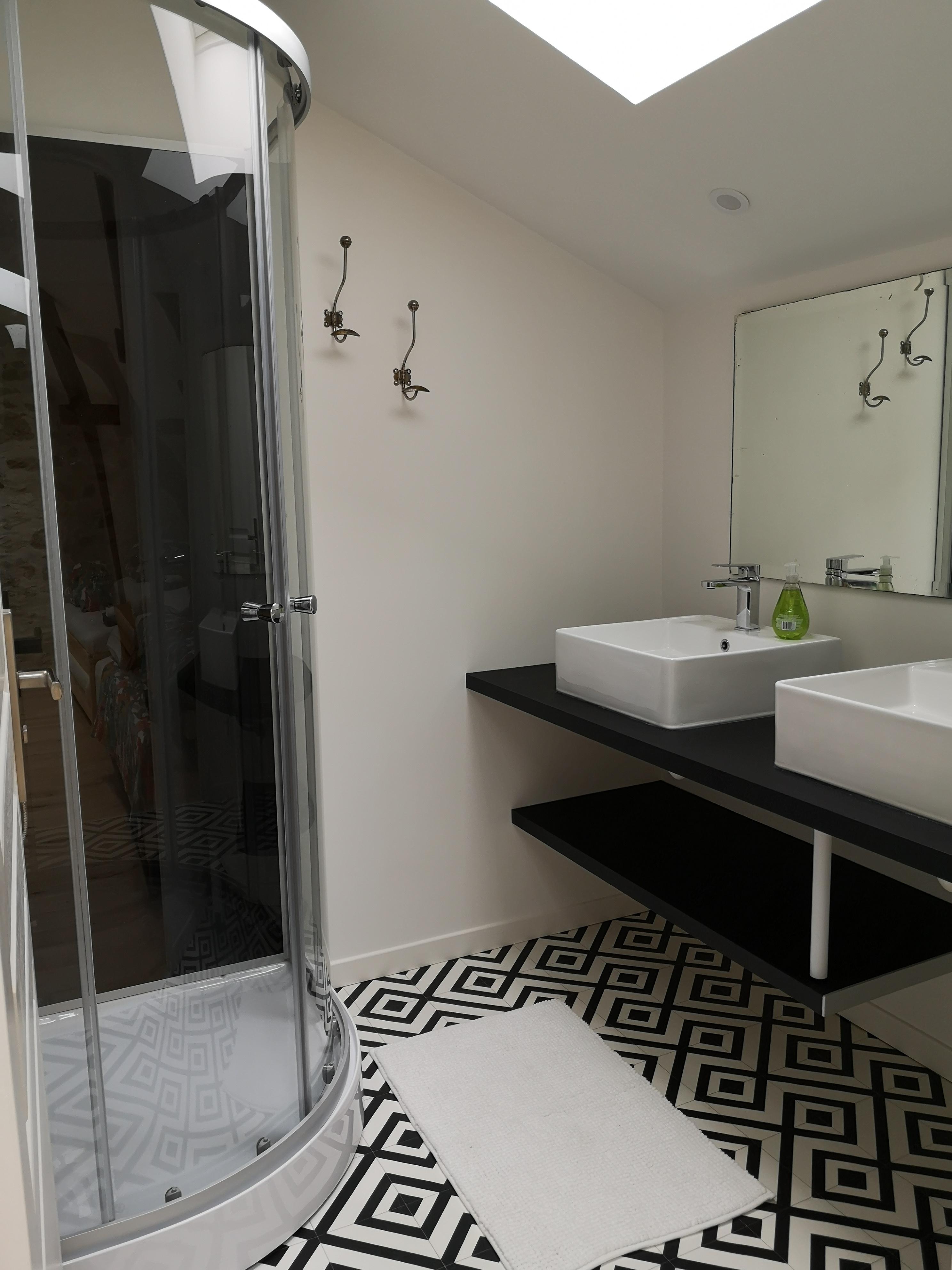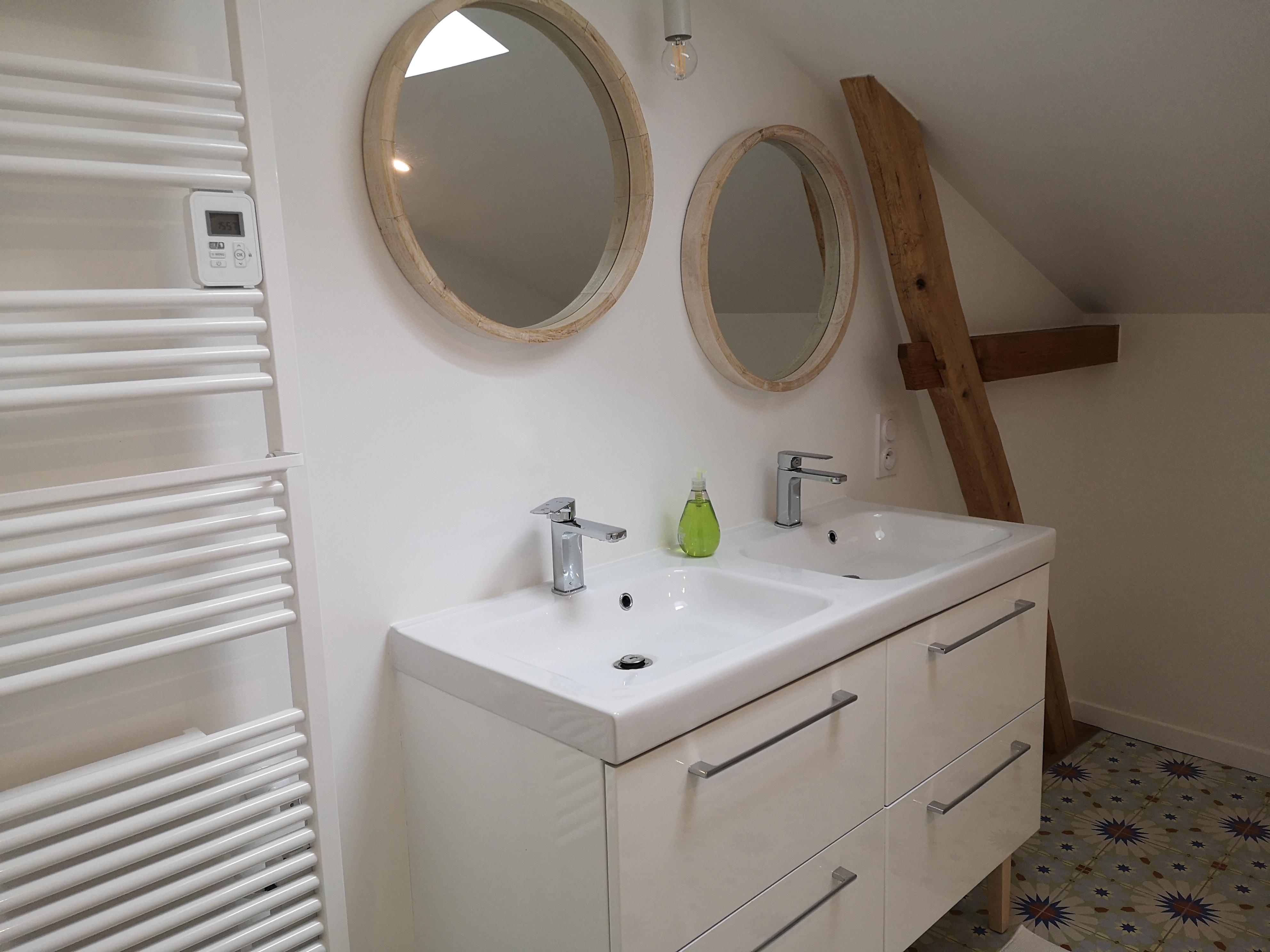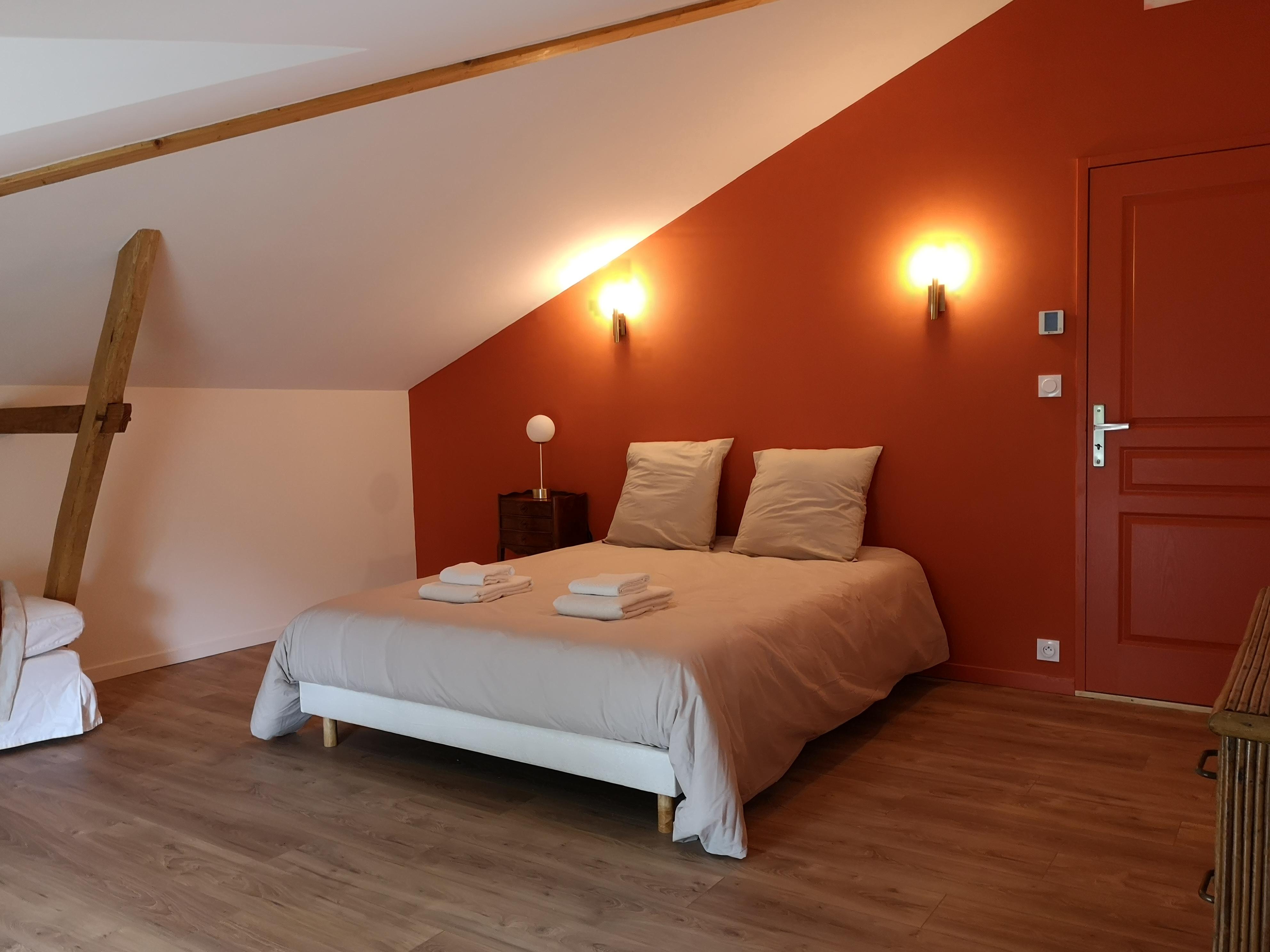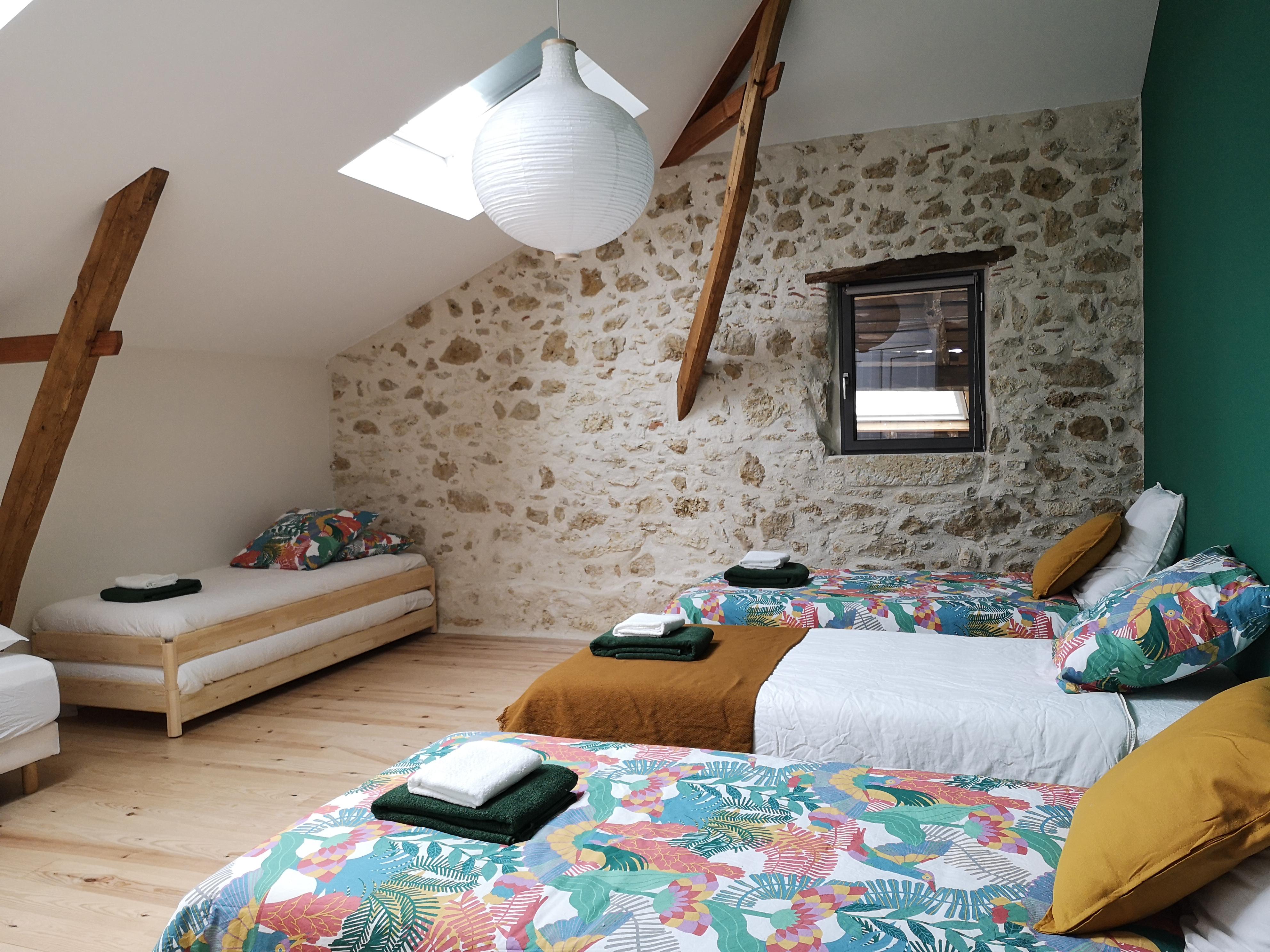 Au rez-de-chaussée, l’entrée avec cage d’escalier dessert une salle à manger, une cuisine équipée, une buanderie, un WC indépendant, un salon (TV, canapé, babyfoot) ainsi qu’un salon de lecture (bibliothèque et bureau). Toutes les pièces du rez-de-chaussée communiquent. À l’étage, on trouve une chambre dortoir avec 4 lits 90 et 1 lit 80 (+ 1 lit 80 d’appoint) et une salle d’eau privative. Sur le palier se trouvent également un un WC indépendant, une salle de bain mansardée et trois autre chambres : une chambre mansardée avec 1 lit 160 ; de l’autre côté du couloir, une chambre avec 1 lit 160 et 1 lit 110×190 ; et en face, une chambre avec 1 lit 160 et sa salle d’eau privative.