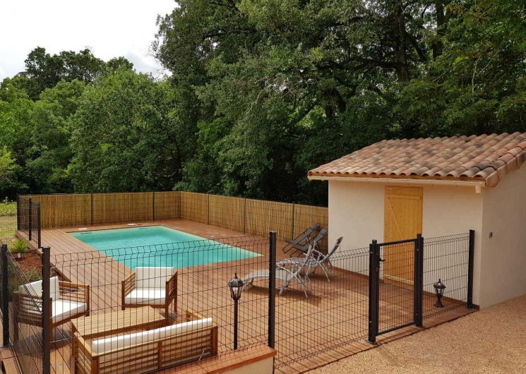 The whole house is oriented towards a centenary oak tree, outdoor spaces have been designed to offer you calm, relaxation and conviviality. On the suspended terrace, vineyard atmosphere for tastings Gaillacoises while enjoying the view of the private pool (heated and secure) and the garden (closed). In the living room, you will appreciate the pink reflection of the briquettes, the refreshing shade of the forest and the sweet melody of the “Rabistau” flowing below.