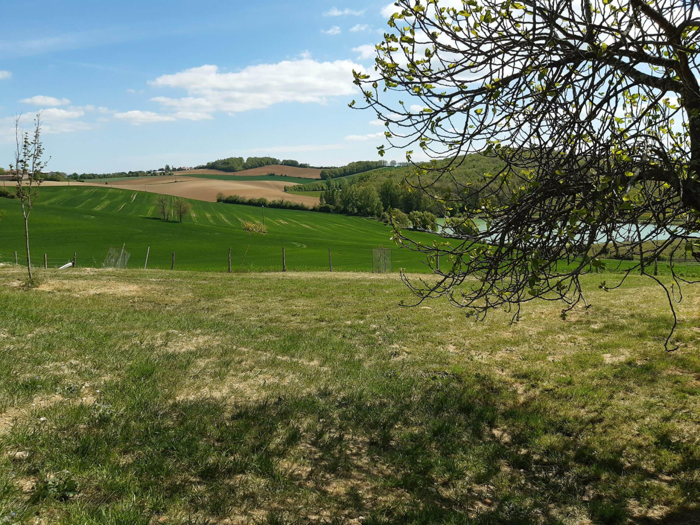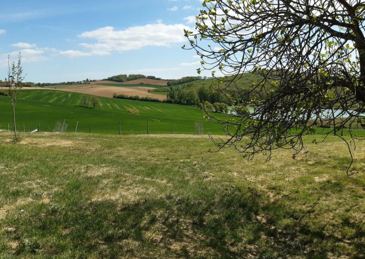 Jardin, terrasse avec jolie vue sur les vallons et collines du Pays de Cocagne et sur notre lac.