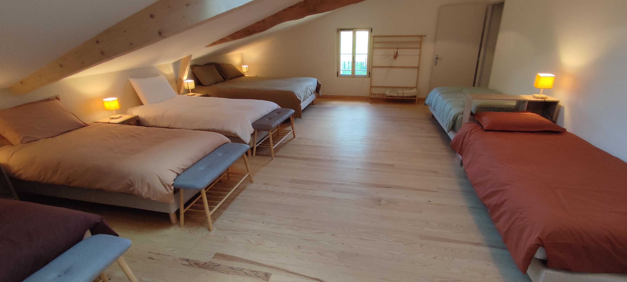 – chambre/dortoir avec 5 lits simples 90×190 (qui peuvent se rapprocher) et 1 lit double 160×200