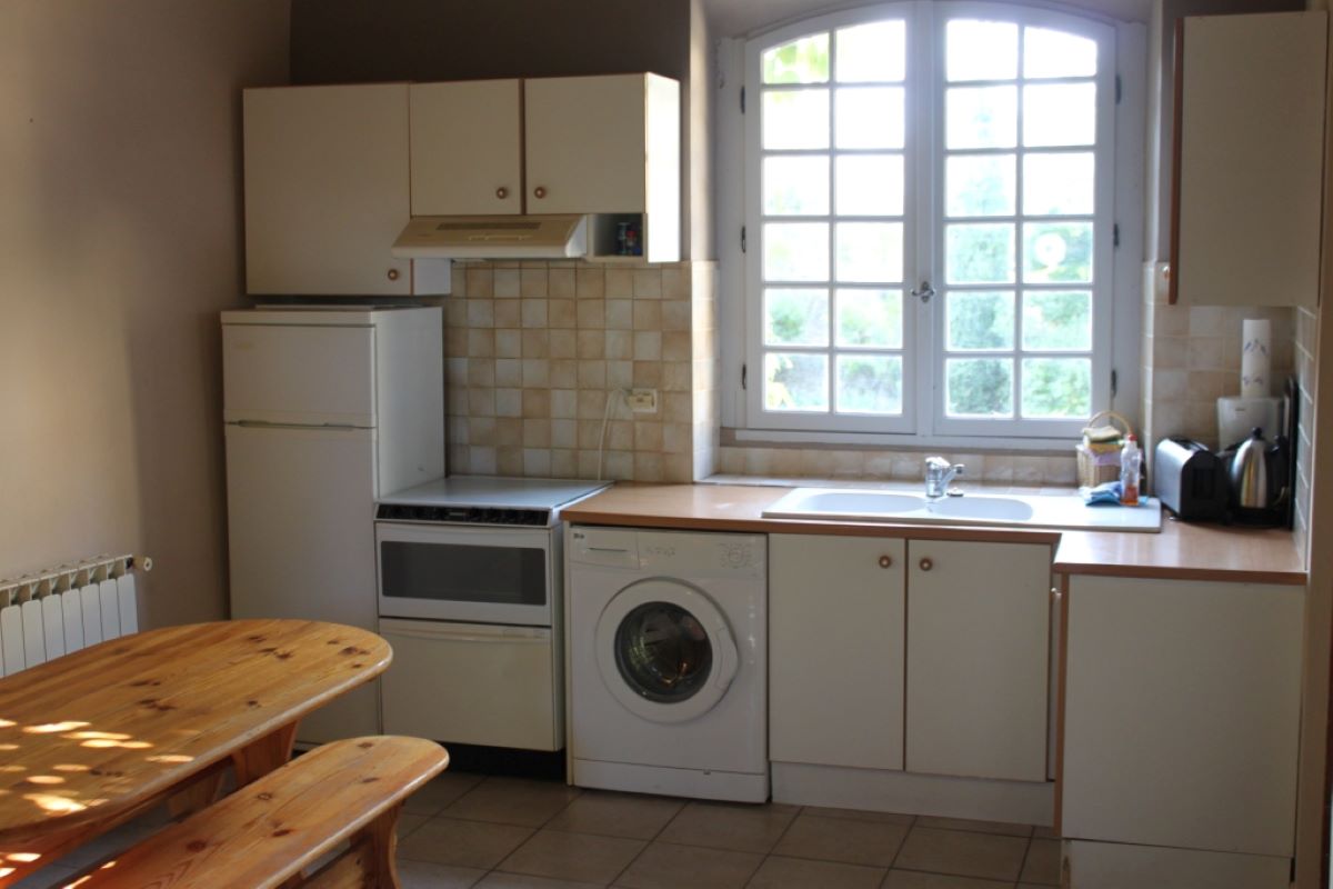 De keuken is uitgerust met een koelkast met vriesvak, gaskookplaat met vaatwassercombi, wasmachine en een apart toilet.