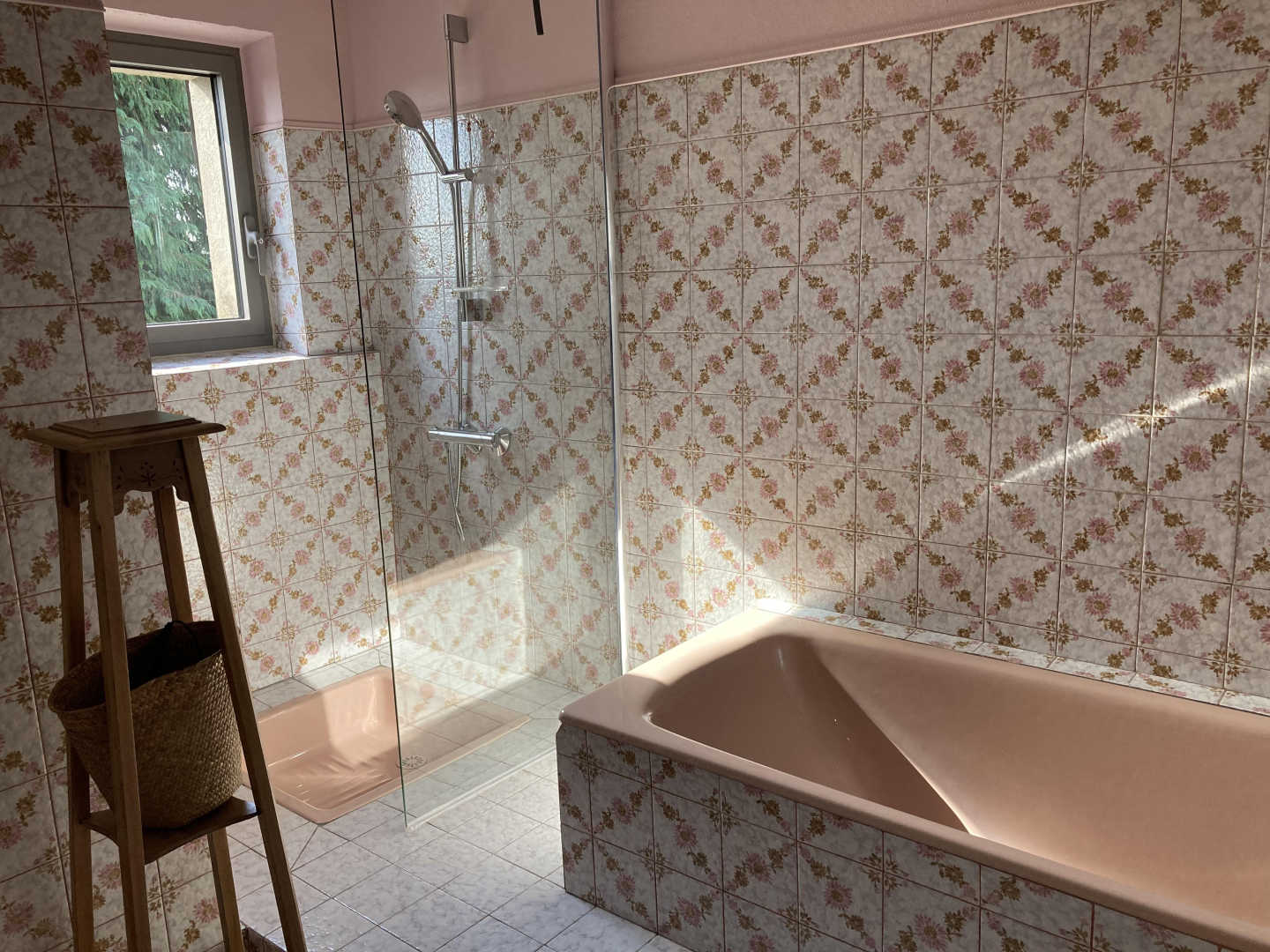 – grande salle de bain avec baignoire et douche, sèche-cheveux