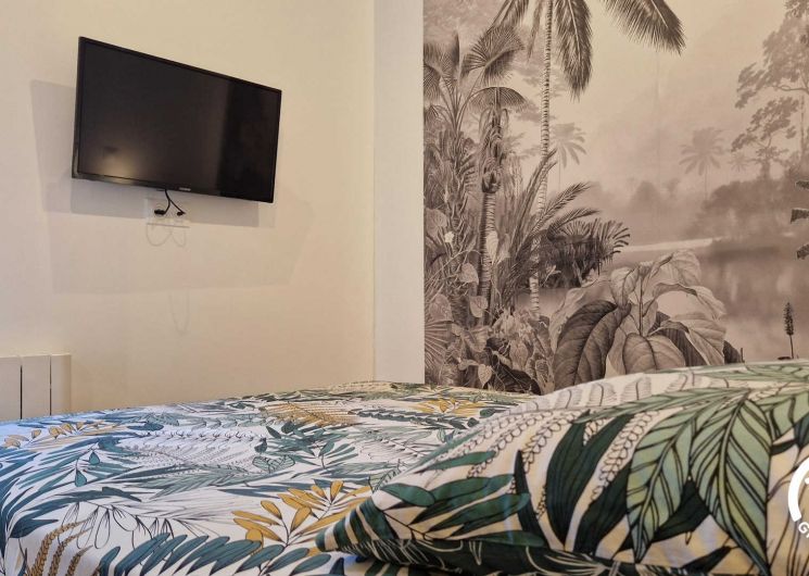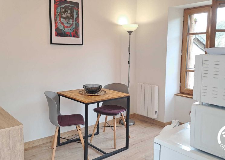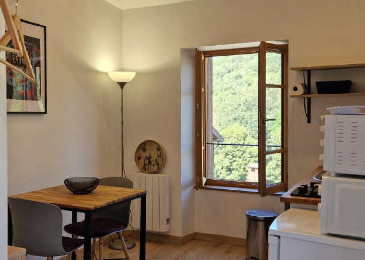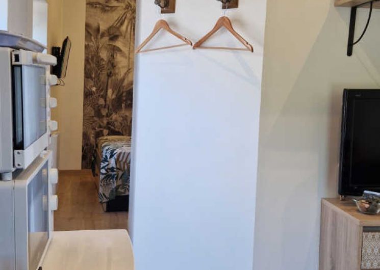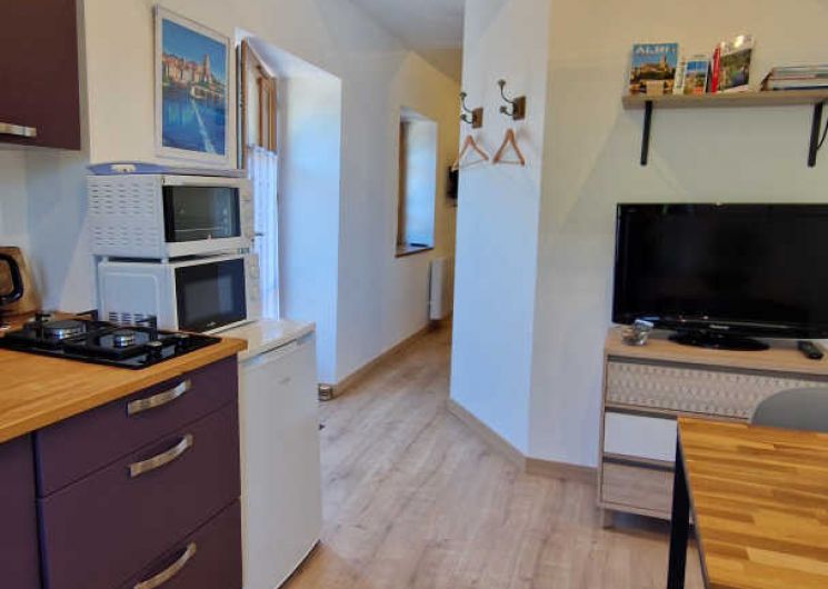 – Séjour avec cuisine, table à manger pour 2 personnes et TV. Cuisine équipée d’une plaque double feu, frigo top, micro-ondes, mini-four, bouilloire, cafetières à filtre et à dosettes, et grille-pain.