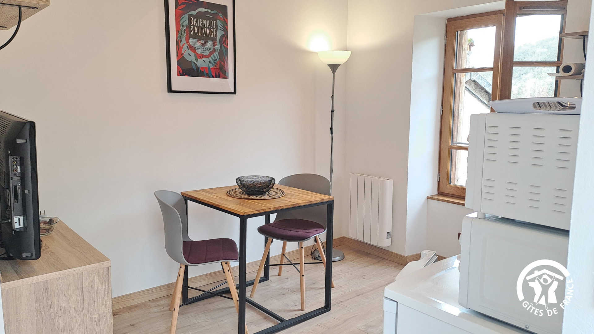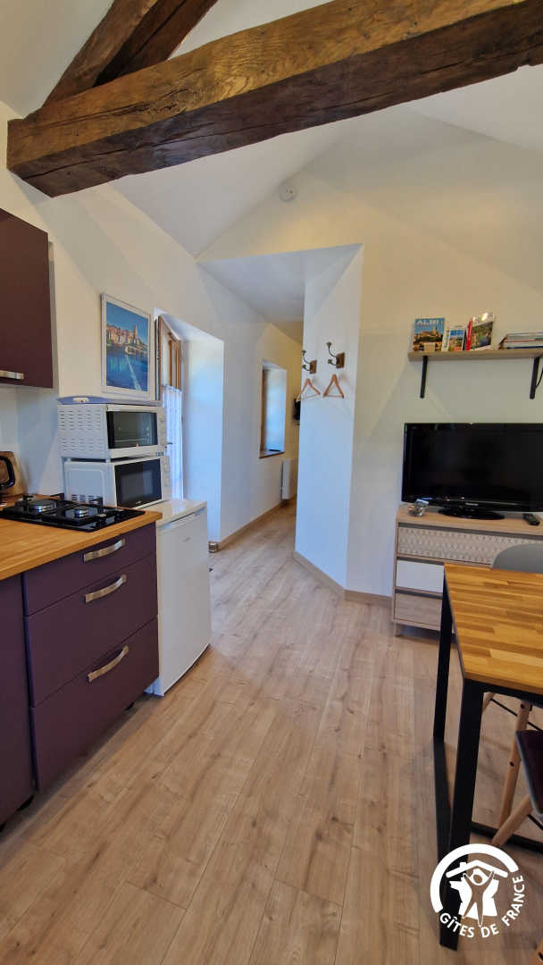 – Séjour avec cuisine, table à manger pour 2 personnes et TV. Cuisine équipée d’une plaque double feu, frigo top, micro-ondes, mini-four, bouilloire, cafetières à filtre et à dosettes, et grille-pain.