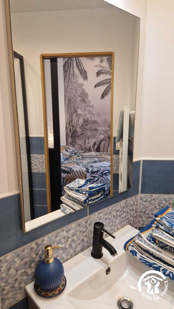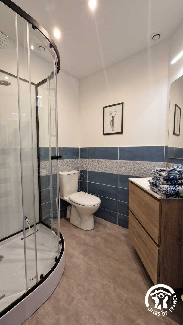 – Salle d’eau attenante à l’espace nuit avec douche, vasque, sèche-serviette électrique et WC.