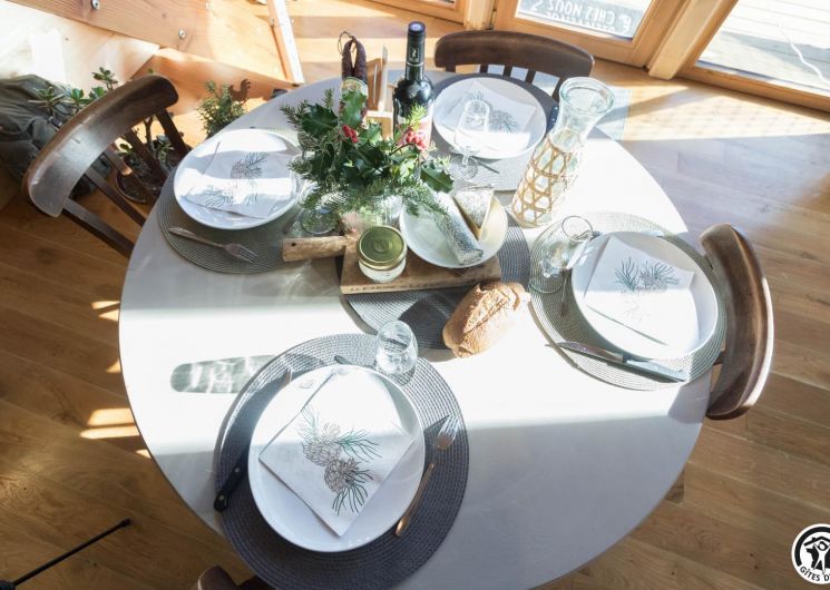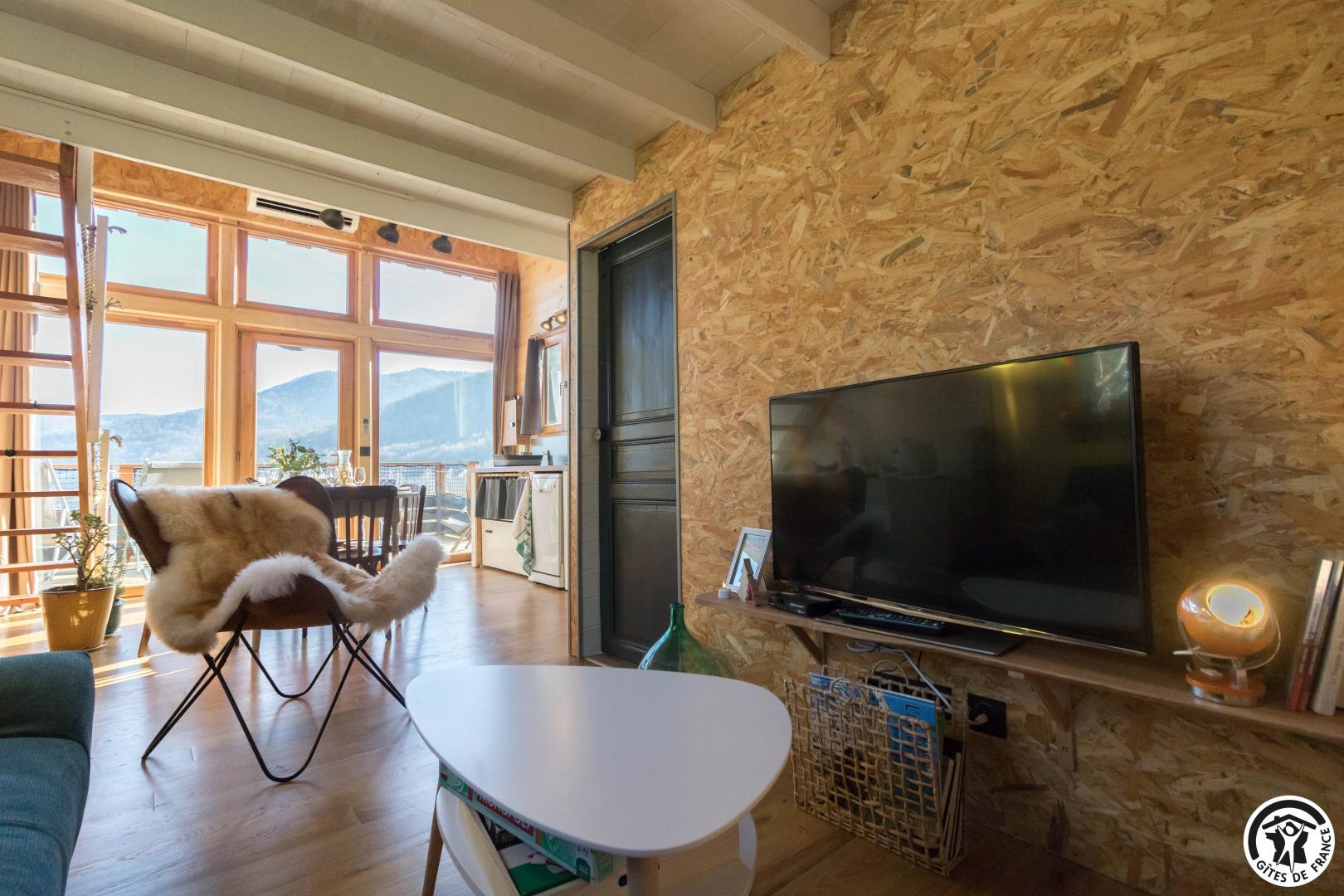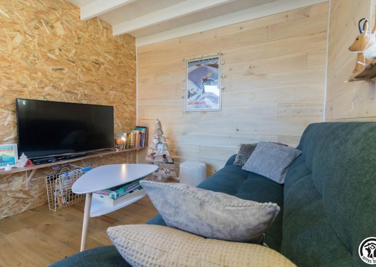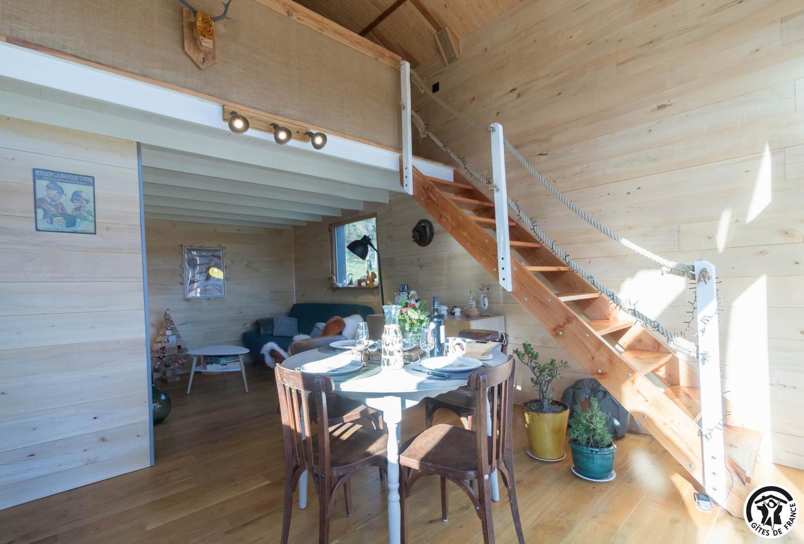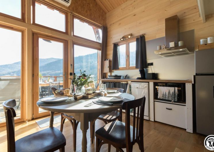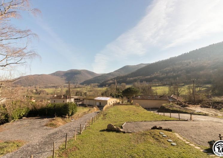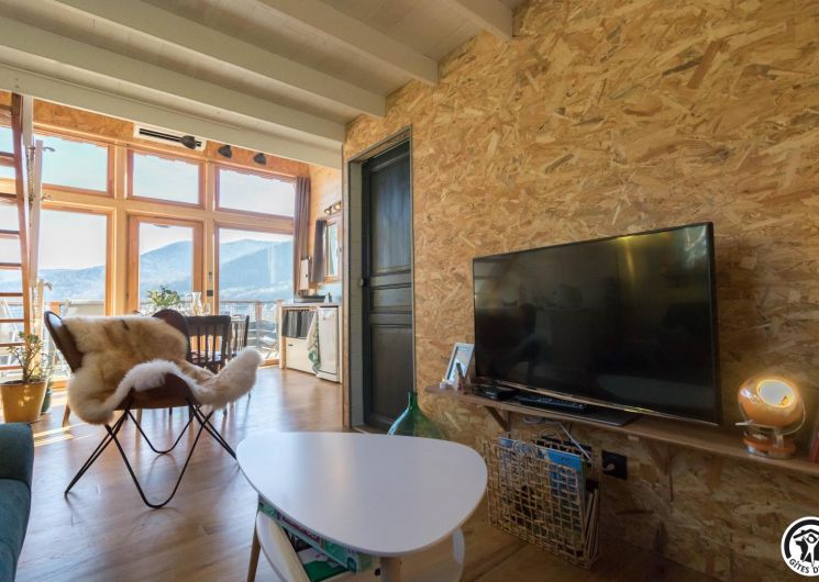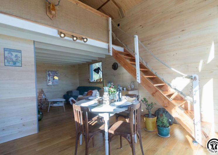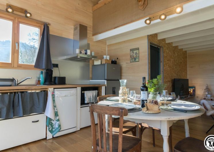After climbing the entrance stairs, you have access to a south-facing terrace, and inside, on the first level: a dining area, a fitted kitchen, a living room and a shower room/WC; and on the second level, a mezzanine sleeping area with 2 double beds (140*190cm). There is no washing machine in the gîte, but the owners will be happy to wash your clothes. The outside area is fenced, and there is also parking on the property, a boules pitch and a shed to protect your bikes and skis.