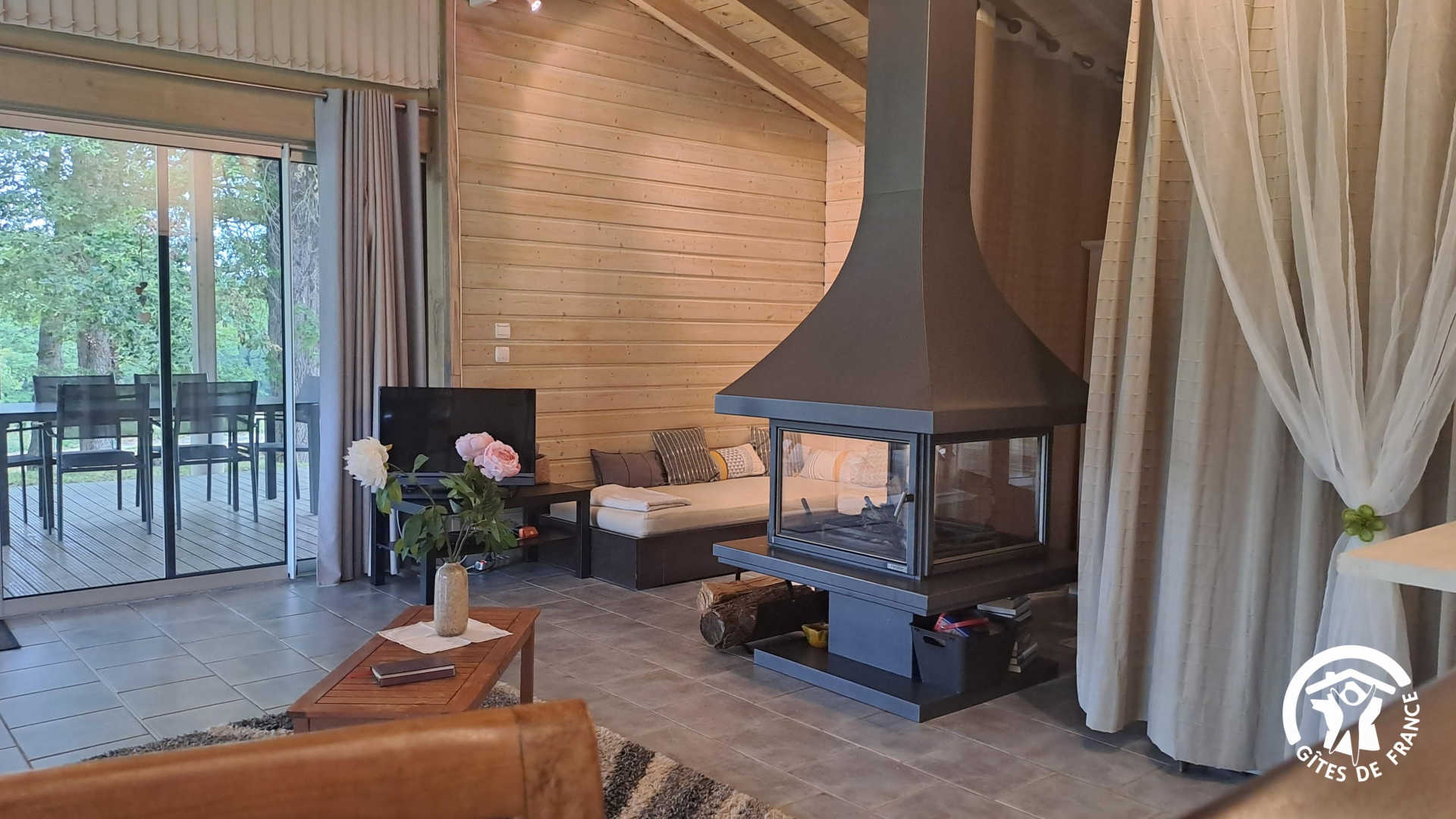 Intérieur : pièce à vivre unique avec cheminée centrale, coin cuisine, coin salon avec TV + lecteur DVD, lecteur CD et radio