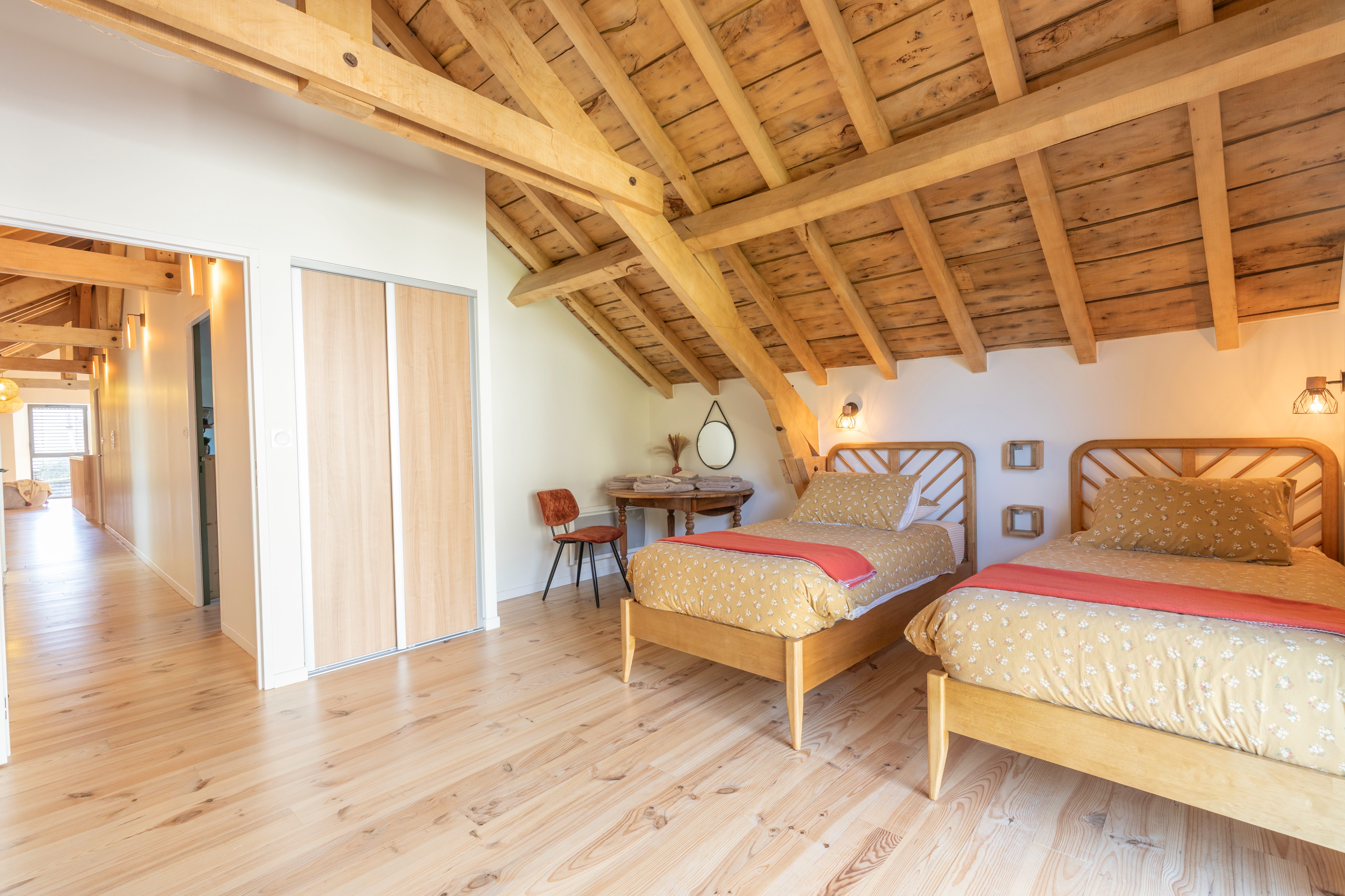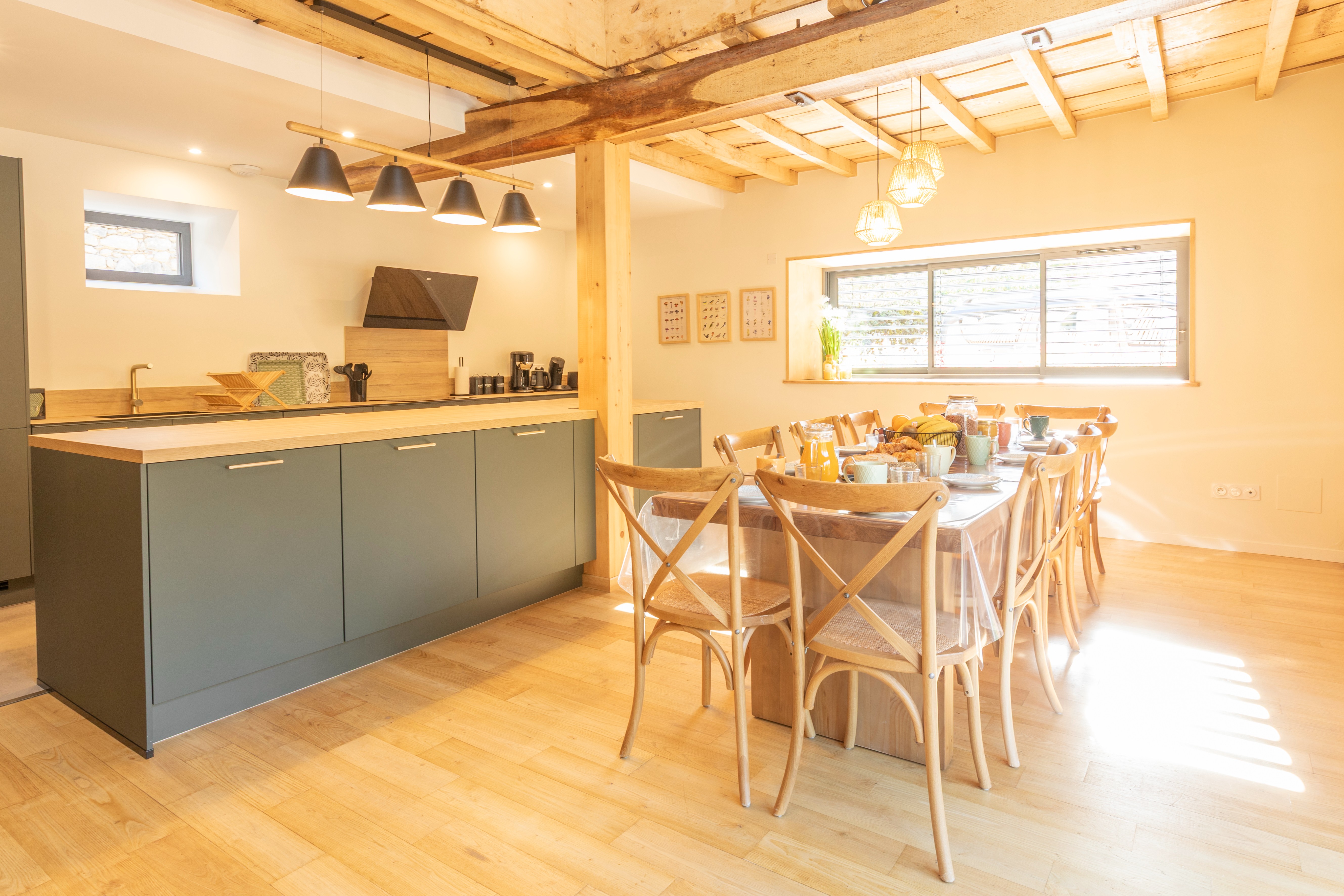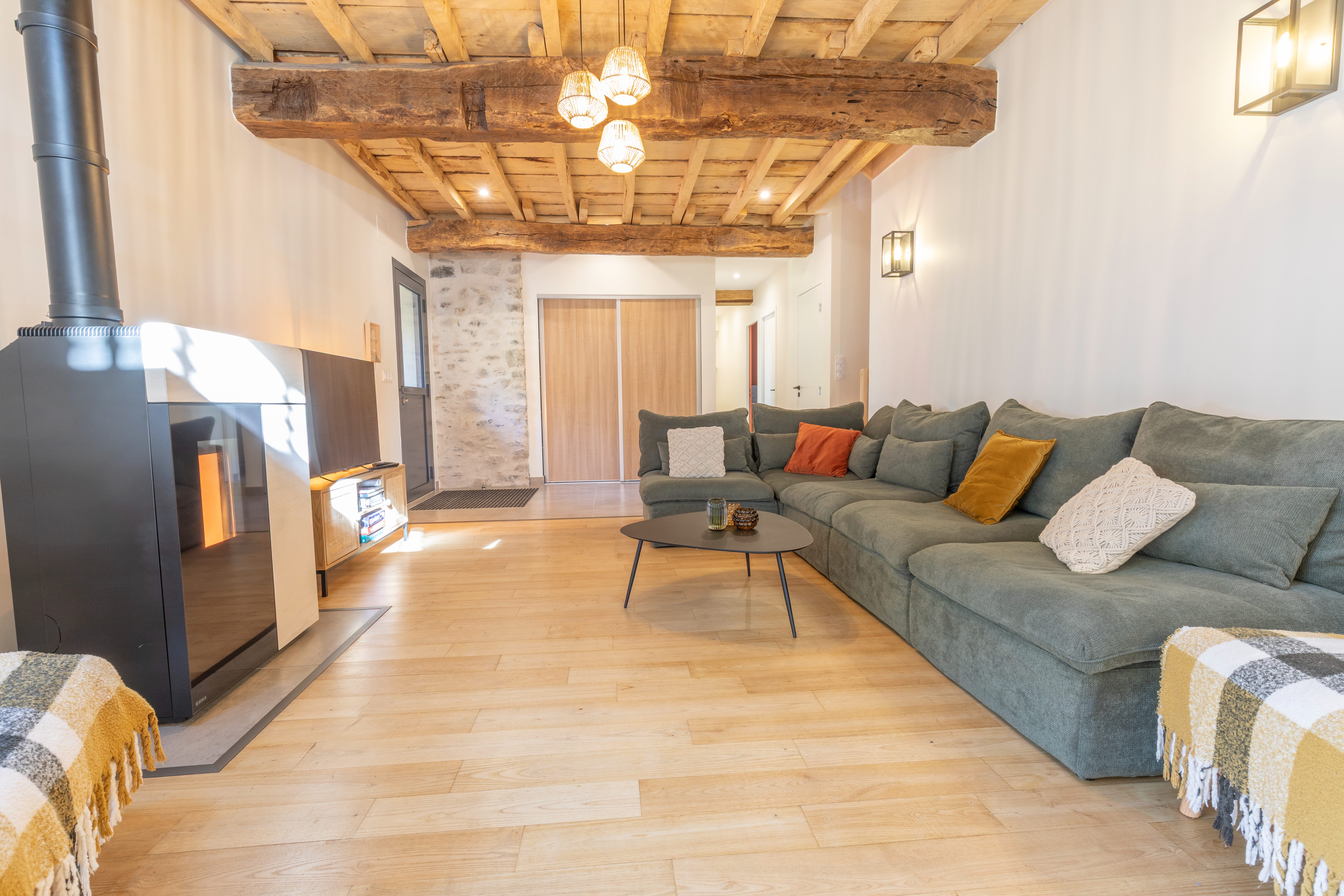 Grange rénovée de 210m² avec goût, comprenant : Au rez-de-chaussée : Cuisine ouverte sur séjour et salle à manger avec buanderie, un spacieux salon avec un poêle à granulés , une chambre avec un lit en 160 (lit séparable en deux lits simples sur demande), un local à skis/vélos, une salle d’eau (douche) et un WC séparé. À l’étage : deux chambres avec un lit en 160 (lit séparable en deux lits simples sur demande) dans chacune, un dortoir avec 4 lits simples, une salle d’eau (douche), un WC séparé et un grand espace jeux avec une TV (sans chaînes) pour y connecter consoles ou applications. Linge de lit et de toilette fourni, lits faits à l’arrivée. Un espace extérieur avec salon de jardin et barbecue un parking privé. Ancienne dépendance de la maison principale des propriétaires également éleveurs sont juste à côté. N’hésitez pas à demander conseil