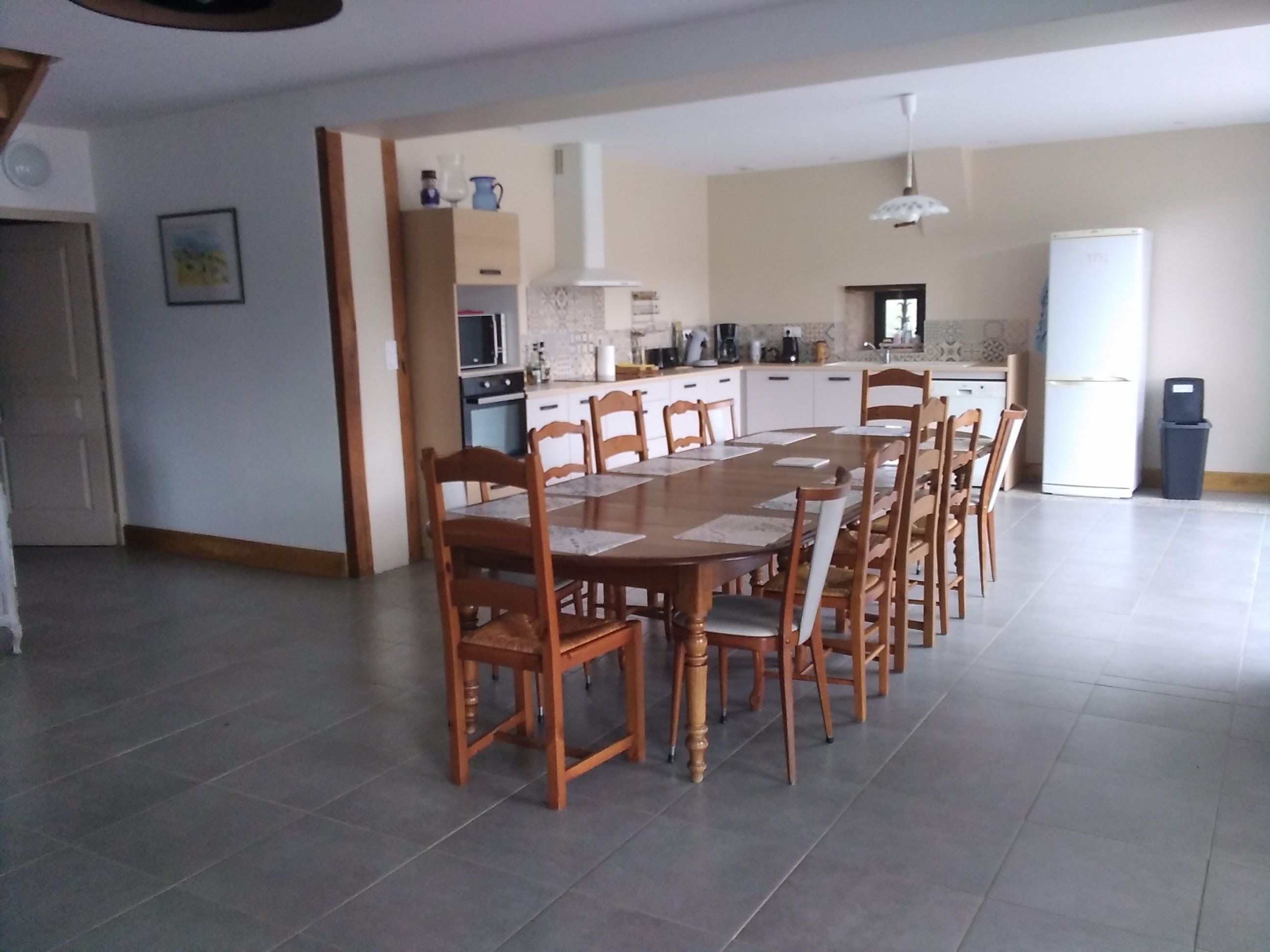 Ground floor: large living room with lounge (3 sofas, 3 armchairs, coffee table, TV, wood-burning stove), fitted kitchen (dishwasher, microwave, freezer, fridge, oven).