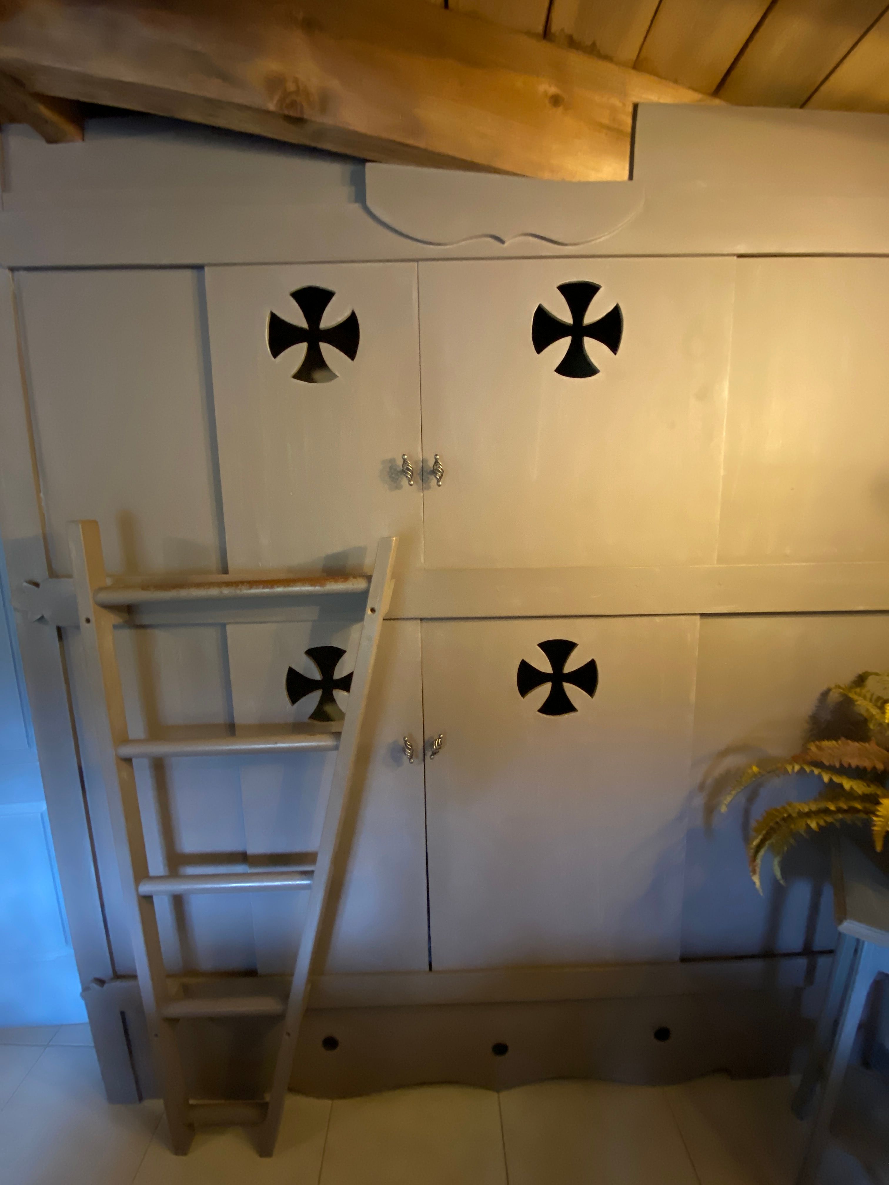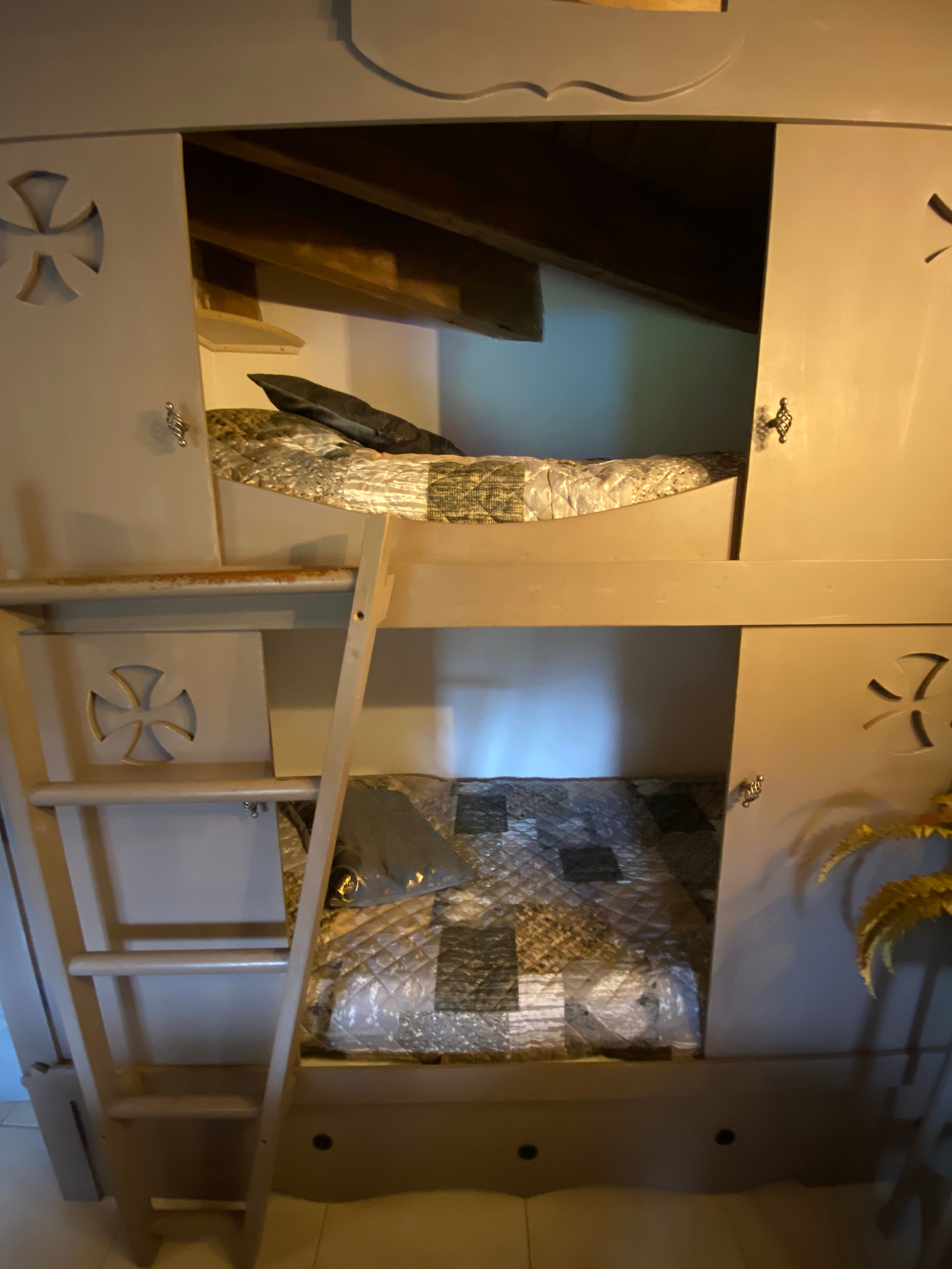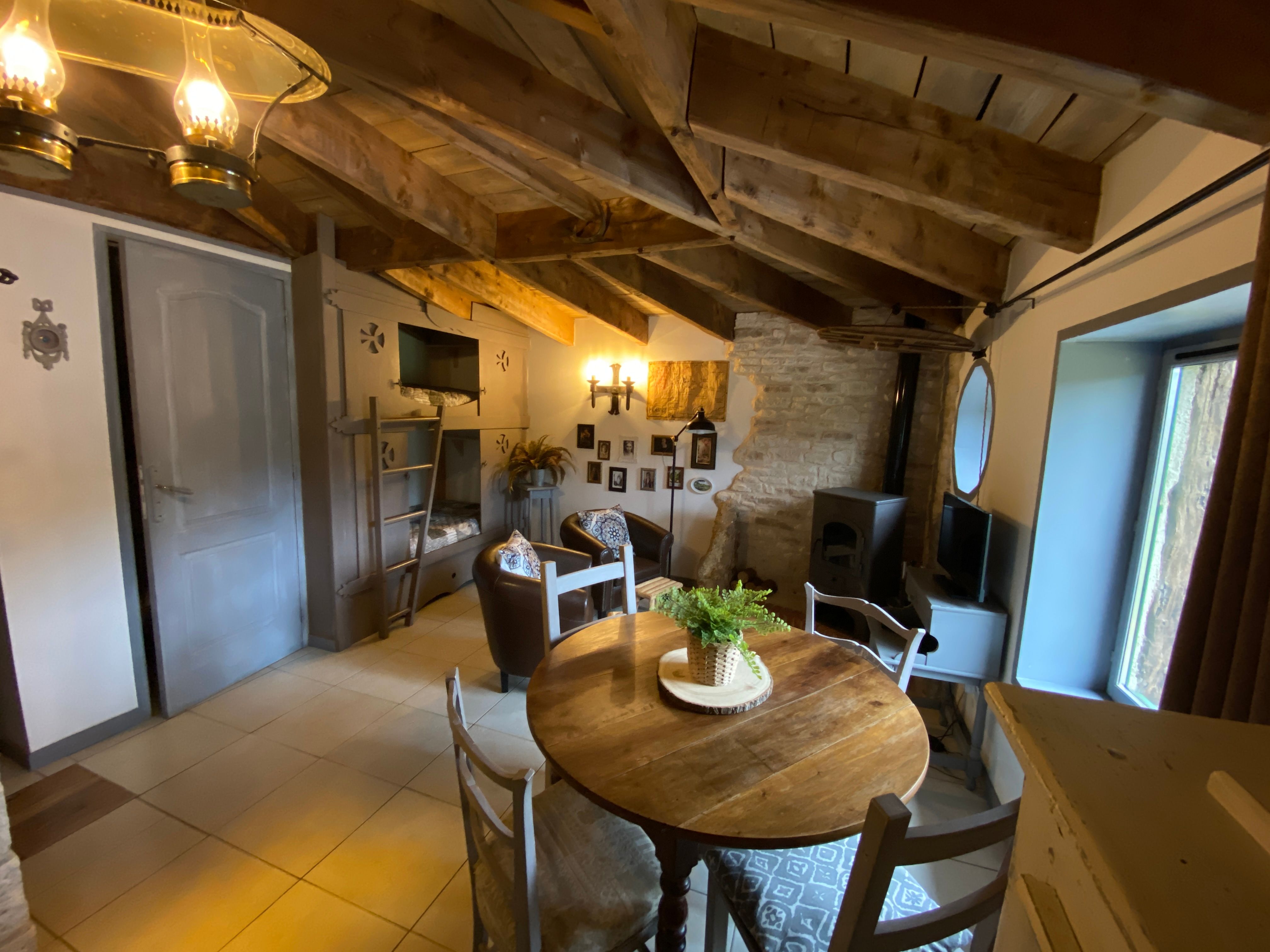 The accommodation comprises a living room with fitted kitchen (microwave, dishwasher, gas cooker, fridge), dining area (table with chairs), TV). 1 bedroom (1 x 140cm bed), 1 bedroom (2 x 0.90cm bunk beds), 1 shower room and separate WC. Wooden terrace with garden furniture and electric grill, private above-ground swimming pool.