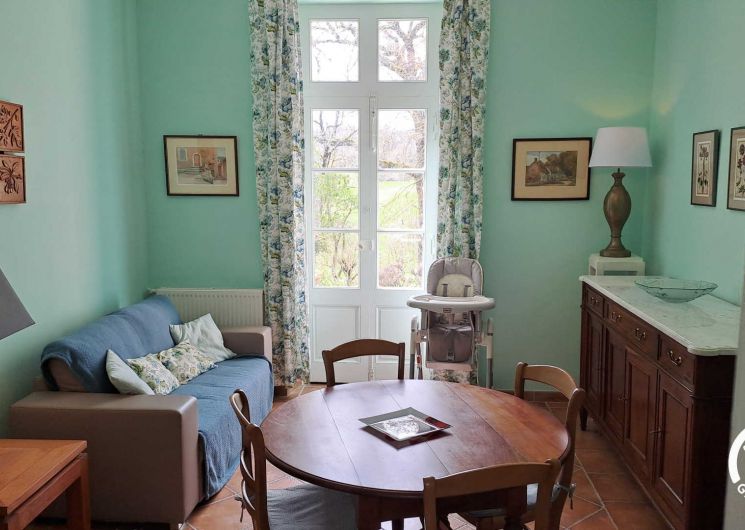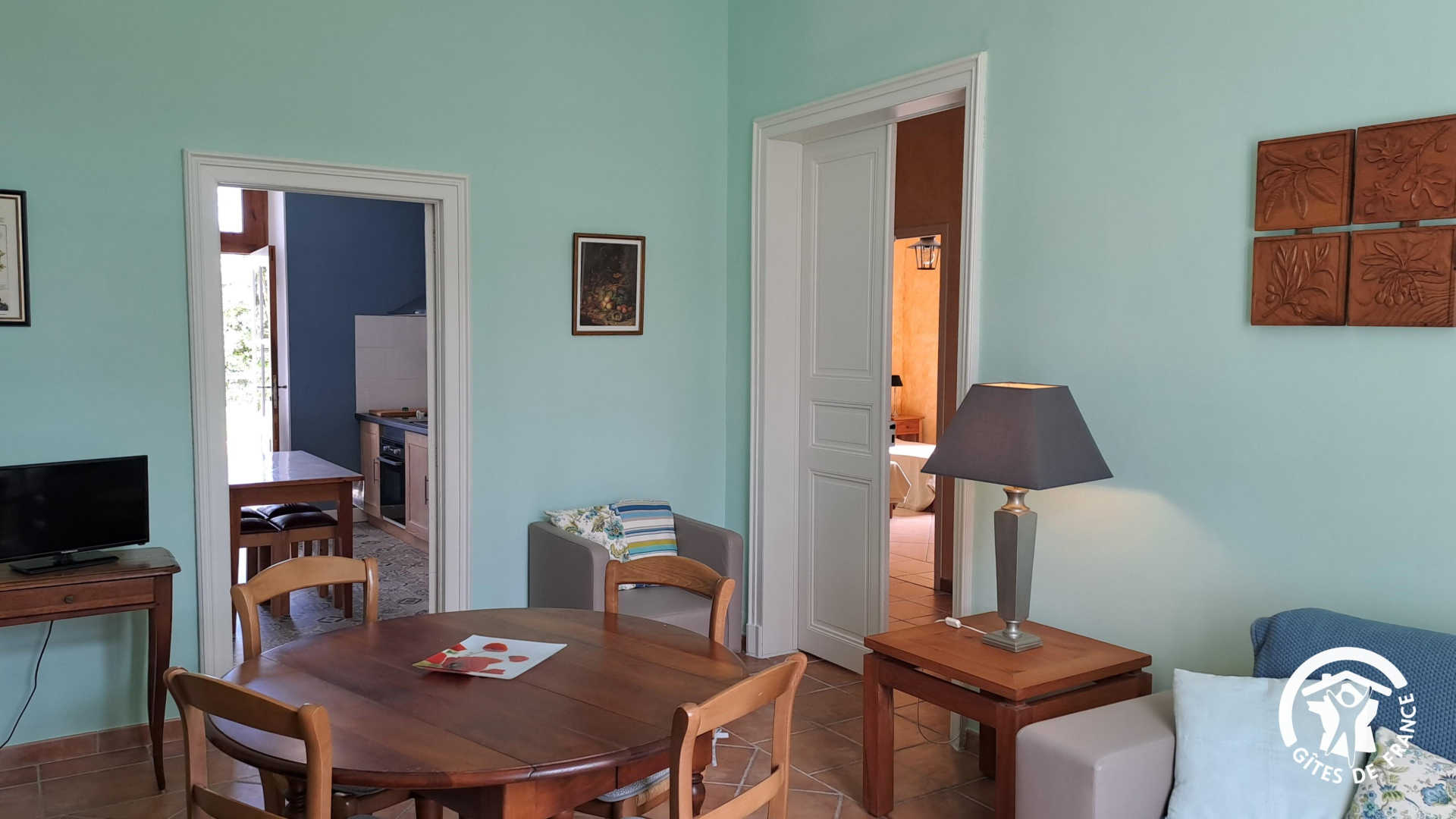 – séjour avec salon et table à manger, TV et livres. Le séjour donne sur une terrasse