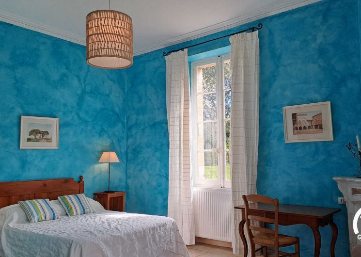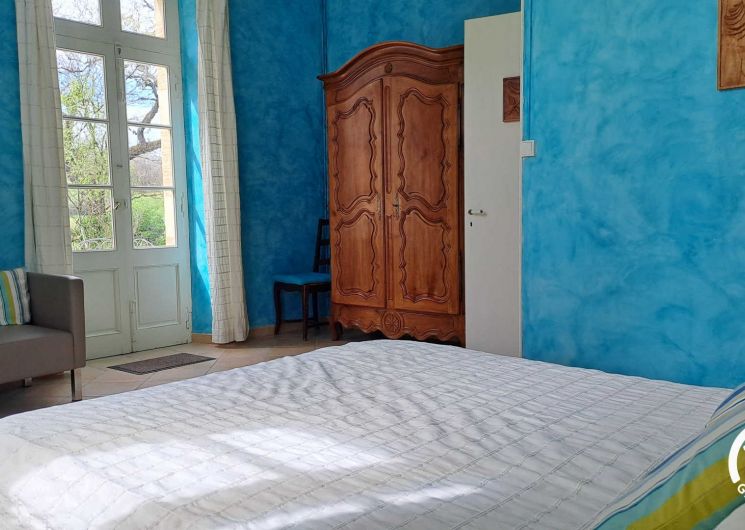 – chambre bleue avec lit double en 140x190cm, bureau et armoire