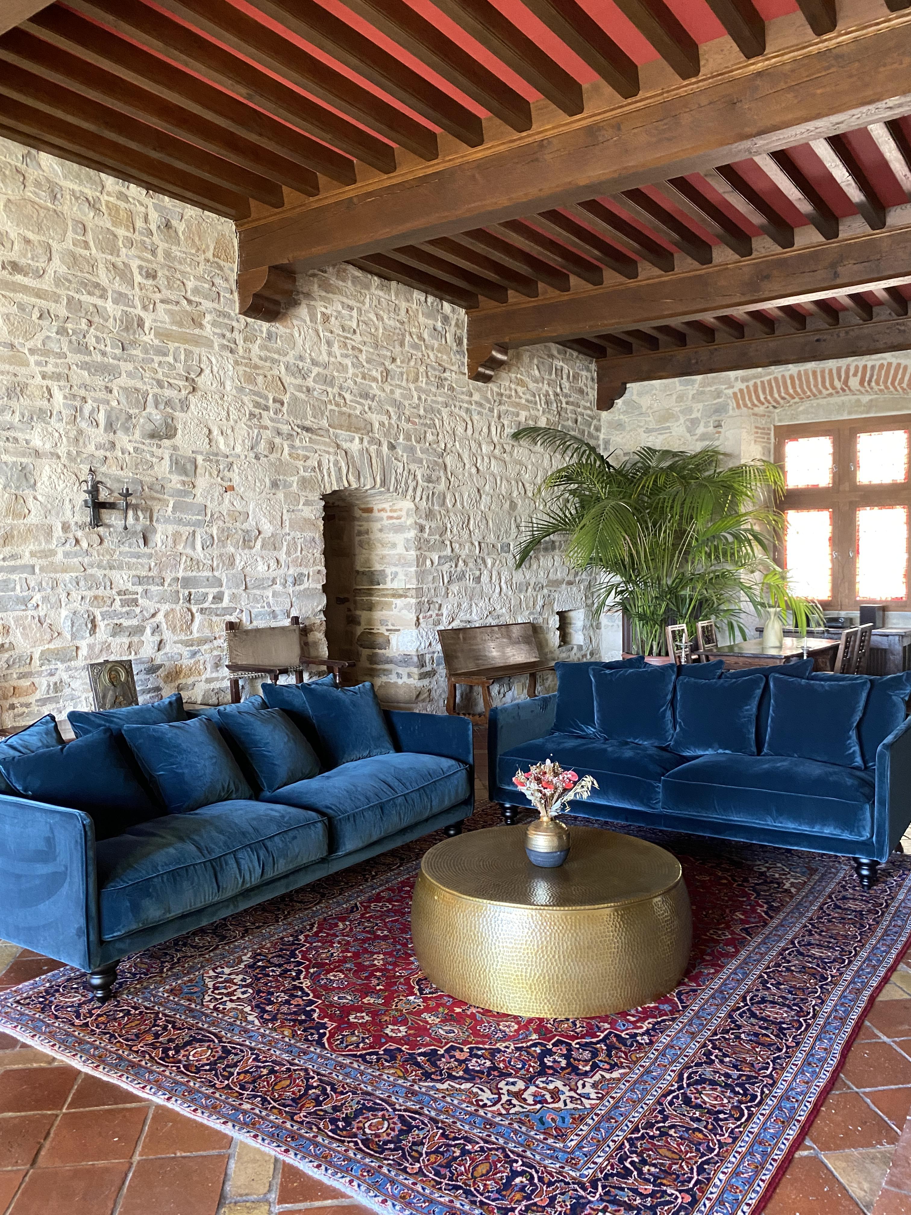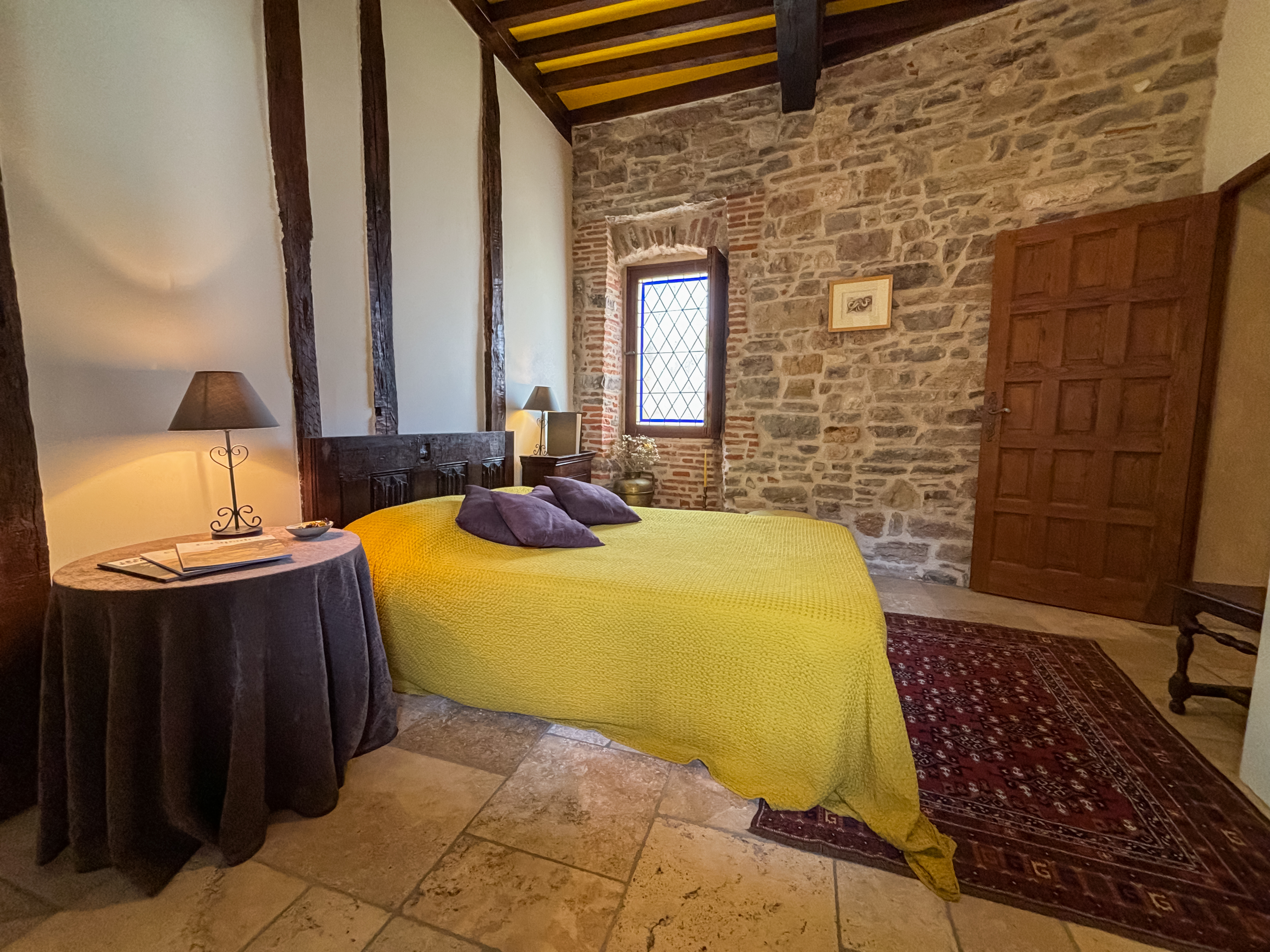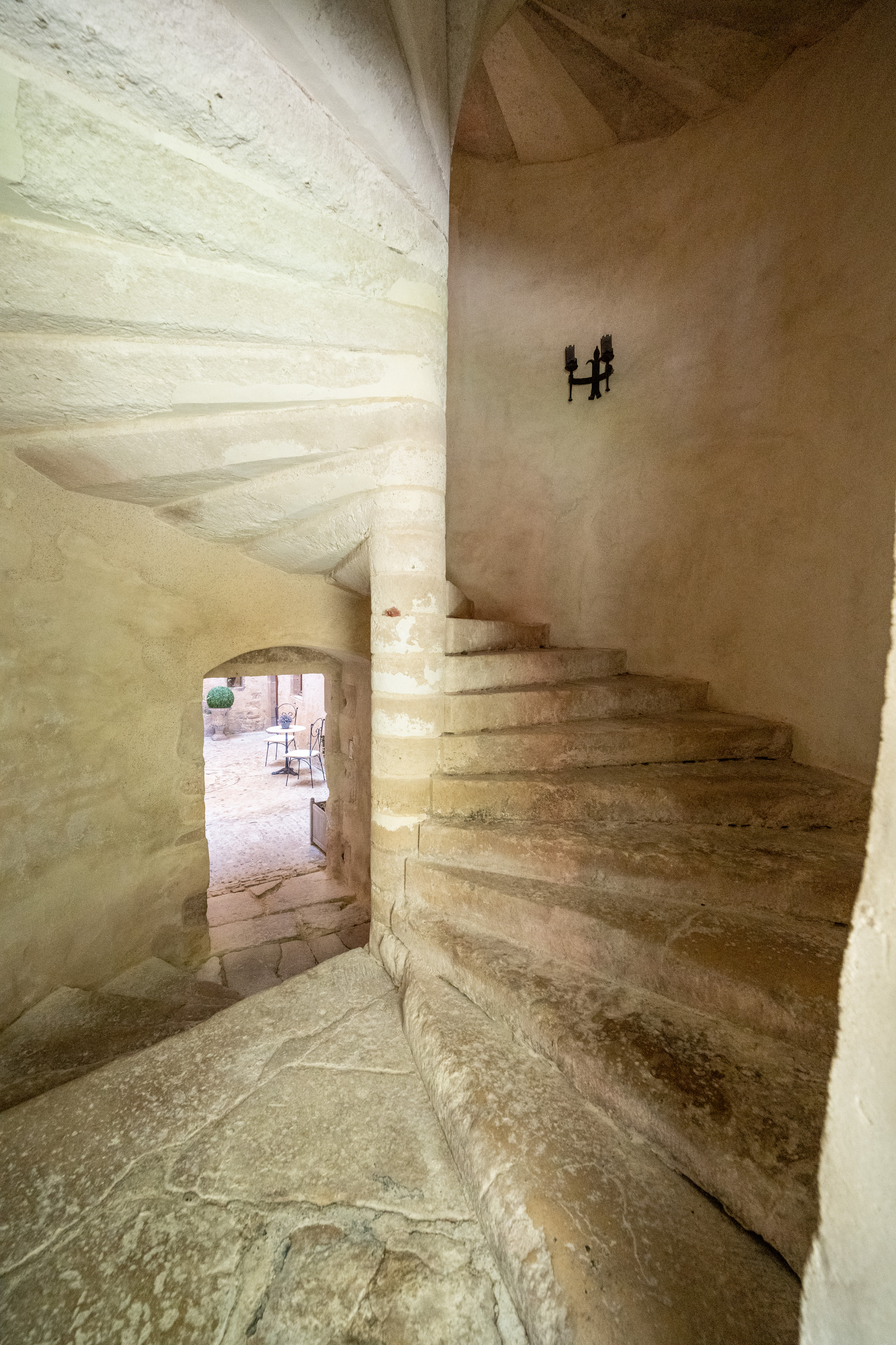 The five bedrooms open onto an interior patio with double passageways, served by a grand 15th-century spiral staircase.