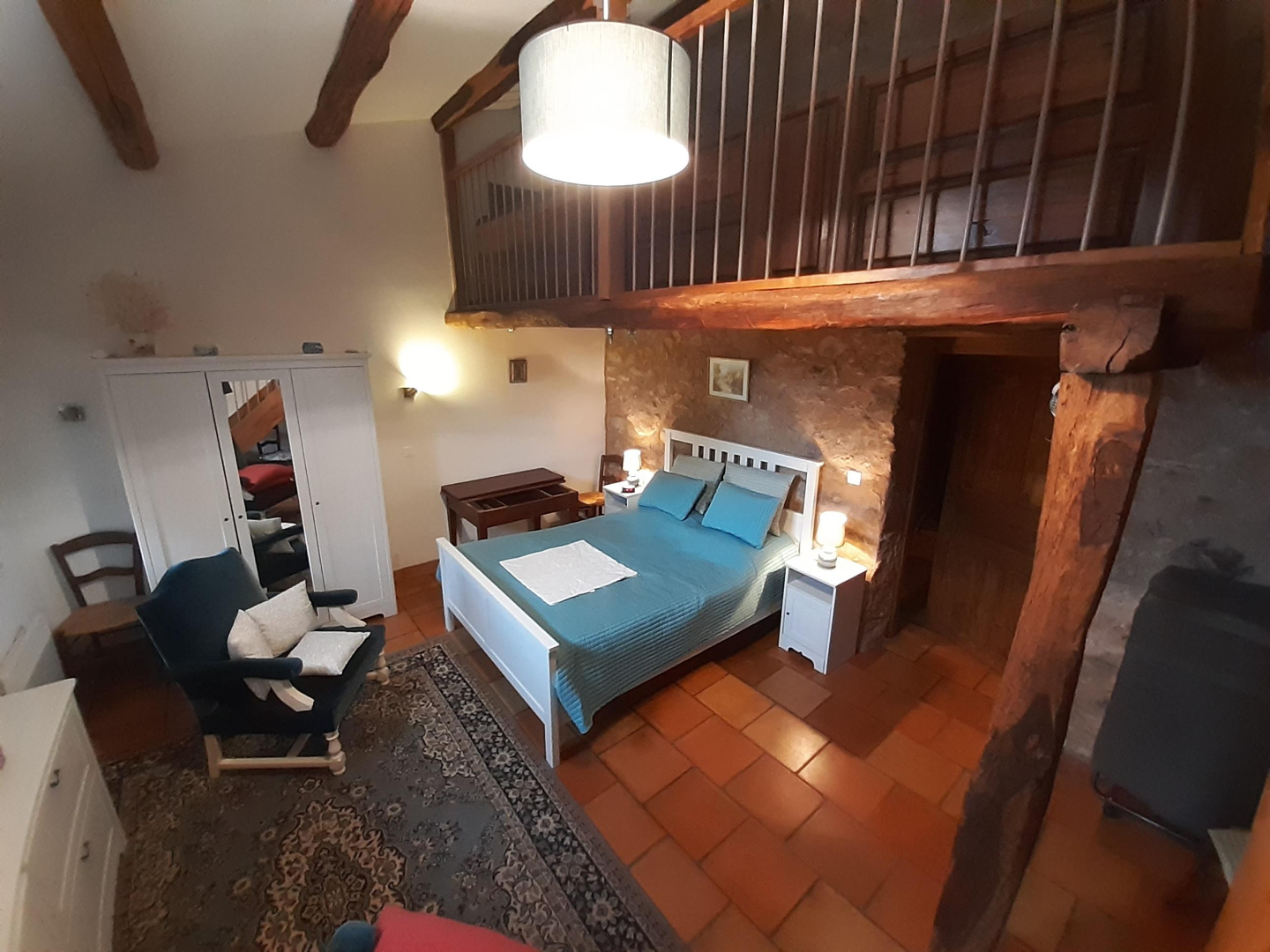 Rez-de-chaussée : pièce à vivre avec coin salon (cheminée), cuisine ouverte toute équipée, chambre (un lit double en 140) salle d’eau, wc.