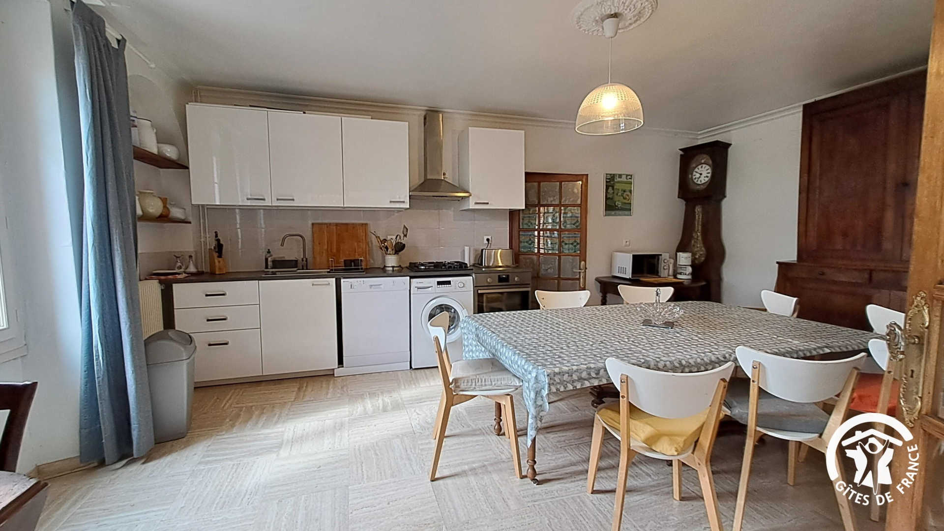 – une cuisine lumineuse avec table pour 10 personnes + table d’appoint, réfrigérateur (compartiment congélation), évier, quatre feux, fours (micro-ondes, convection et grill) et du petit électroménager (grille-pain, cafetière, théière électrique…), un lave-linge et un lave-vaisselle