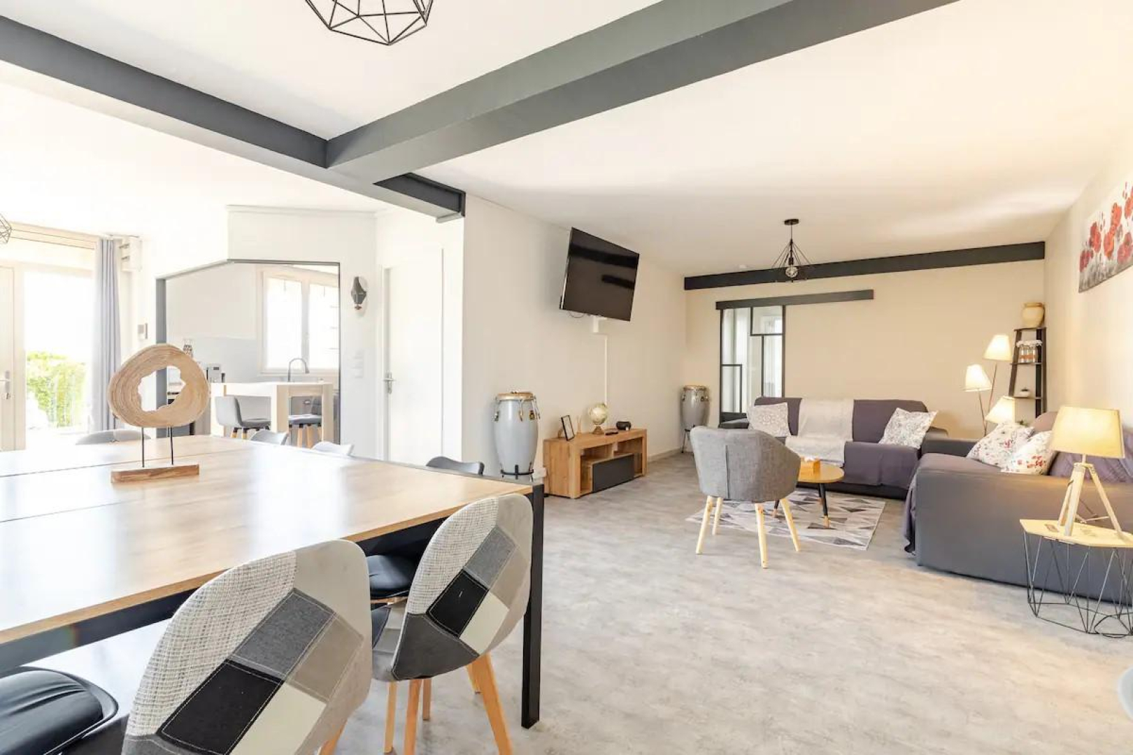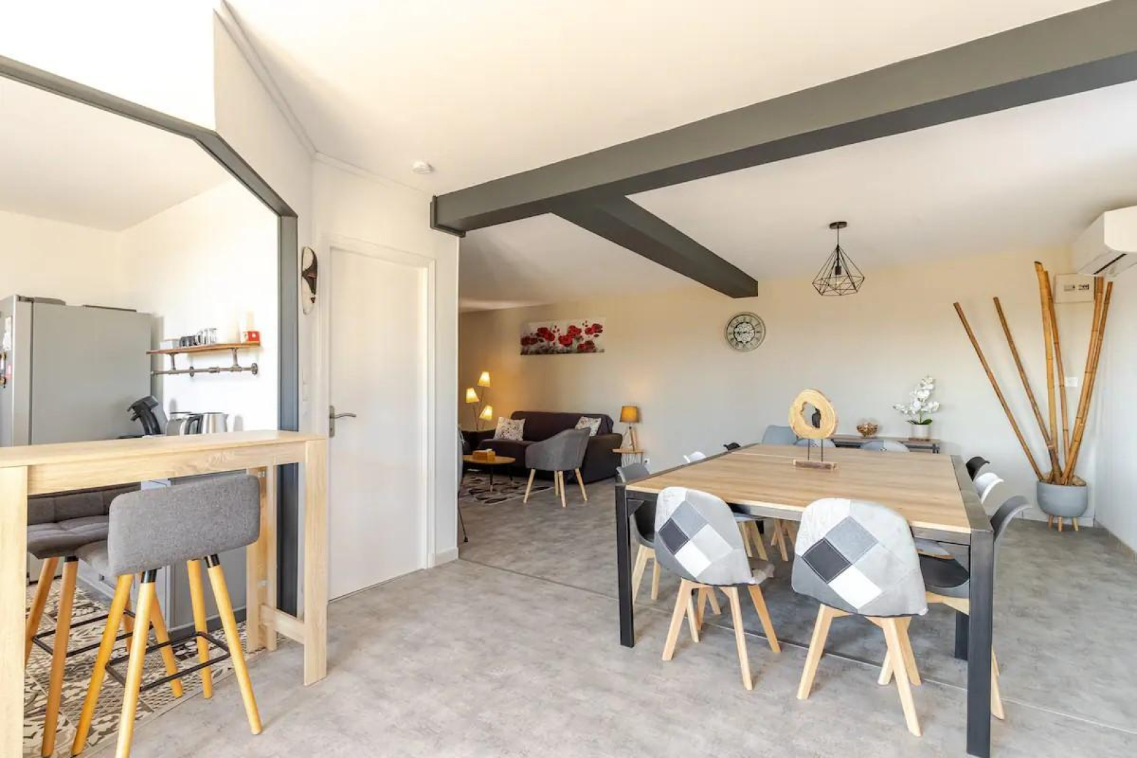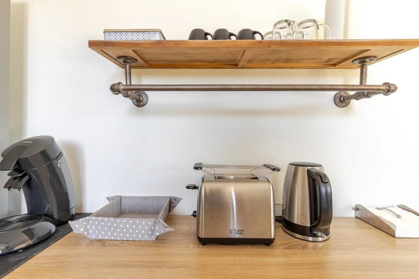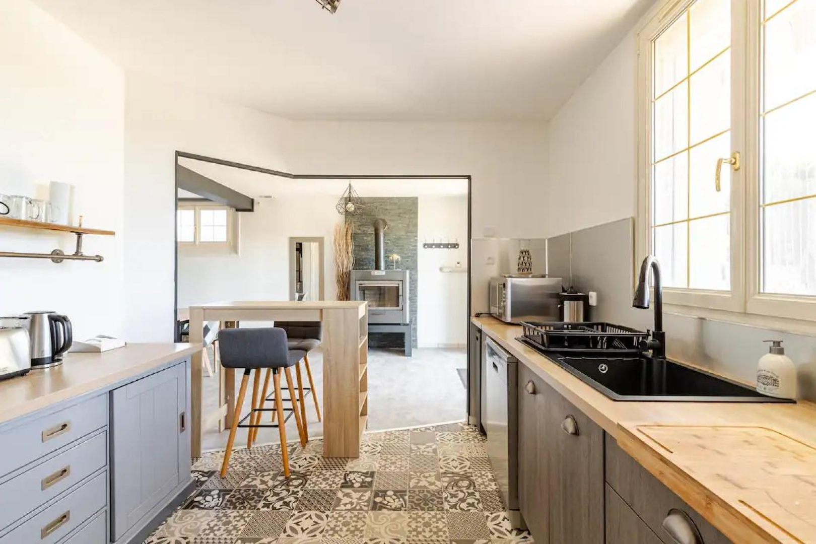 – Grande pièce de vie avec coin cuisine équipée : lave-vaisselle, réfrigérateur américain, micro-ondes, four, bouilloire, grille-pain, cafetière Senseo et à piston… Plancha, raclette et fondue disponibles sur demande.