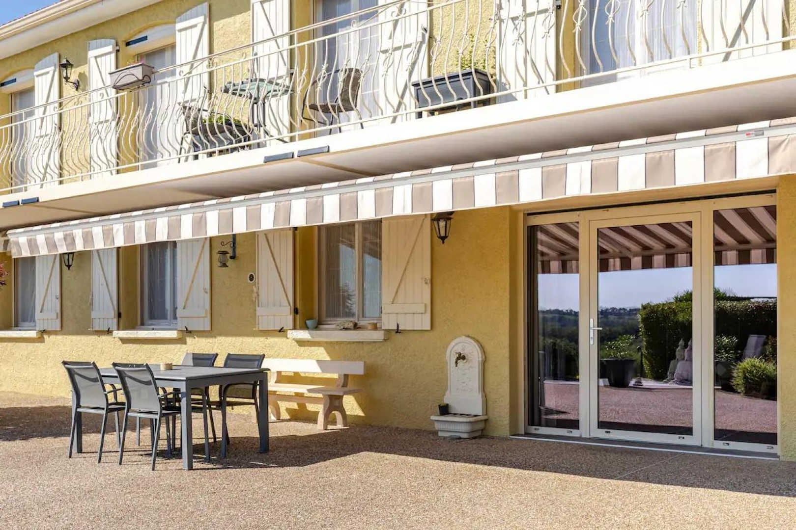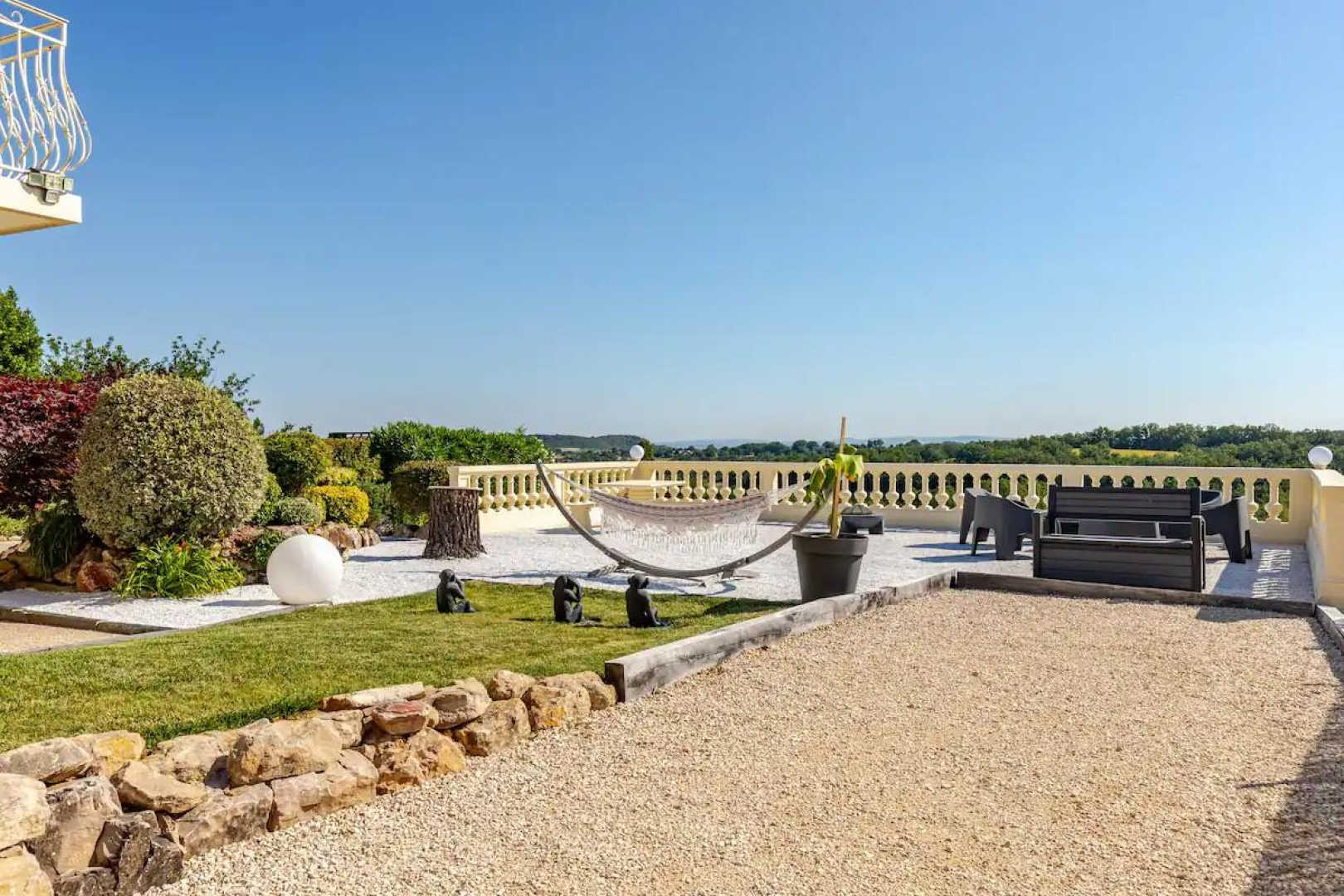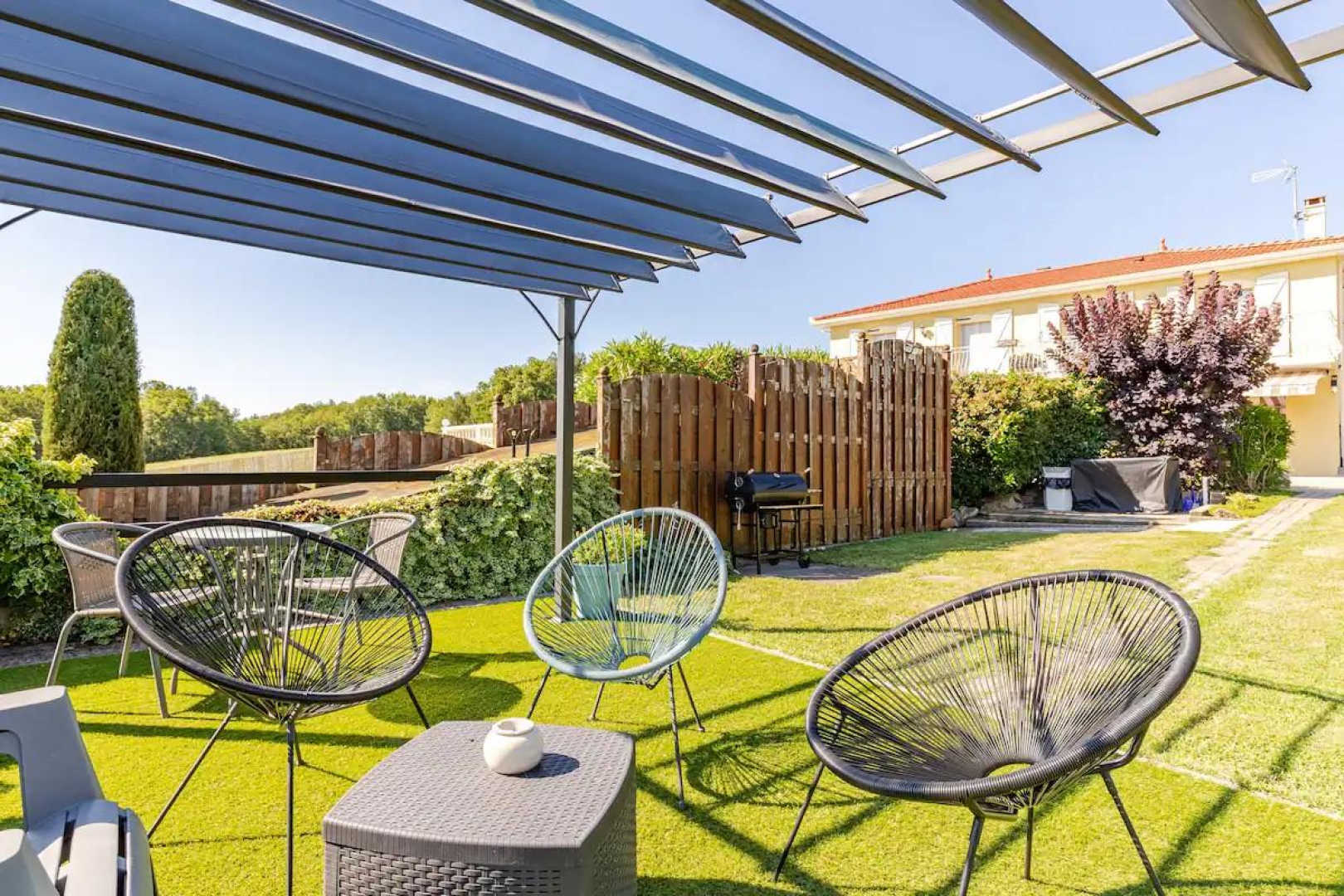 Juste devant le séjour, une terrasse couverte pour vos repas. Une caméra vidéosurveillance dans l’angle permet l’ouverture du portail. Accès à l’ensemble de l’extérieur, entièrement clôturé. Terrain de pétanque avec boules à disposition.