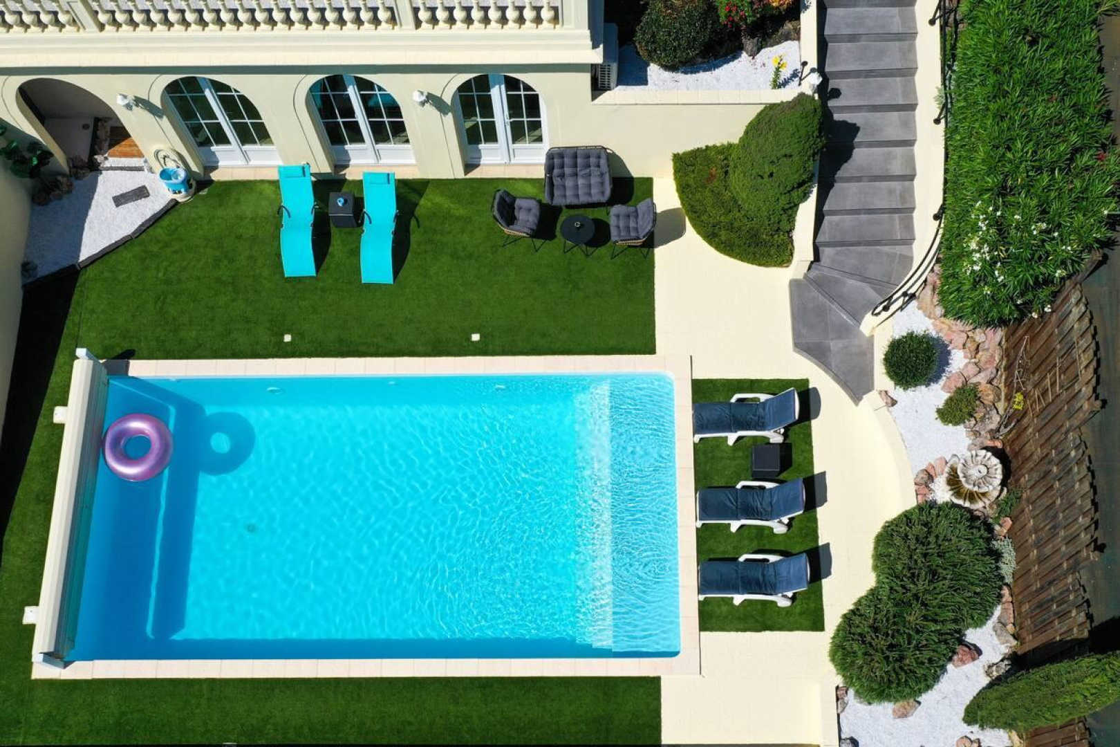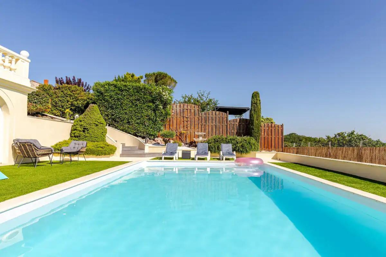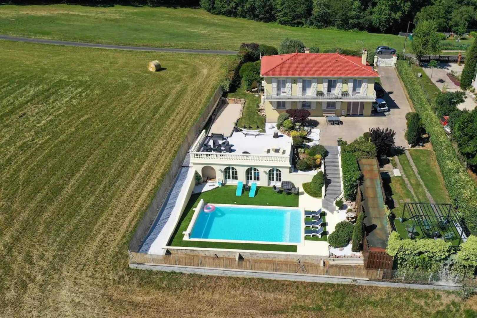 Juste devant le séjour, une terrasse couverte pour vos repas. Une caméra vidéosurveillance dans l’angle permet l’ouverture du portail. Accès à l’ensemble de l’extérieur, entièrement clôturé. Terrain de pétanque avec boules à disposition.