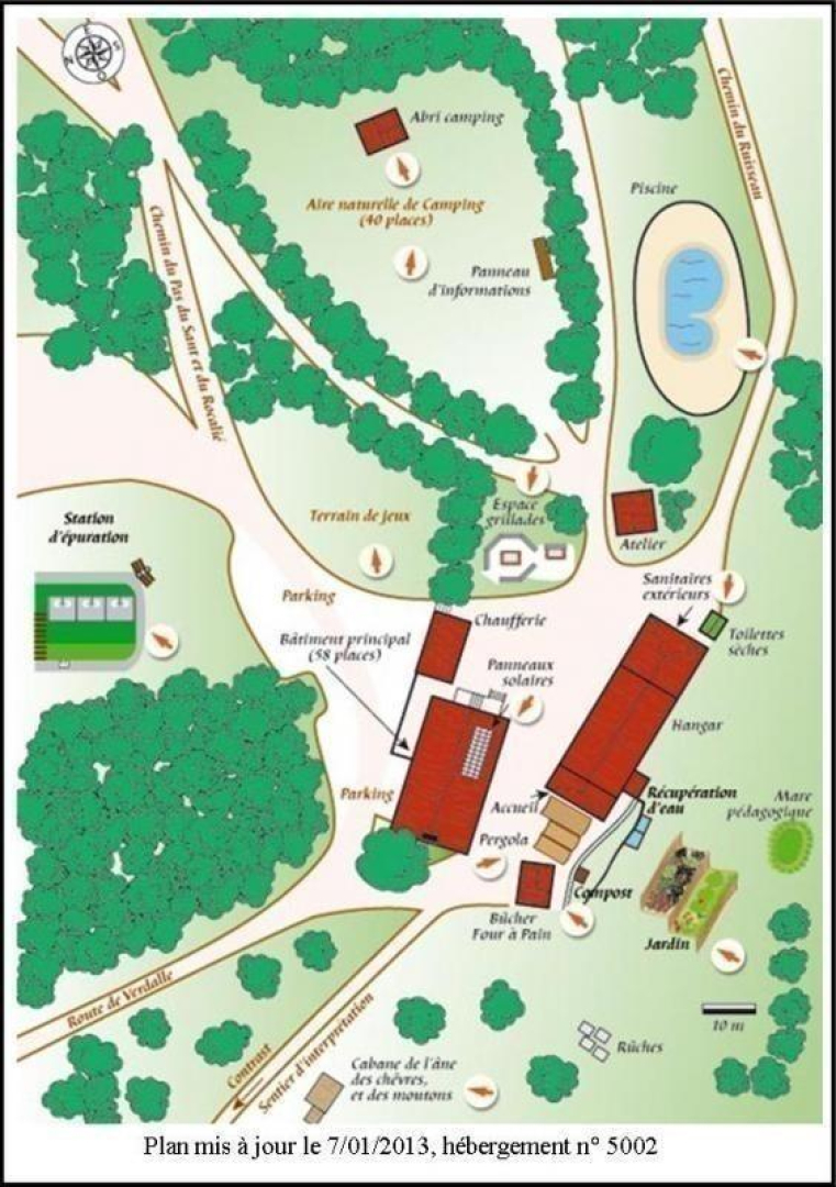 A former crop-sharers farm, thoroughly renovated, La Pouzaque is composed of an accommodation construction (the house), a natural camping plot and outbuildings. The house includes 60 accommodations spread over 14 bdrms and small dormitories of 2 to 7 bds, most bunk bds, several washing facilities, two dining-rms, two activities rms, professional kitchen, infirmary, library, games’ rm. In outbuildings : closed 130 sqm games’ hall, unheated (meals, shows), swimming-pool in July-August, baker’s oven, equipped fire area (grill corner and camp-fire corner), pedagogic garden, animal park(donkey, ewes, goats), interpretation path…Certified National Education and Ministry of Youth, Sports, and Associative Life. Accommodation for groups of minimum 35 pers. Possibility of bd sheets renting. At the end of a little mountain road, La Pouzaque grants an exceptional natural site, 500 m high, in the heart of the huge woody regions of the Montagne Noire. From the dark spruce forests to the sunlit causse of Contrast, sheltering the remnants of a medieval city, passing by the brook of La Frayssinette and the rocky peak of La Rocalié, the property of La Pouzaque presents very varied surroundings , representing the riches of the Parc Naturel Régional du Haut Languedoc. Enjoying both atlantic and mediterranean influences, la Pouzaque includes a manifold flora. The diversity of environment is also propitious to the fauna that lives there, in full quietness, in the heart of the L.P.O sanctuary (League for the Protection of Birds). Beyond accommodating children and environment classes, la Pouzaque is perfectly suited to accommodating holiday centres, family or friends’ get-togethers, sports groups (hikers, mountain bikers)….