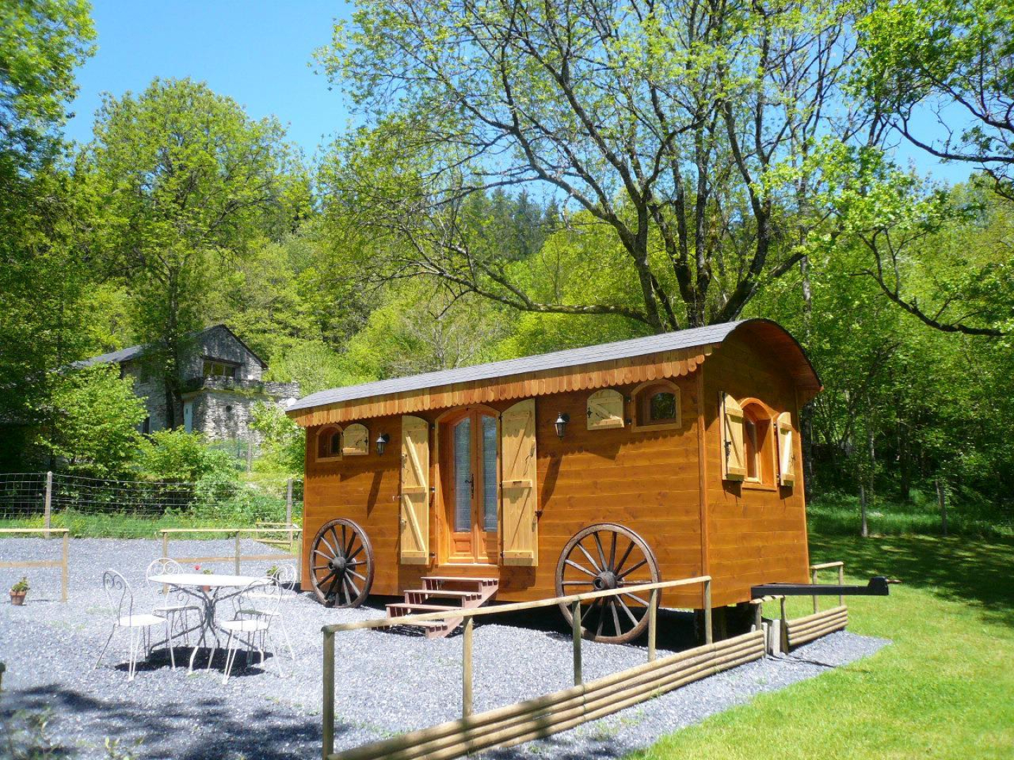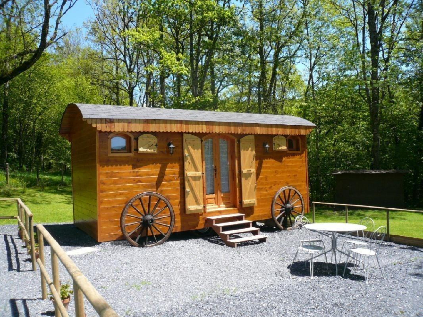 La roulotte champêtre, véritable petite maison en bois, se tient sur le domaine de Vinelle, au milieu d’une clairière. Ne craignez pas d’y être à l’étroit car elle est spacieuse et très confortable.