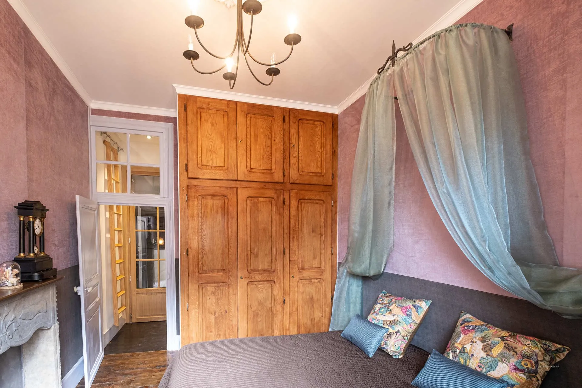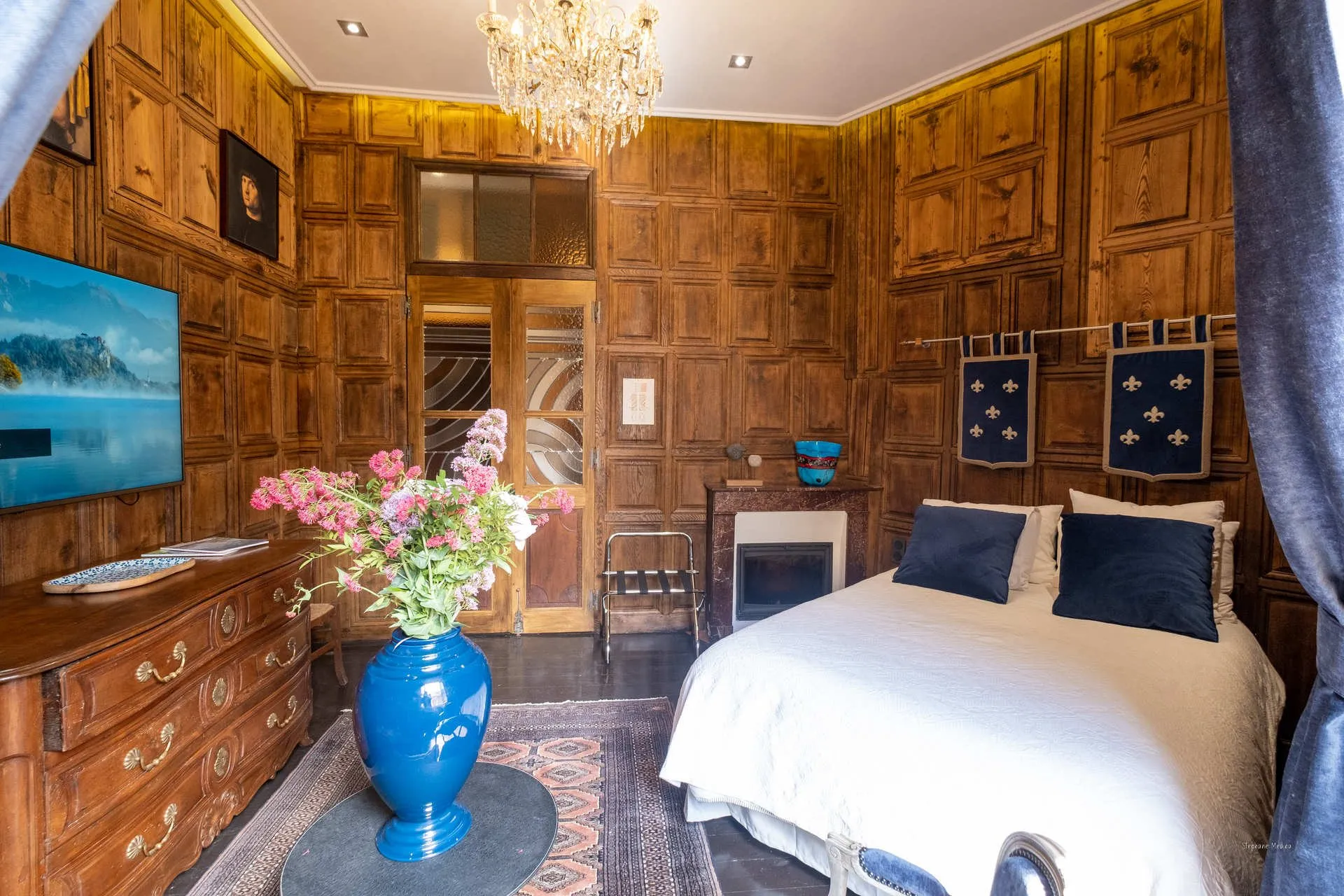 Dotée d’un haut plafond mouluré, la chambre est équipée de luminaires mêlant des flasques de cristal à des sources d’éclairage modernes. Les murs sont revêtus de boiseries (caissons dans leur essence d’origine). Les rideaux, la tête de lit et les coussins sont aux couleurs du bleu roi et du fil d’argent… En clin d’œil à l’abbaye de Conques, les portes sont incrustées de vitraux assortis à la pierre qui inonde la cité. Vous apprécierez aussi le coin salon pour vous lover dans des fauteuils « à la reine » le temps de vous plonger dans le dernier roman amené avec vous ou si vous le préférez, en vous prélassant devant un grand écran en regardant films, séries TV et bien plus en illimité.