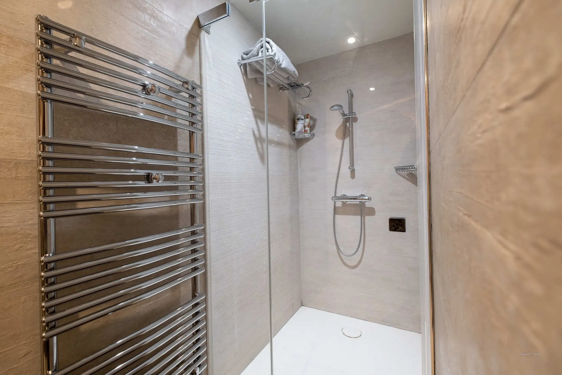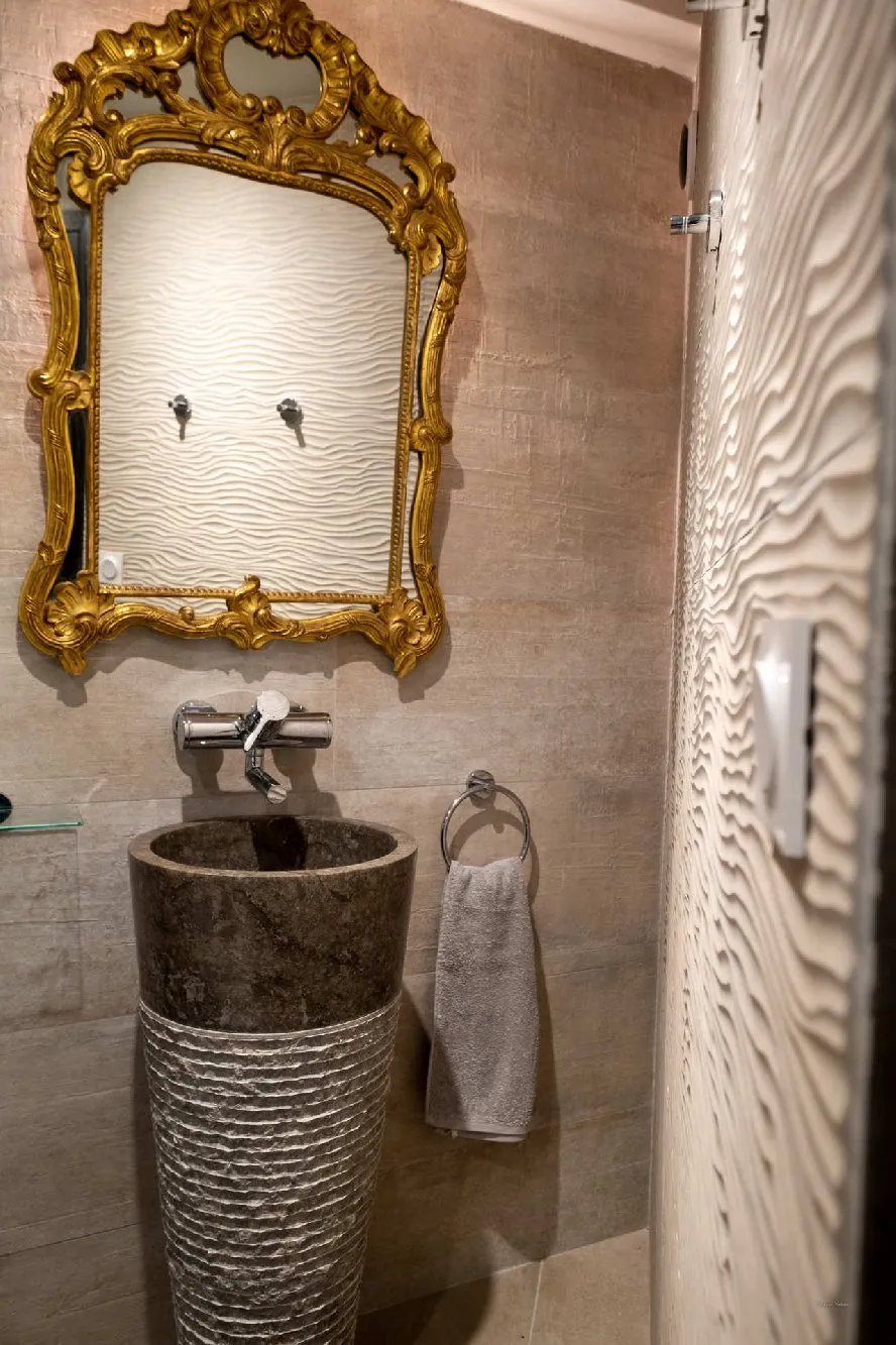 Lumineuse et confortable, les murs et le sol de la salle de bain sont recouverts de carrelages formant un camaïeu de grège rappelant la couleur du calcaire. Elle est équipée d’une grande douche, de W.C. et d’un coin lavabo en pierre de Bali surmonté d’un miroir à parcloses de style vénitien.