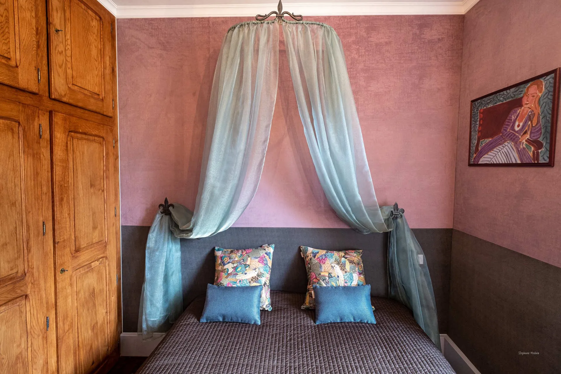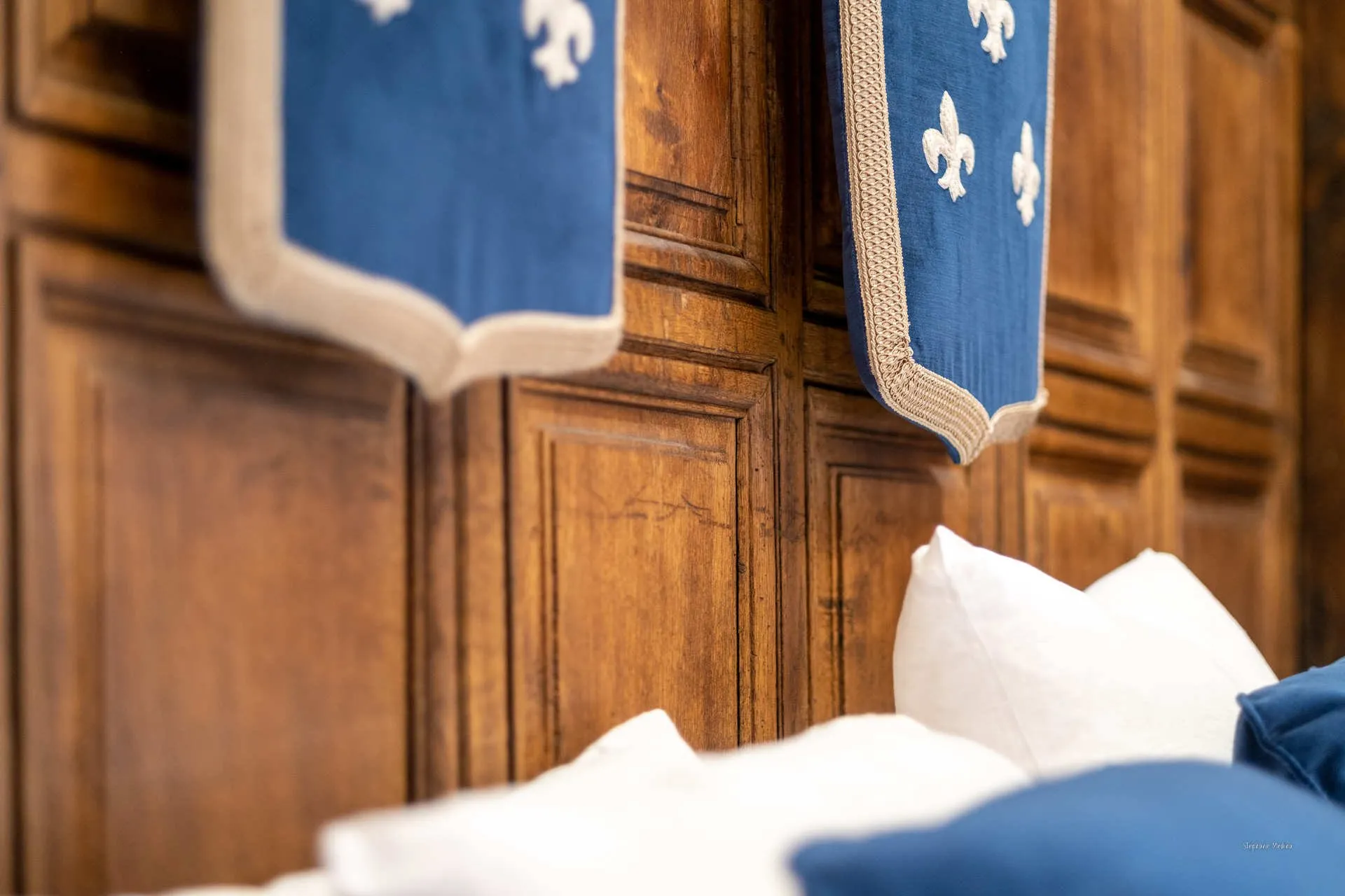 La chambre dispose d’ornements en fer forgé rappelant l’époque médiévale. Le ciel de lit et les patères à la fleur de lys habillés de voilages délicats ont été forgés à la main. Pour le confort des hôtes, nous avons choisi des étoffes aux couleurs multiples créant une sensation de raffinement dont la couleur « parme » a donné son nom à la chambre. Cette chambre est naturellement équipée d’un écran connecté pour le plaisir des occupants.