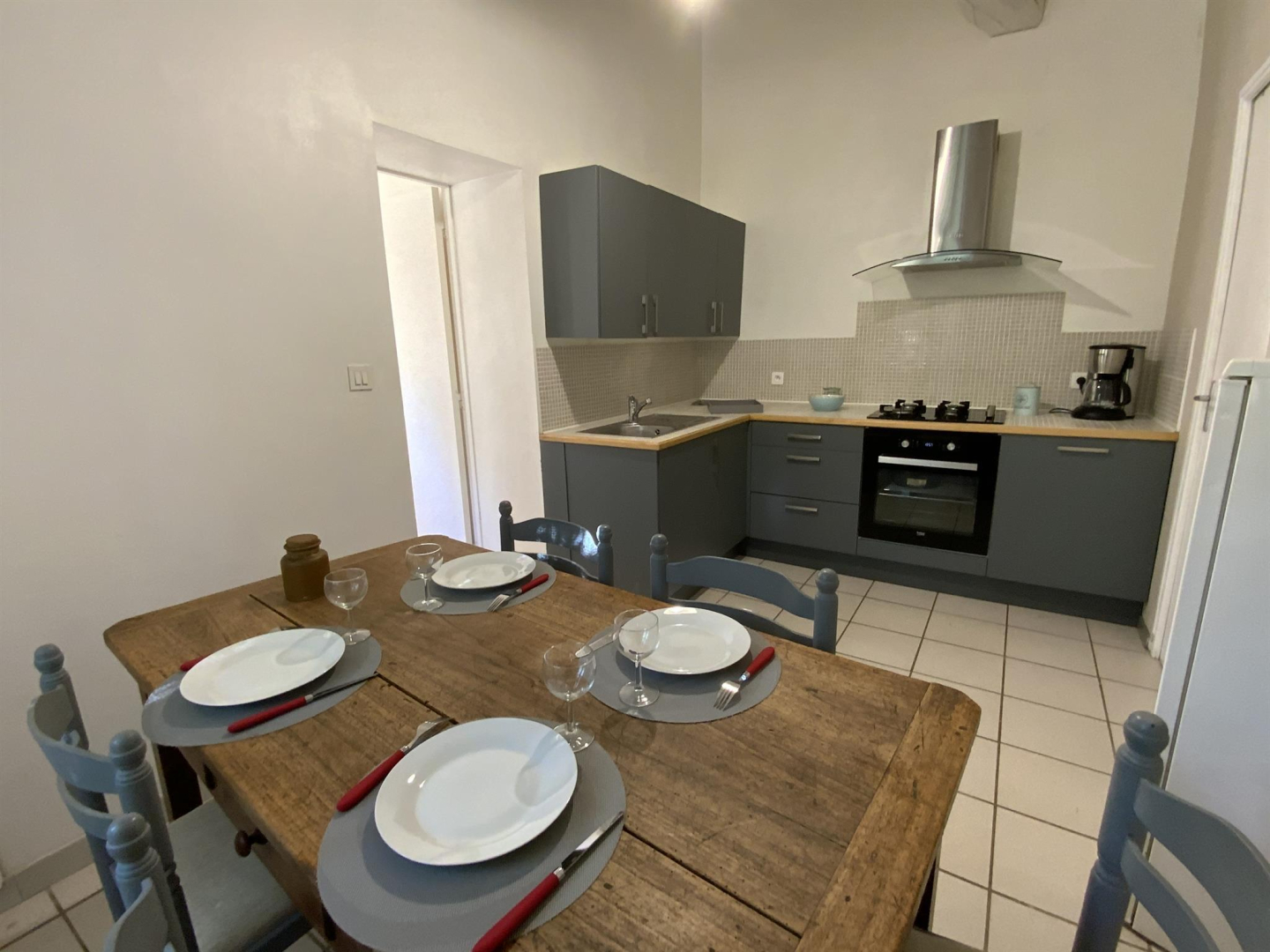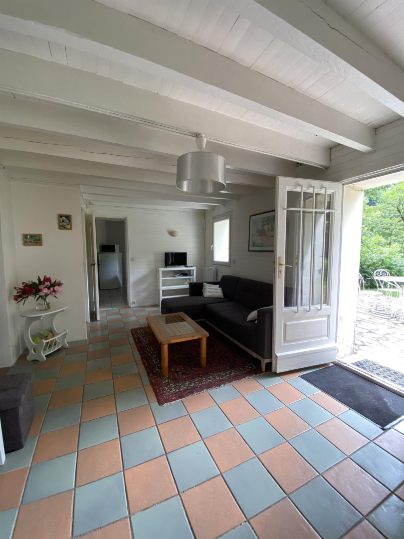 – pièce à vivre (20m²) avec canapé d’angle, table basse, poufs, poêle à bois, cuisine toute équipée (réfrigérateur, four, plaque de cuisson, micro-ondes, lave-vaisselle),