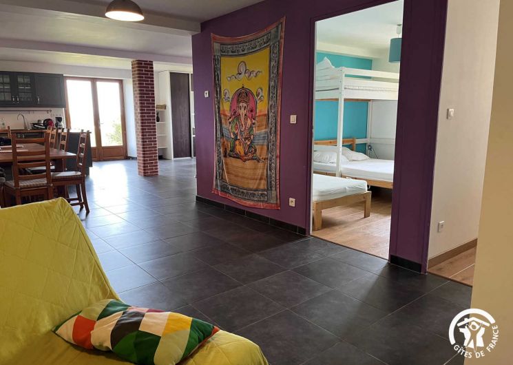 – Grande pièce à vivre avec salon, table à manger et cuisine ouverte équipée : bouilloire, cafetière à filtre, four, lave-vaisselle, micro-ondes, réfrigérateur avec congélateur et micro-ondes.