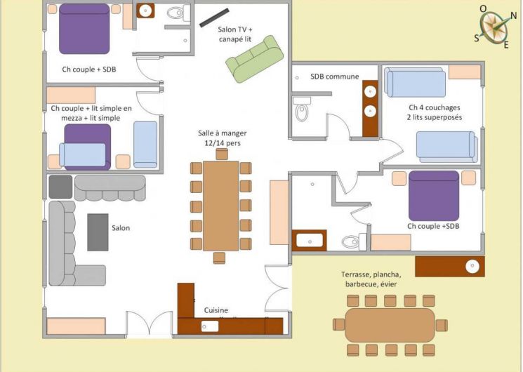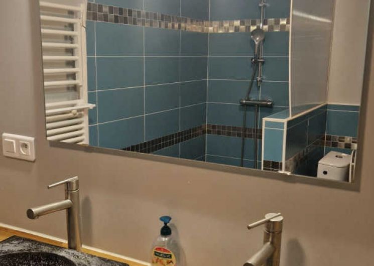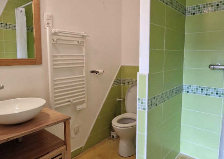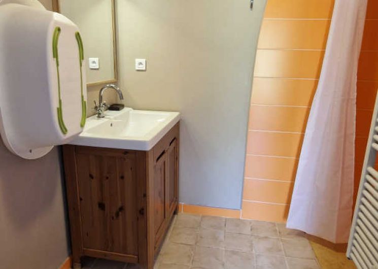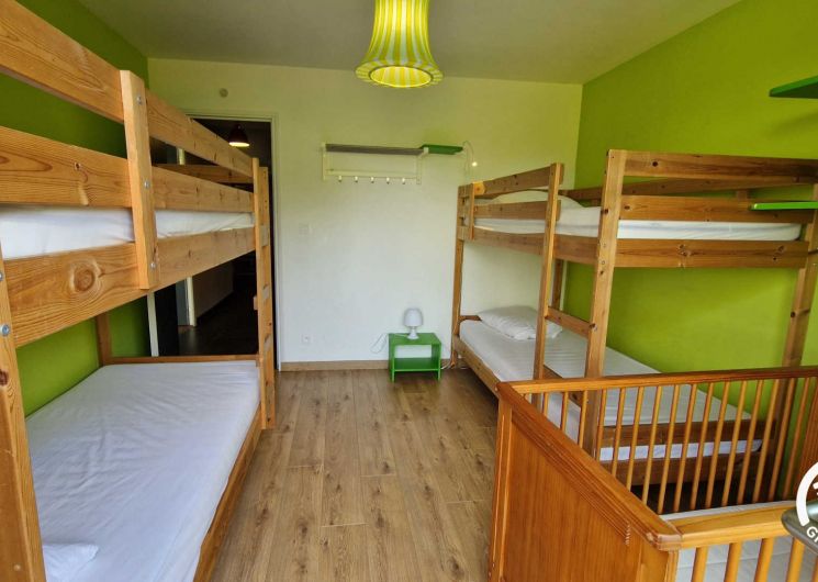 – Quatre chambres dont 2 avec salle d’eau privative (douche, wc et vasque), et une salle d’eau commune avec wc et lave-linge. Chambres de 2 à 4 personnes avec lits en 90x200cm, lits superposés en 90x200cm et lits doubles en 140x200cm.