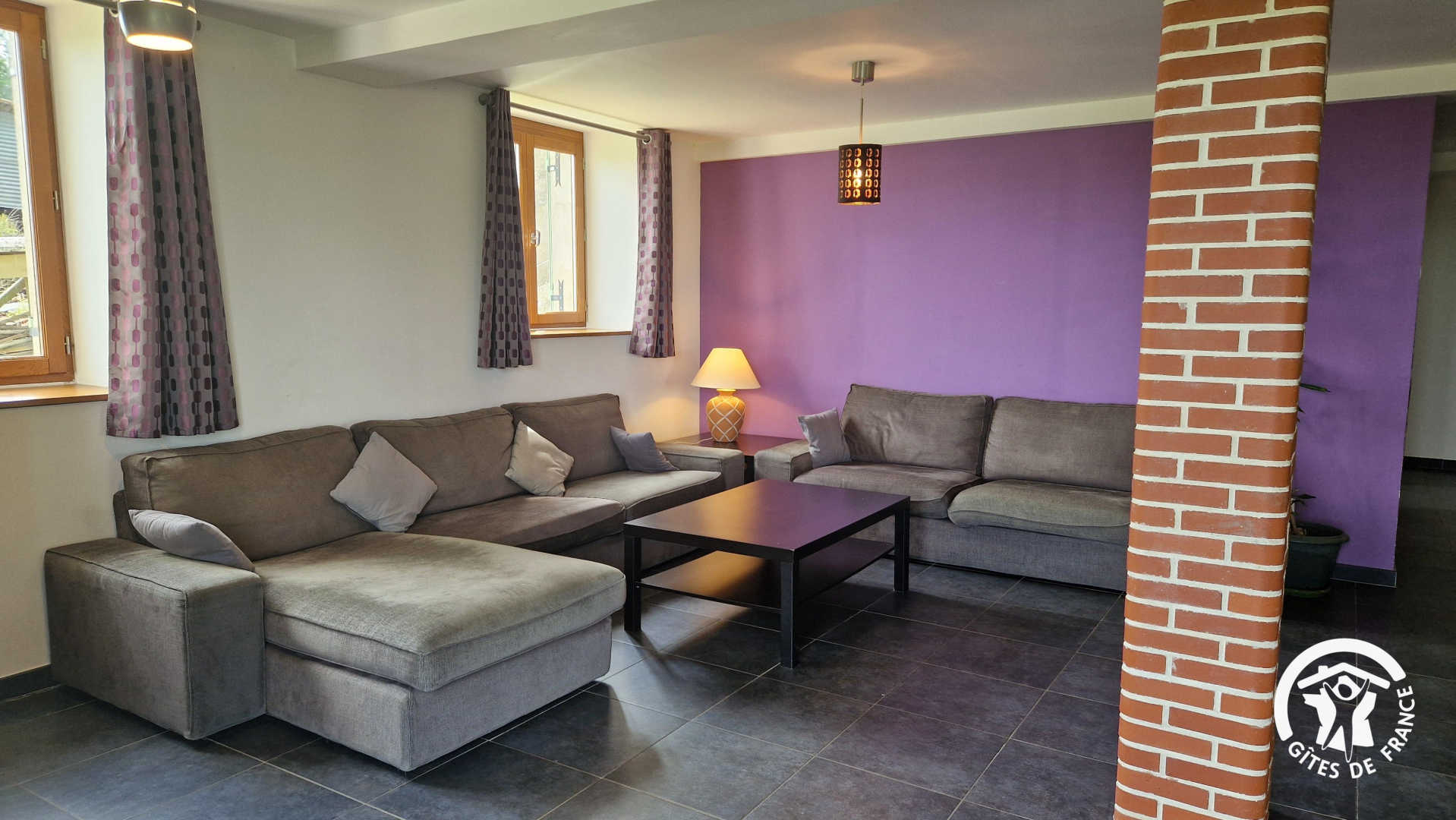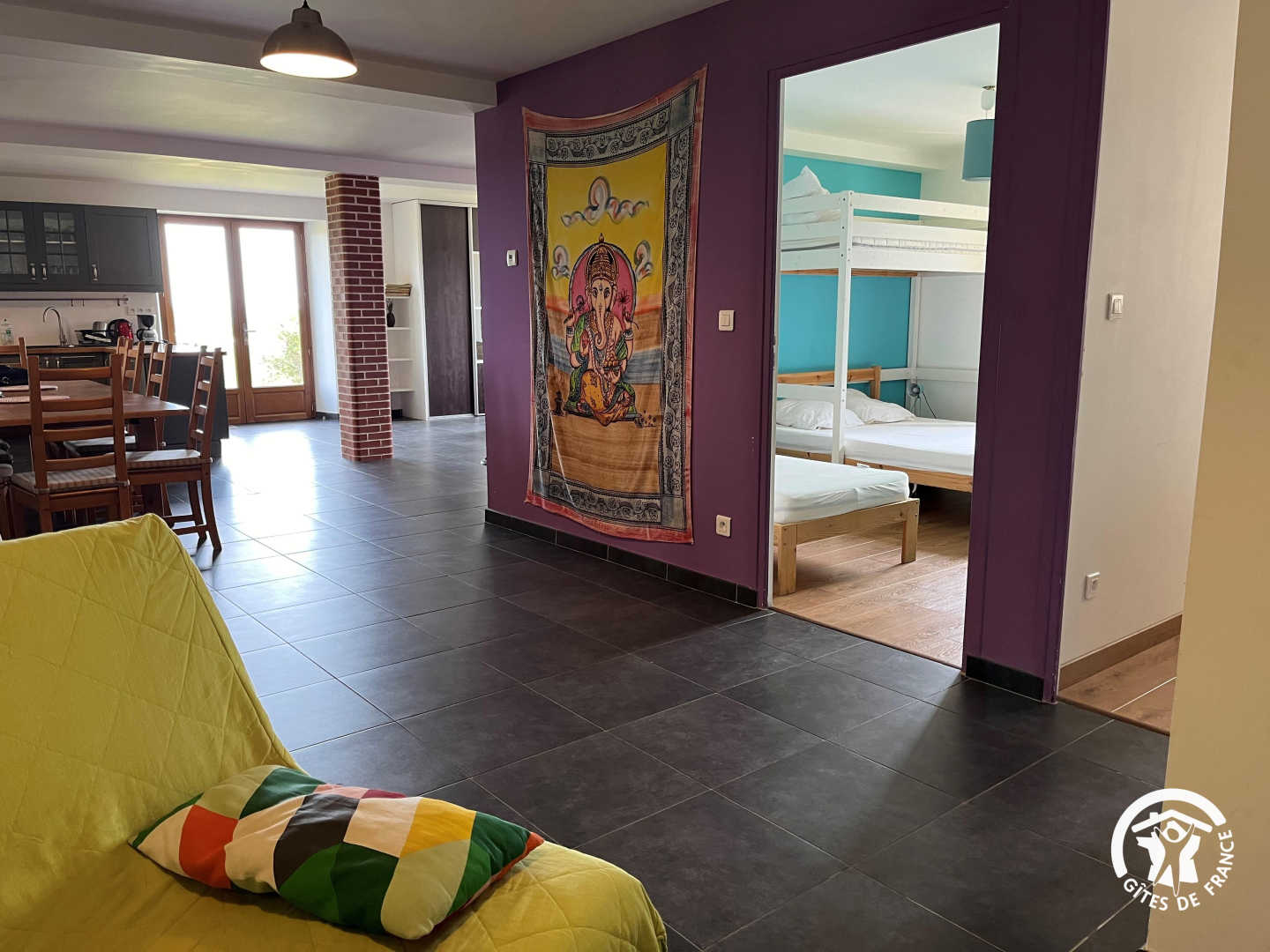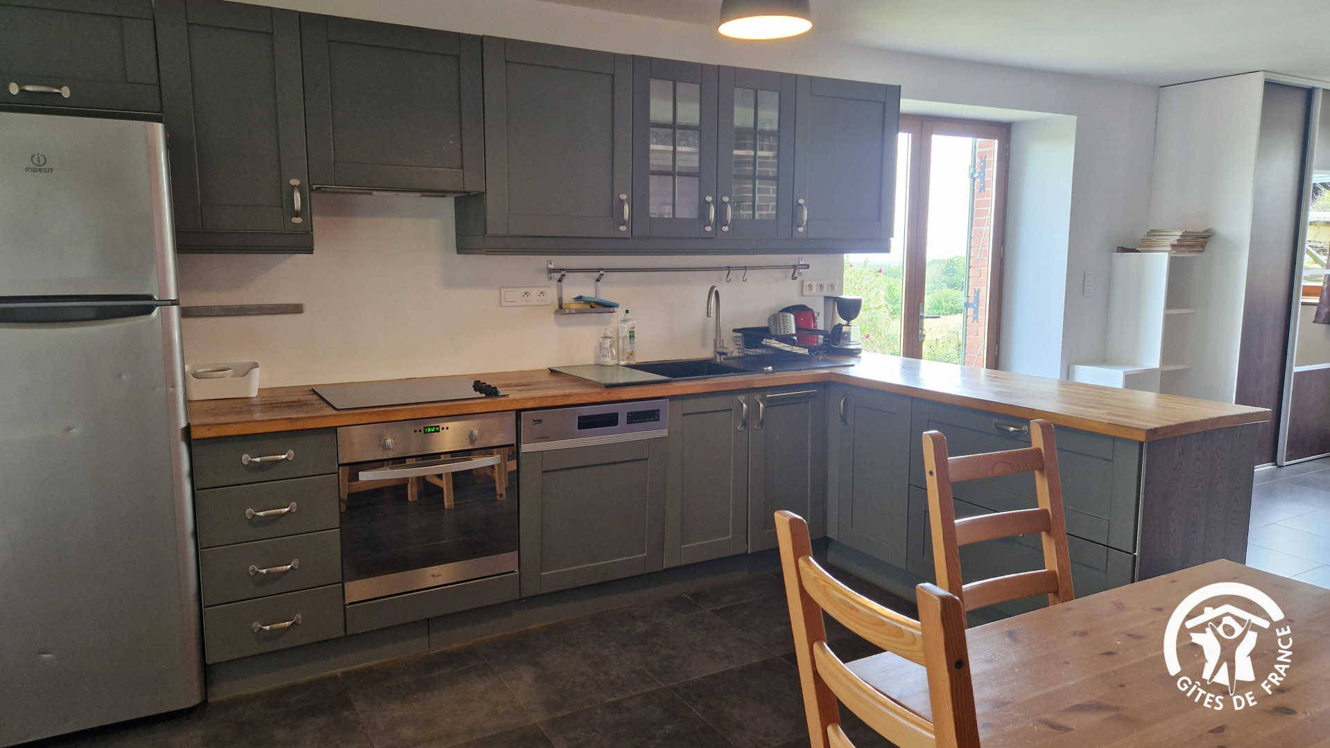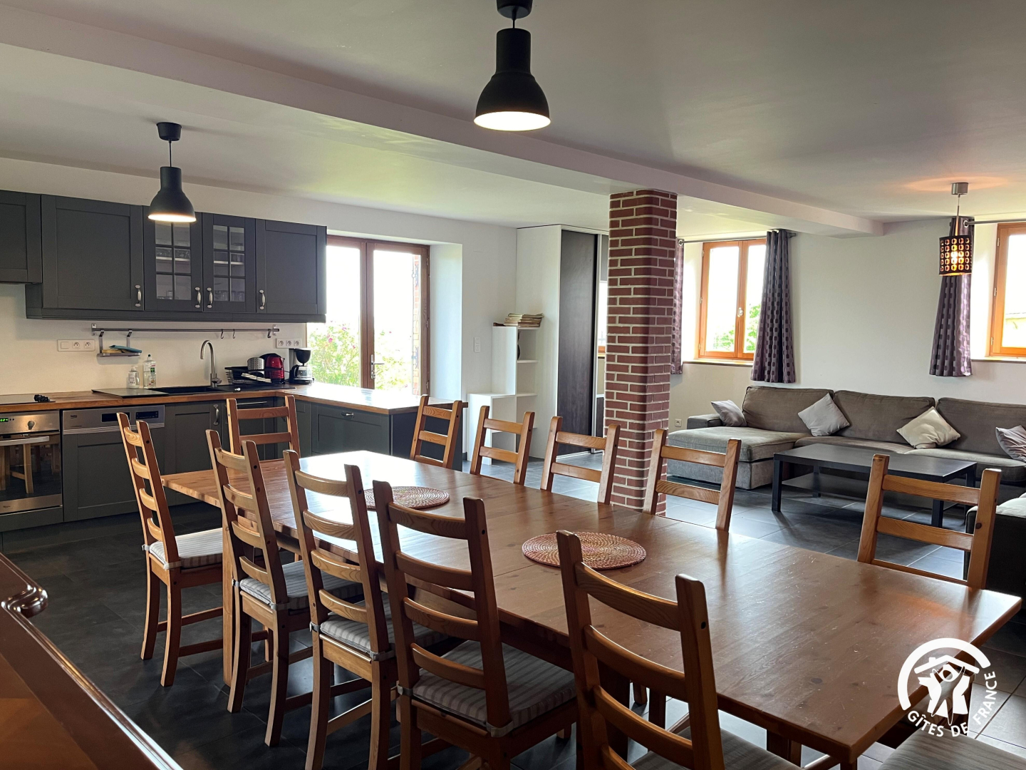– Grande pièce à vivre avec salon, table à manger et cuisine ouverte équipée : bouilloire, cafetière à filtre, four, lave-vaisselle, micro-ondes, réfrigérateur avec congélateur et micro-ondes.