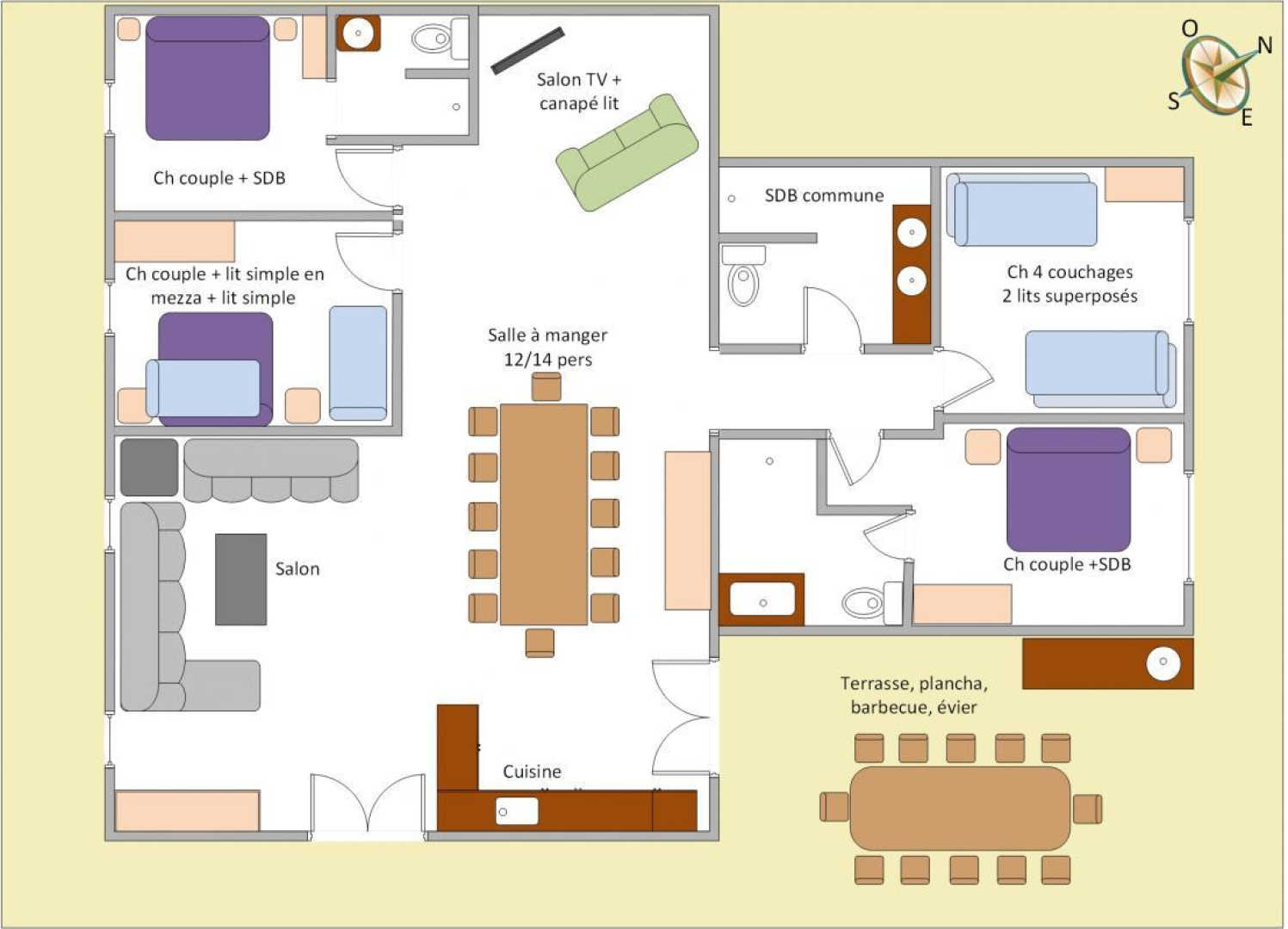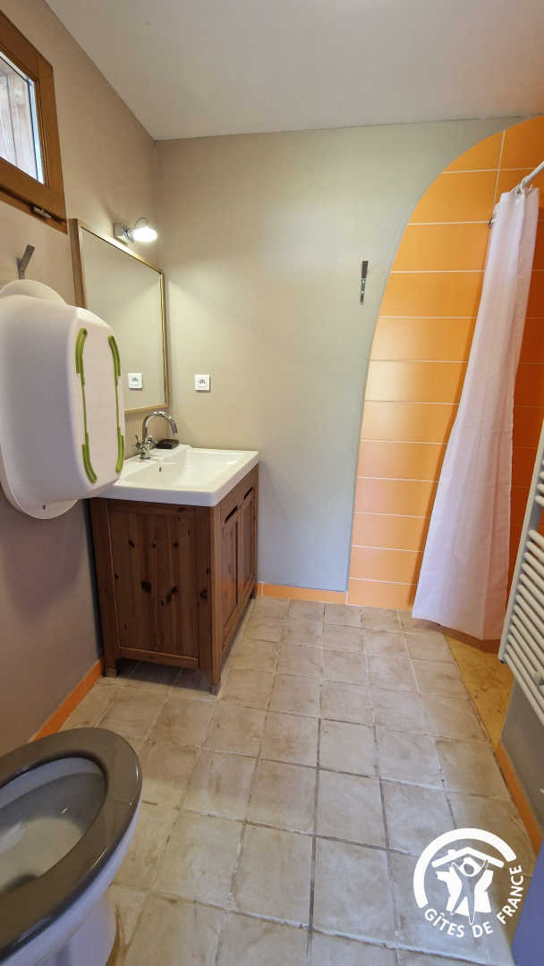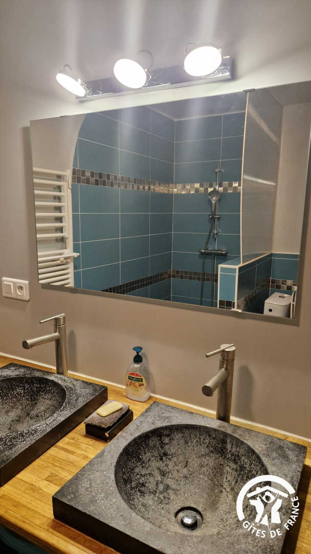 – Quatre chambres dont 2 avec salle d’eau privative (douche, wc et vasque), et une salle d’eau commune avec wc et lave-linge. Chambres de 2 à 4 personnes avec lits en 90x200cm, lits superposés en 90x200cm et lits doubles en 140x200cm.