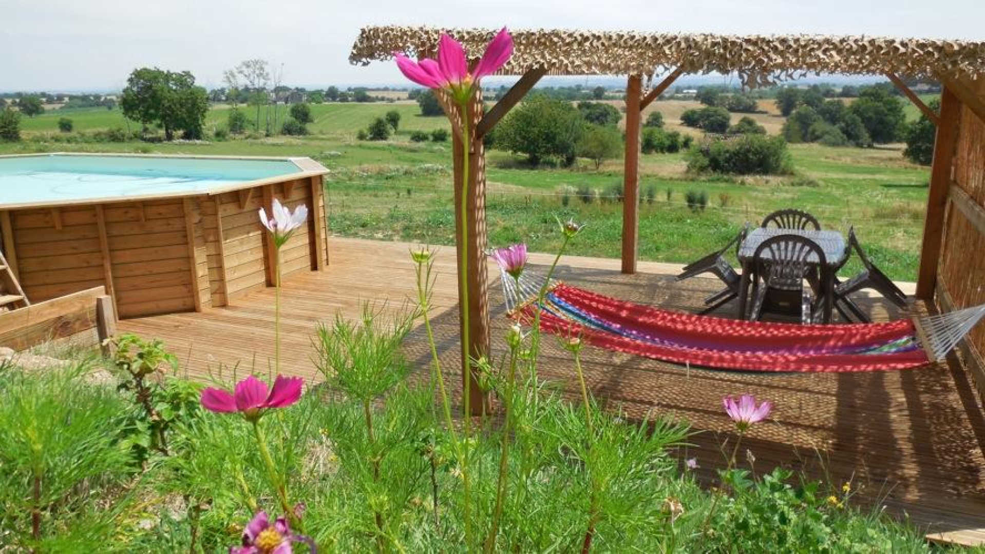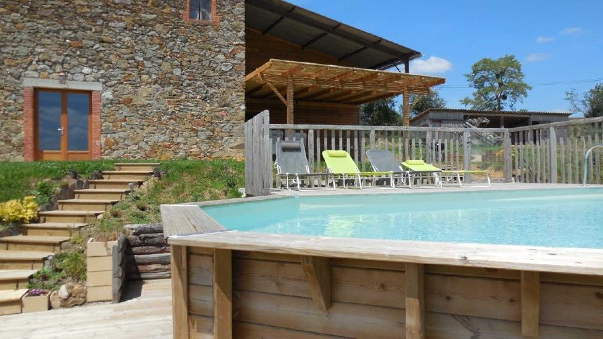 Terrasse couverte, plancha, barbecue rond au charbon Weber®, piscine hors-sol avec terrasse, grand terrain de 3 hectares où vos enfants pourront joyeusement s’ébattre. Il descend en pente douce vers un petit étang alimenté par une source.