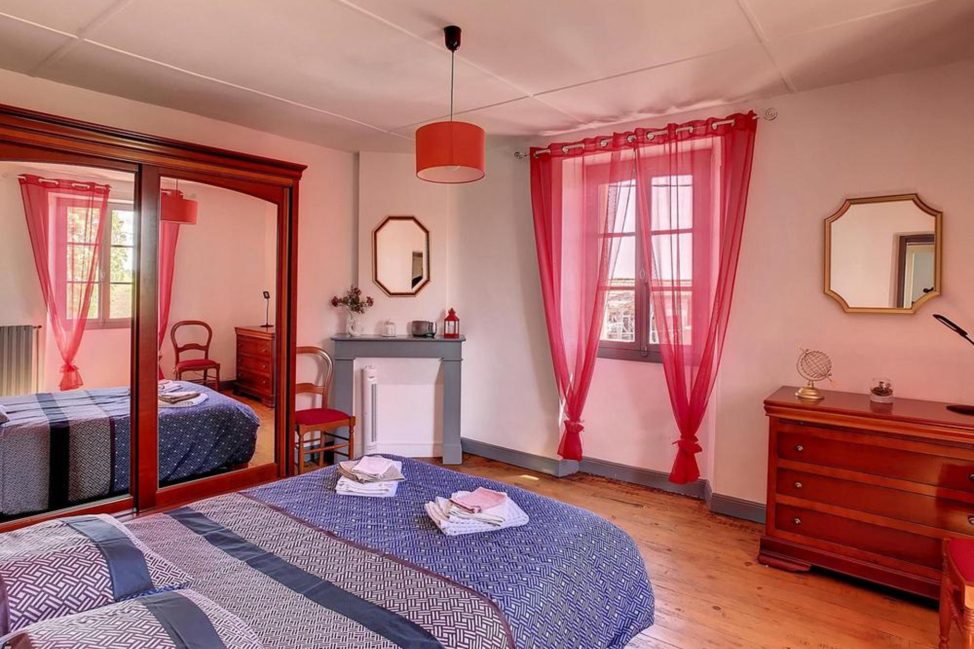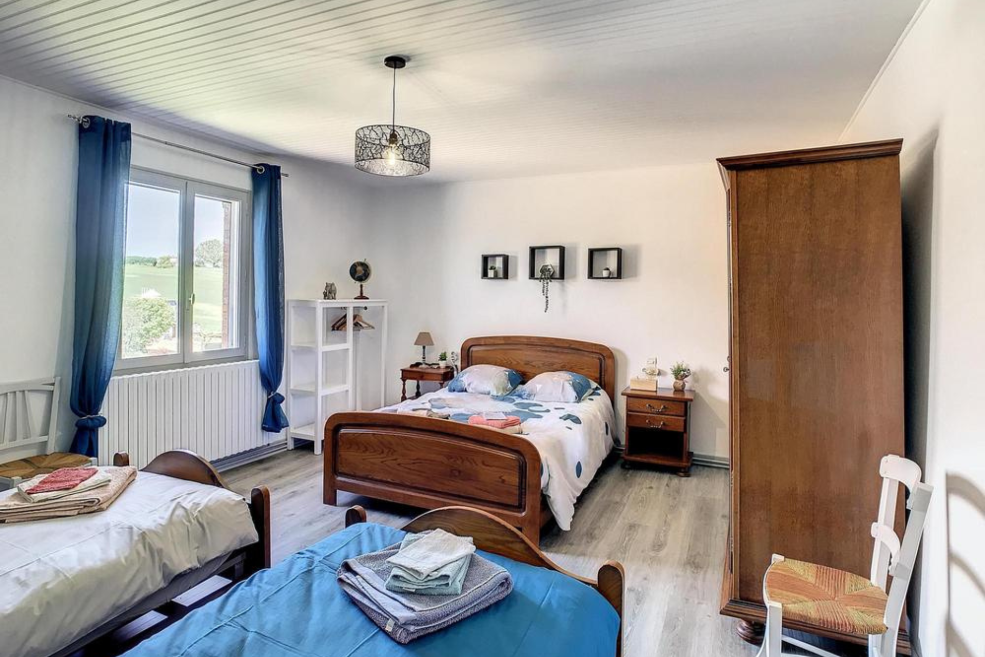 Au rez-de-chaussée, vous trouverez la chambre 1 équipée de deux lits en 90 cm. Les autres chambres sont situées à l’étage. La chambre 2 et la chambre 5 sont équipées d’un lit de 140 cm. Les chambres 3 et 4 sont communicantes, ce qui en fait un espace idéal pour les familles ou les groupes désirant rester proches tout en ayant la possibilité de préserver leur intimité. La chambre 3 est équipée d’un lit de 140 cm, tout comme la chambre 4, qui propose en plus deux lits de 90 cm.
