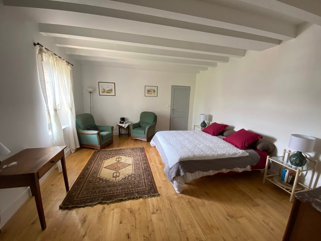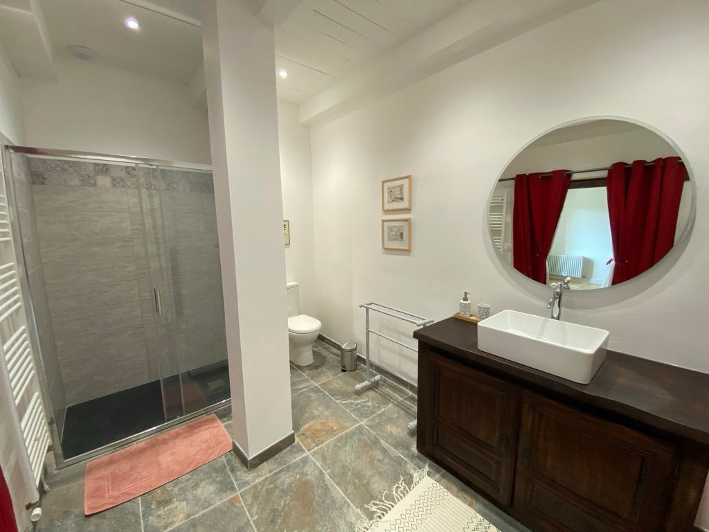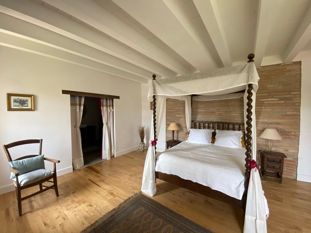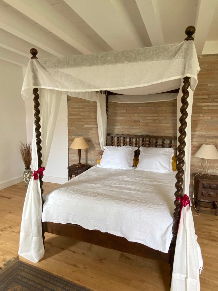 The two bedrooms are on the 1st floor: The baldaquin bedroom with 1 four-poster bed (140cm), a sitting area with courtesy tray, a shower room with walk-in shower and wc. The spring bedroom with 1 double bed (180cm), a desk, a small sitting area with courtesy tray and a large bathroom with bath, walk-in shower and wc. An extra single bed can be added to both bedrooms. Wifi in the house and bedrooms. Gravelled courtyard and park with views of the Pyrenees. In the morning, you can enjoy a hearty breakfast with home-made products. In the evening, by prior arrangement, you can enjoy a convivial table d’hôtes in the large dining room. Louis will regale you with local produce and wines in front of the big fireplace.