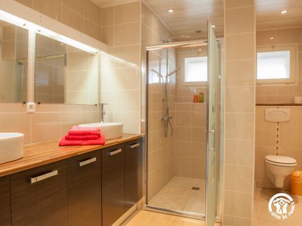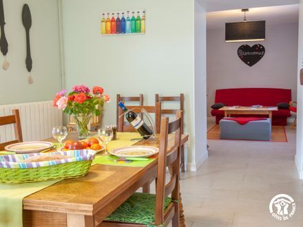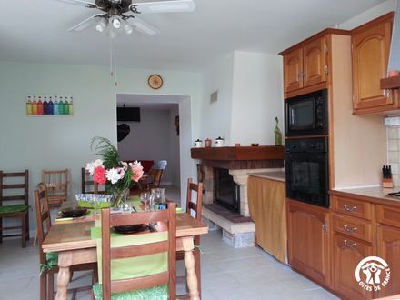 The ground-floor accommodation comprises: hallway with cloakroom, living room (sofa bed, flat-screen TV, DVD player), with kitchenette (fitted units, microwave, washing machine, dishwasher, freezer), 2 bedrooms (1 double bed each), shower room with wc. Large covered terrace (50 m2) with barbecue, garden furniture, hammock and 1 private fenced courtyard (100 m2). Linen and sheets provided (beds made up on arrival). Wifi internet connection. Optional: cleaning (45 €) (mandatory for professionals), bathroom linen. Pets allowed free of charge.