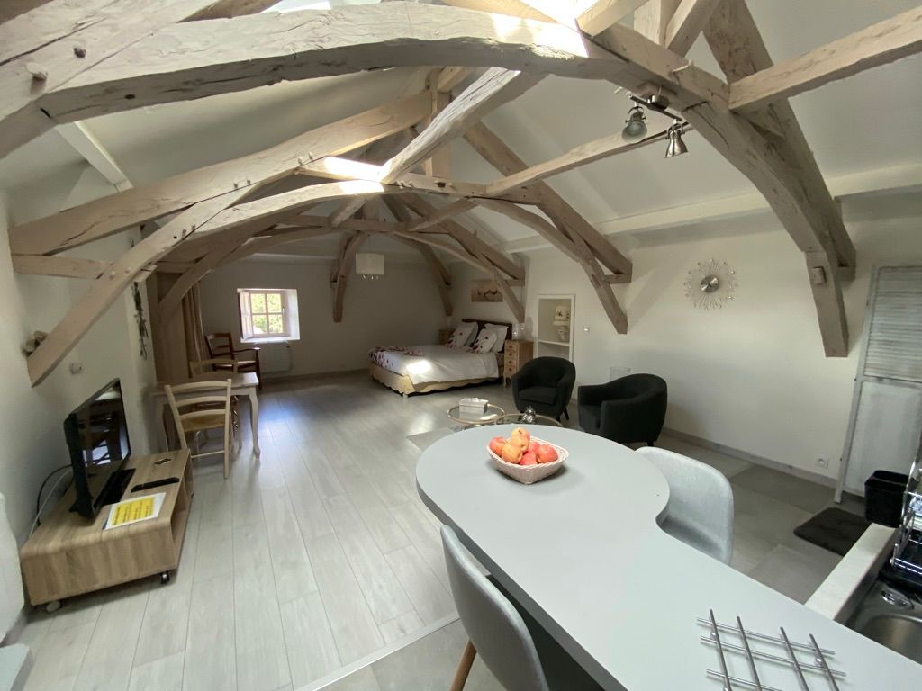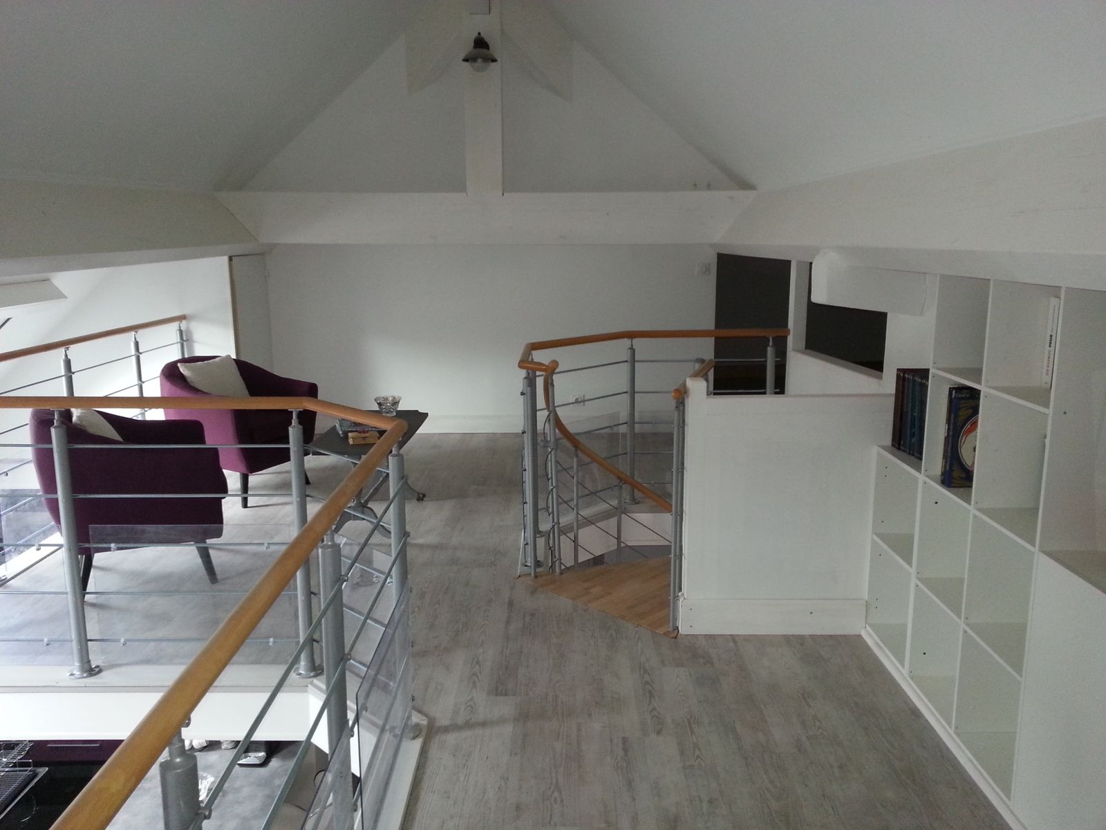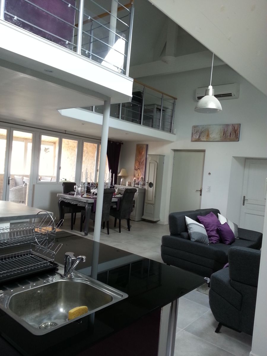 De zolder omvat: een woonkamer met keuken (geïntegreerde elementen LV vier mo koelkast, vriezer) en woonkamer voor de inzet open haard, 2 banken (tv, dvd -speler), een eethoek (tafel en 6 stoelen); Een technische kast (wasmachine, droger), een onafhankelijk toilet (handwas en muurplekken); Een slaapkamer (1 bed 160 kleedkamer en 1 eigen badkamer (1 bassin, douche), een slaapkamer (2 sluit 0,90 bedden, kleedkamer en 1 eigen badkamer (1 bekken, douche) en toegang tot een terras bedekt met een tuintafel , 6 stoelen, barbecue, 2 fauteuils, 1 salontafel en een bank. Op het bovenste niveau door een wenteltrap, in mezzanine een kinderruimte met bibliotheek, 2 fauteuils salontafel en een kantoor).