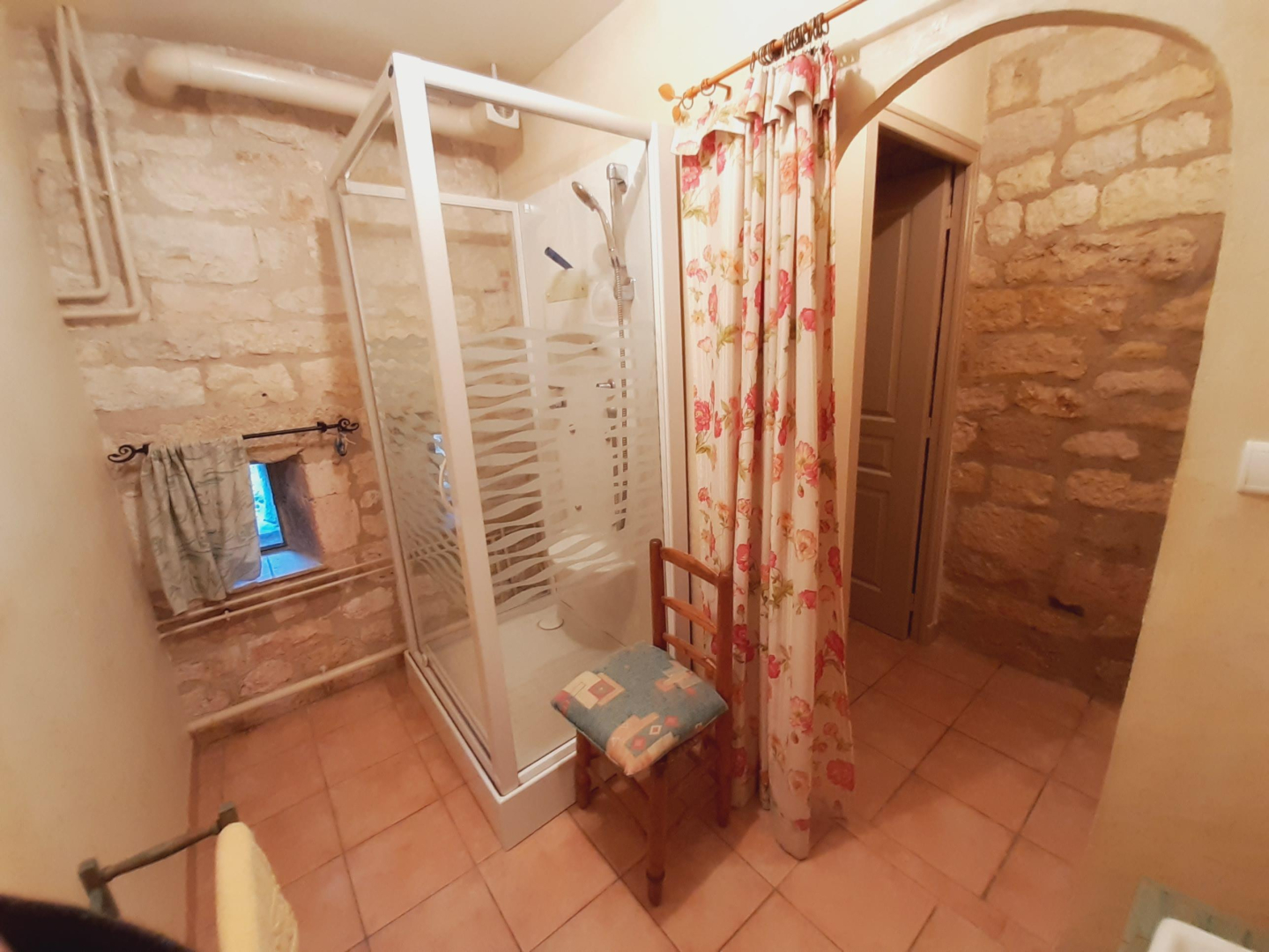 Rez-de-chaussée : cuisine toute équipée, salle à manger, séjour (poêle à bois), salle d’eau avec douche hydromassante, wc.