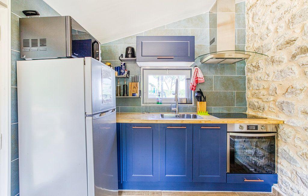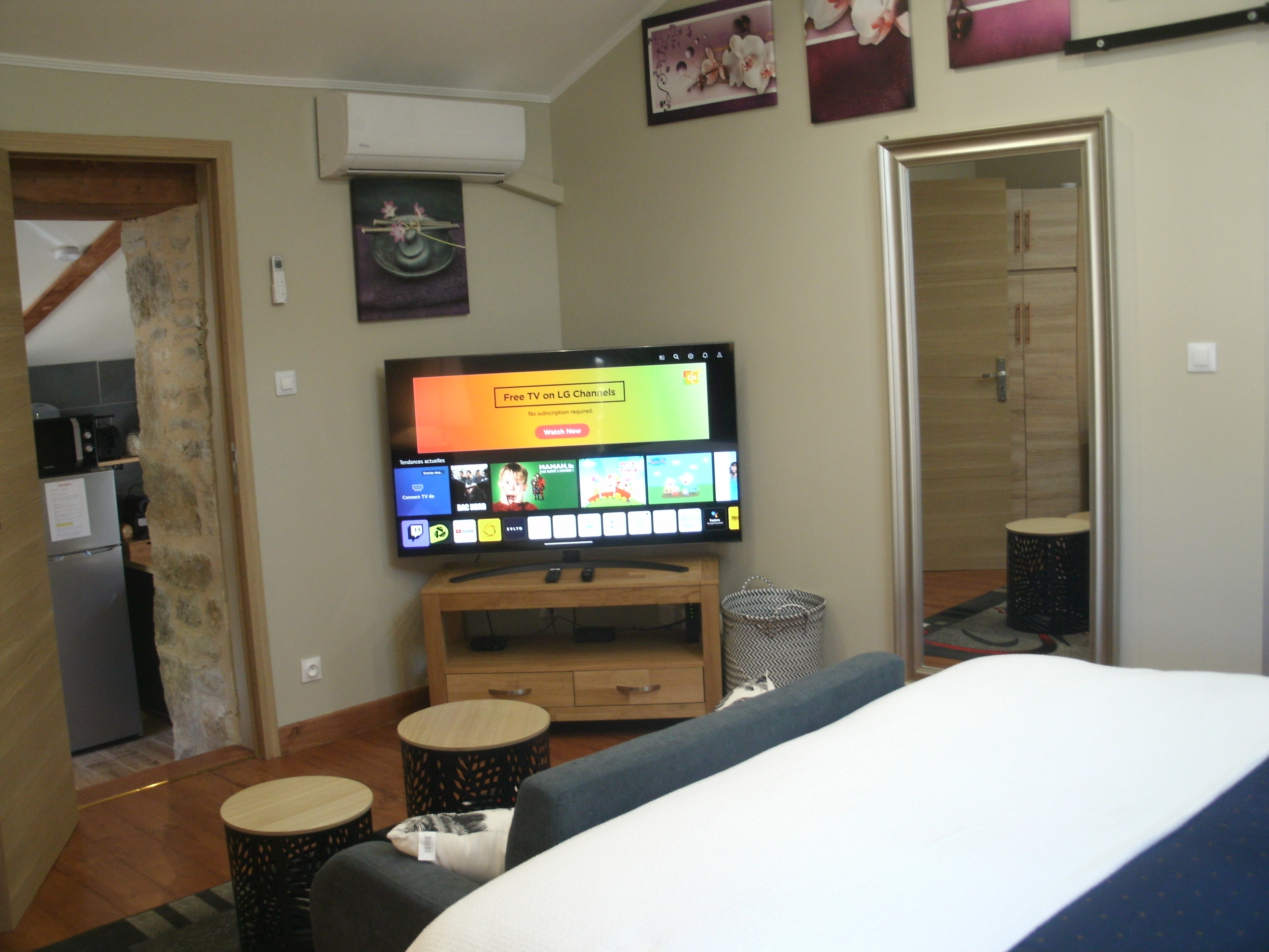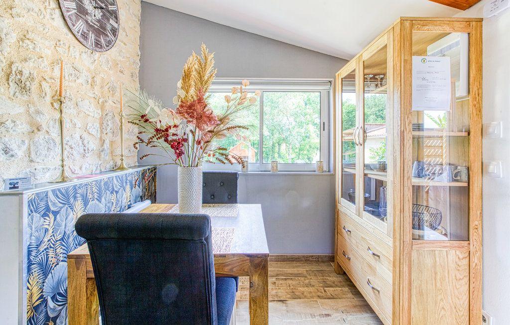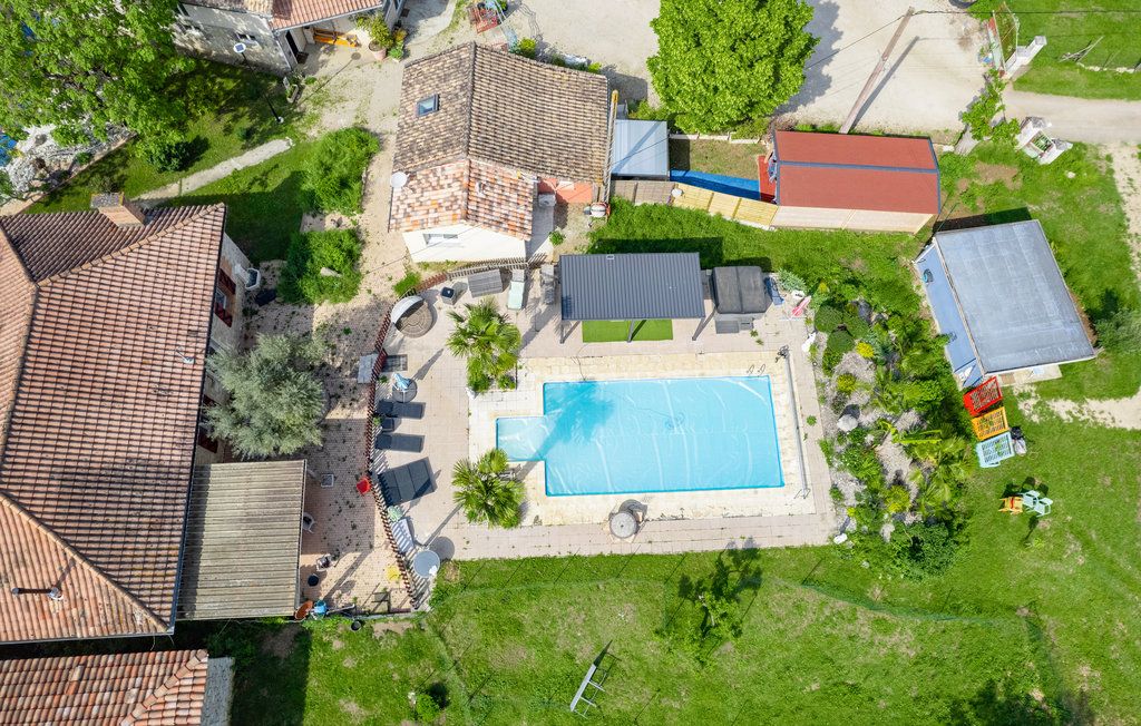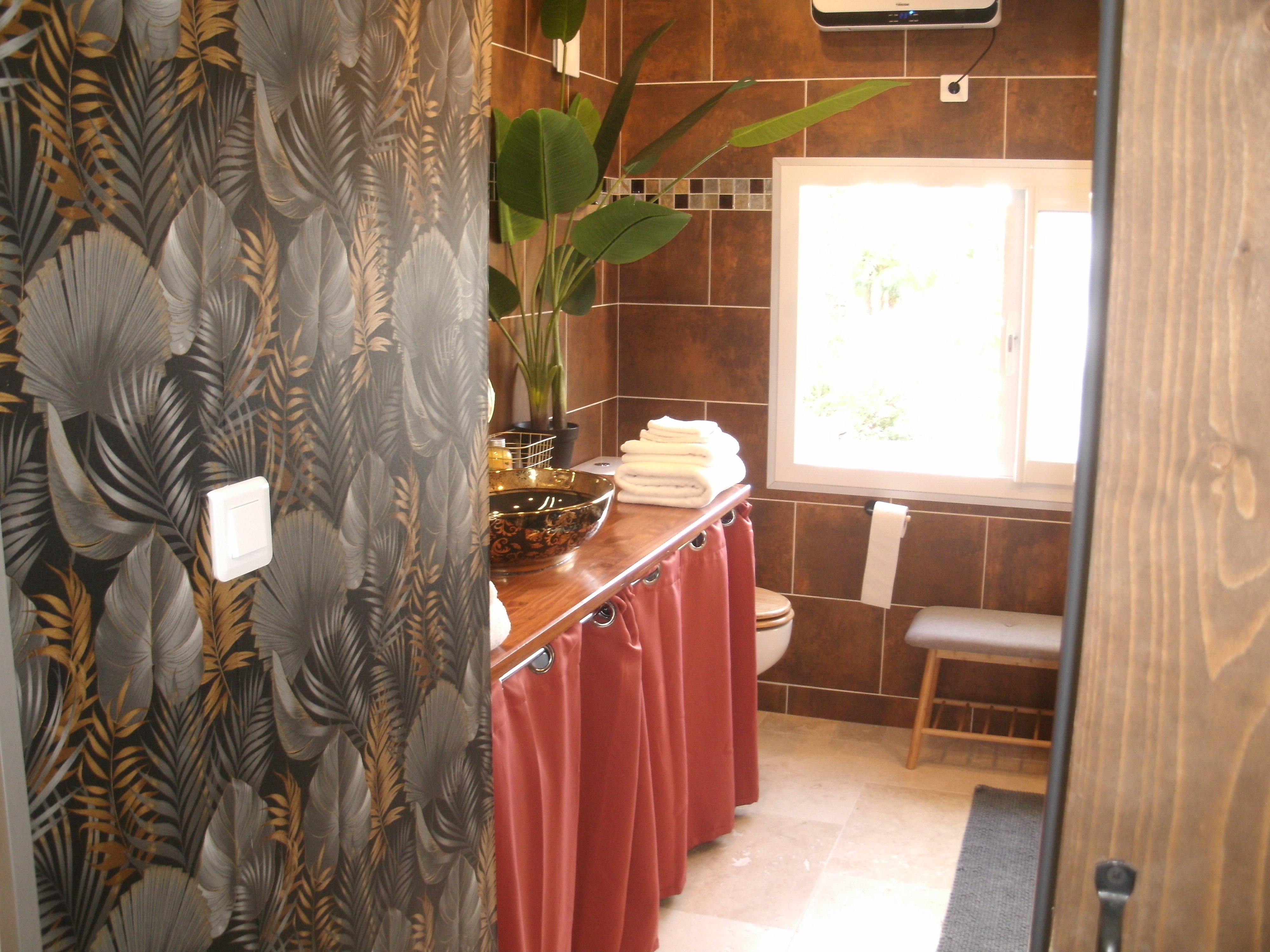 After a few steps from the car park, access to the terrace, garden furniture and pergola. One step leads up to the living area (fitted kitchen: fridge, freezer, hob, oven, microwave) with table and chairs. After 4 steps, the bedroom with 1 x 160 x 200 bed, sofa and TV. Bathroom with shower and bath, washing machine and tumble dryer. Bed linen and towels provided, included in the price. Free Wi-Fi in the accommodation. Essential oils for the Hammam. Bathrobes provided. From 1 May to 31 October, access to the shared swimming pool and spa.