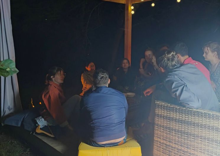 En voor het huisje een privé -loung hoek onder een houten pergola, ‘s nachts verlicht.