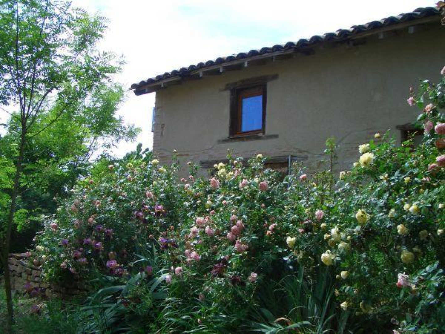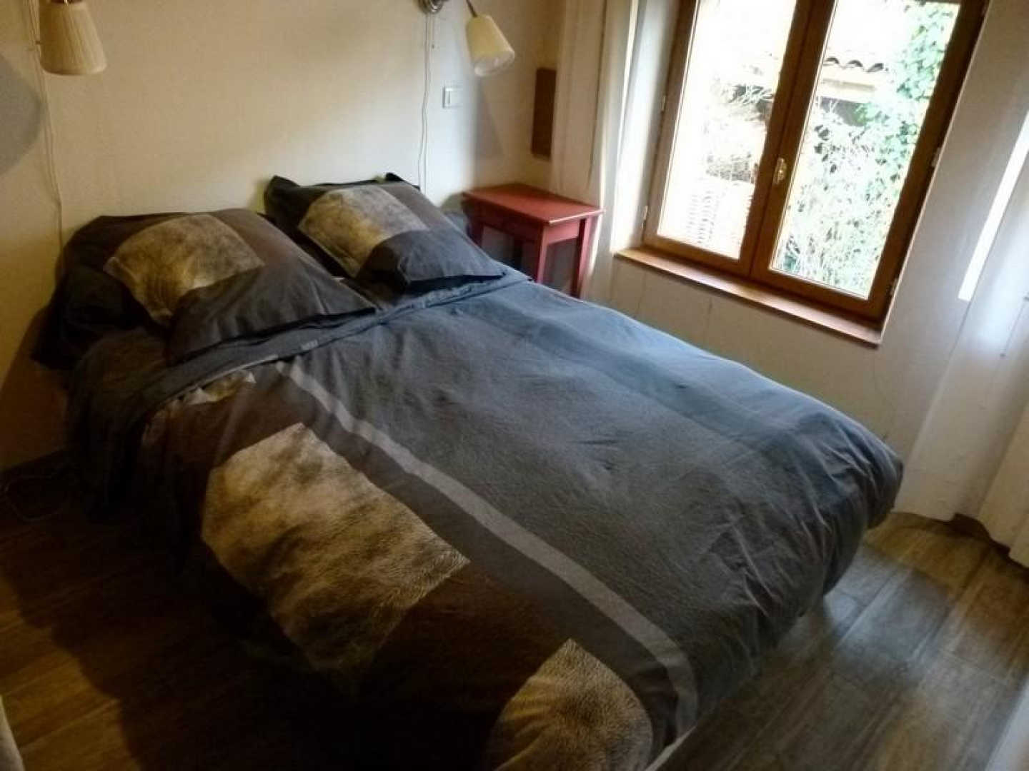 – chambre avec lit double en 140x190cm et une fenêtre qui s’ouvre sur un parterre fleuri. Une marche en contre-bas pour accéder à la chambre