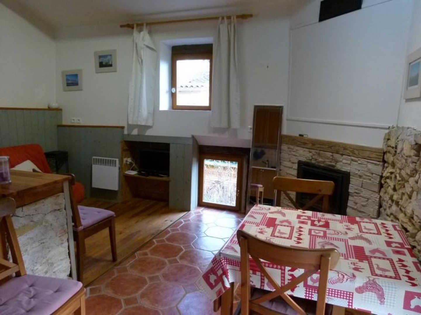– pièce à vivre avec une cuisine ouverte, un coin salon avec un clic-clac 2 places pour couchage supplémentaire, et une partie salle à manger