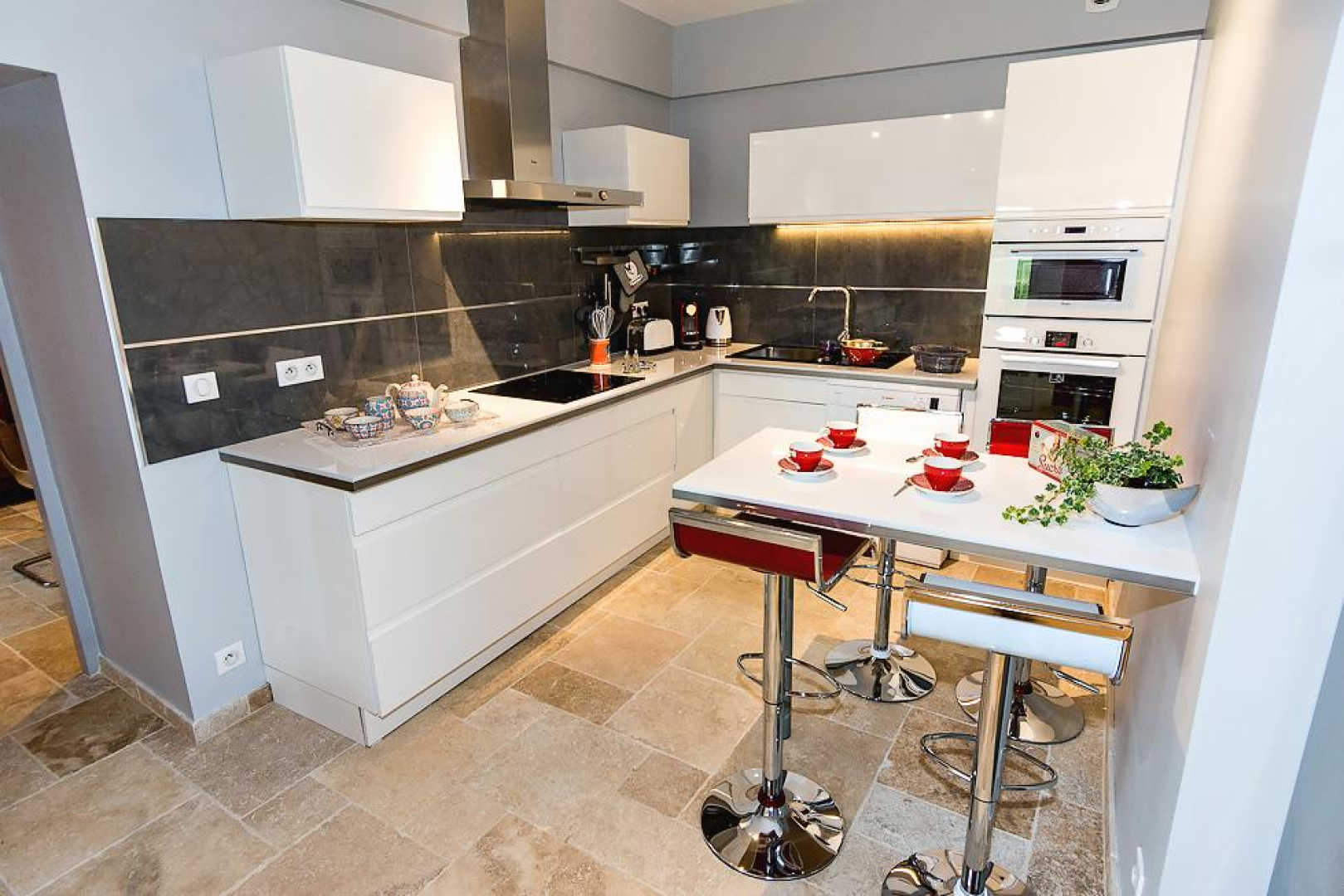 Rez-de-chaussée : salon, salle à manger, cuisine entièrement équipée, cellier (lave-linge et sèche-linge), wc, chambre accessible aux personnes à mobilité réduite avec salle d’eau/wc privatifs.