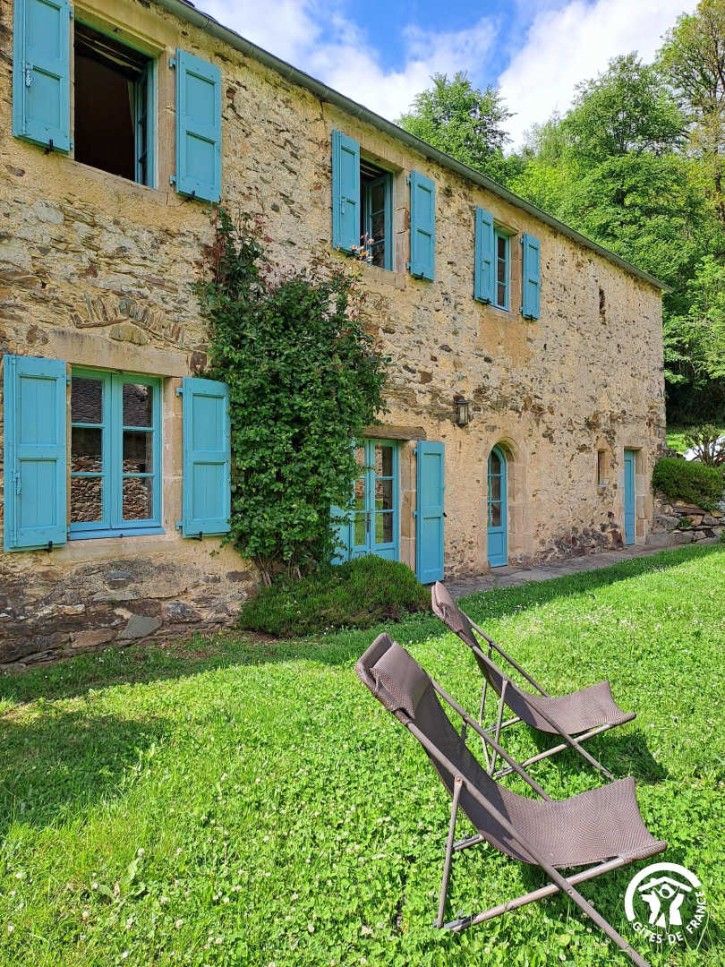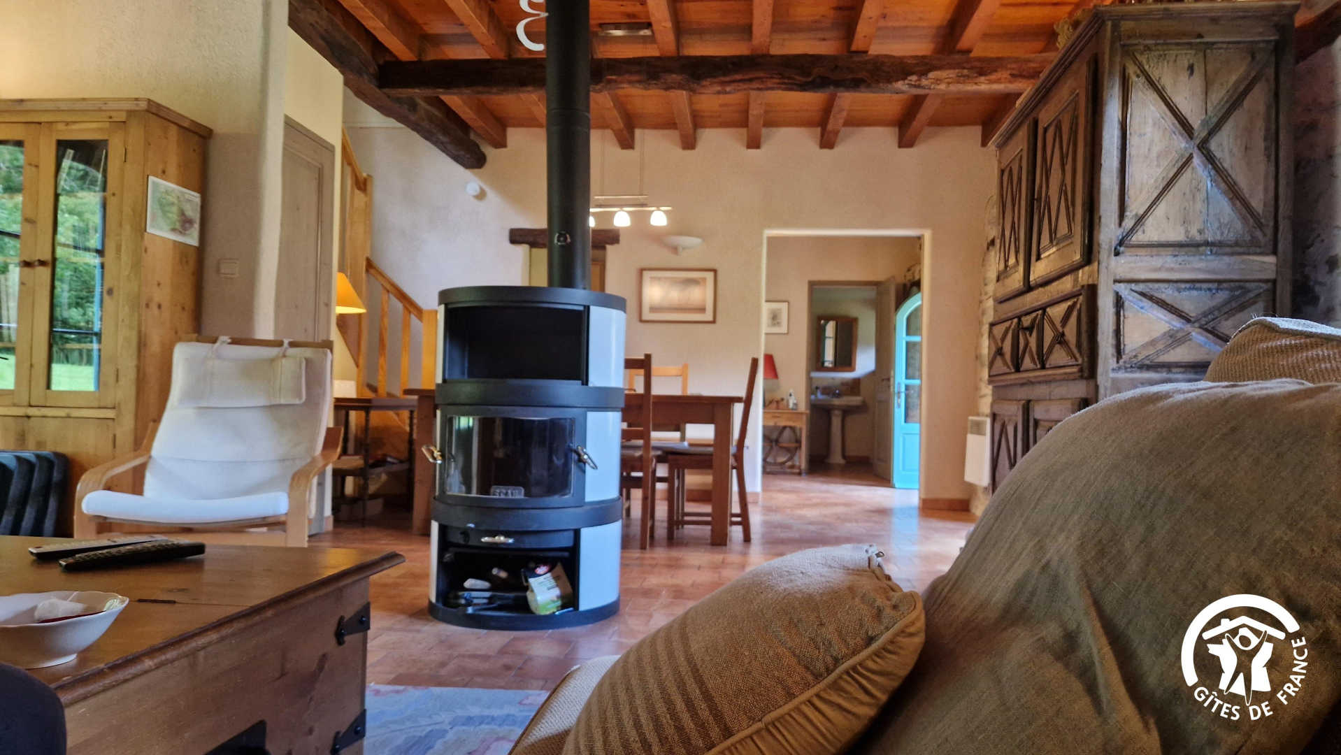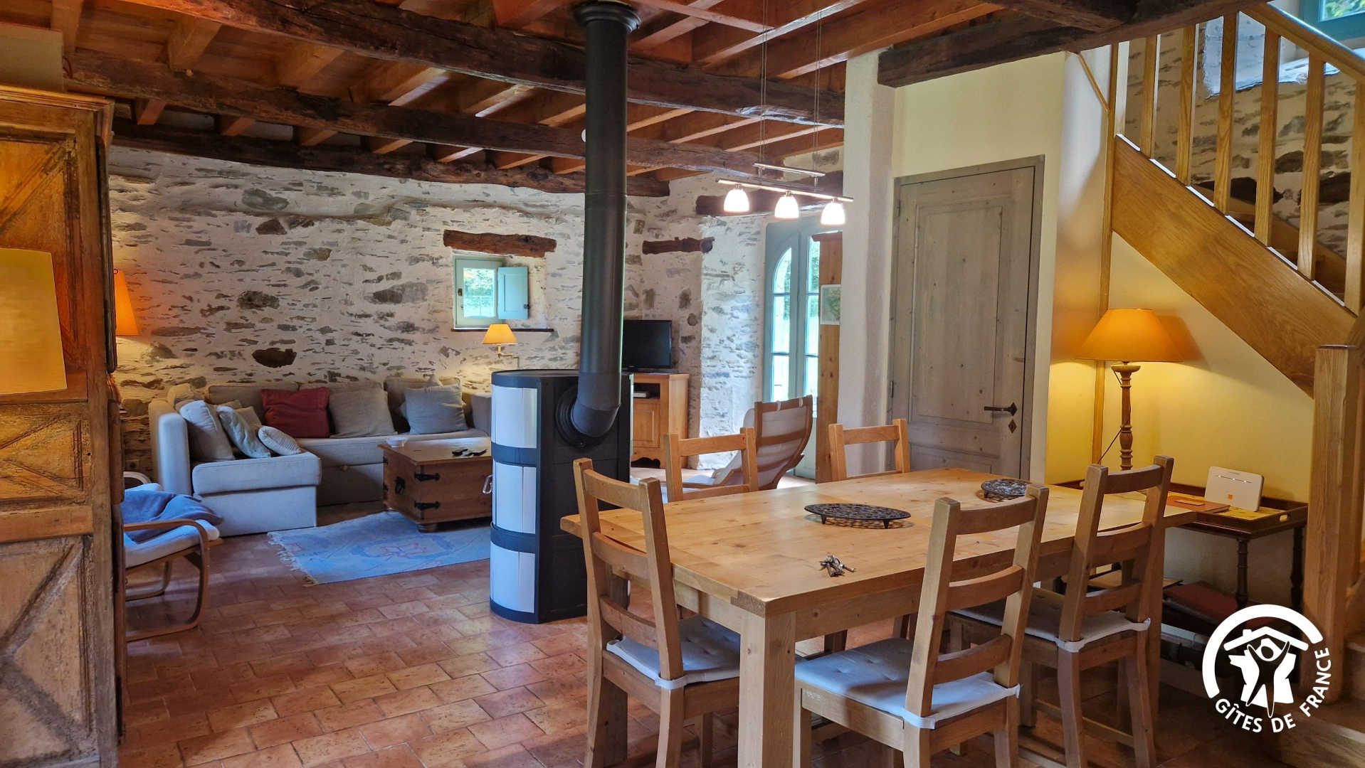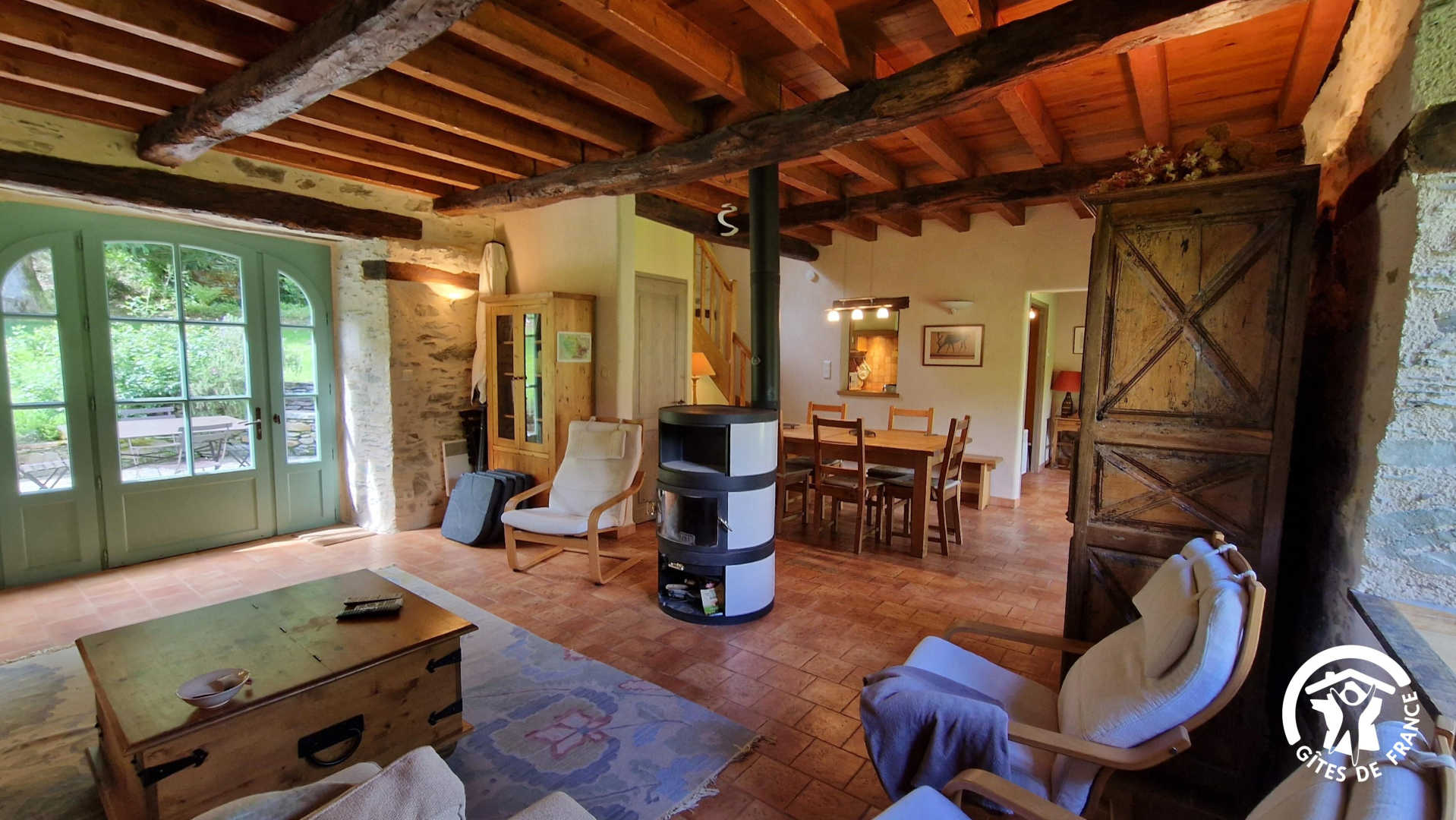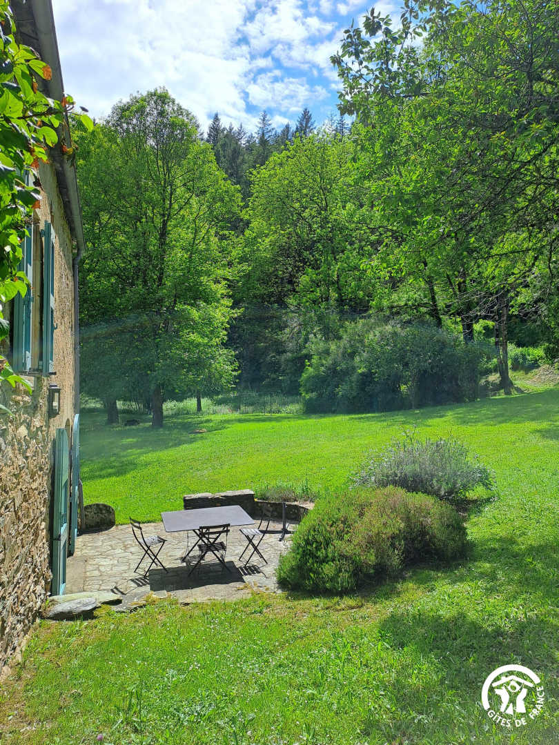 Indep. Gr. fl.: kitchen, living-rm/ dining-rm (sofa-bed), WC. 1st fl. : 3 bdrms (1 bd 5ft2, 2 twin bds 2ft6, 2 bds 3ft indep), bathrm, shower rm, WC. Electr.heating stove in open fire. Washing mach, tumble dryer, dishwasher, TV-DVD, micro-wave, telephone. Grounds, terrace, garden table & chairs, BBQ, parking. Bed linen, towels and house linen: complimentary service. Animal not allowed. 6 mountains bikes available. The house is deeply situated in full nature, in an exceptional setting, bordered by a wild trout’s river, and a hiking path. Set in a clearing surrounded with woods, one has access thru a XVIIth century embossed bridge. Comfortable, pleasant stay in any season.