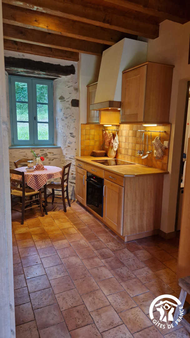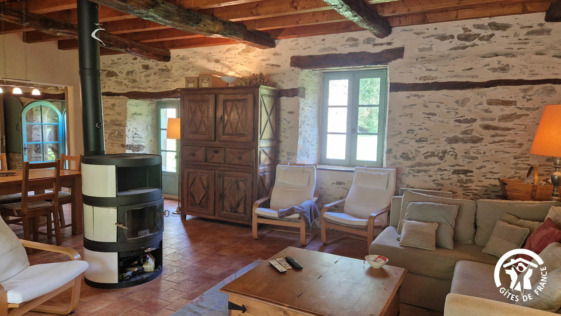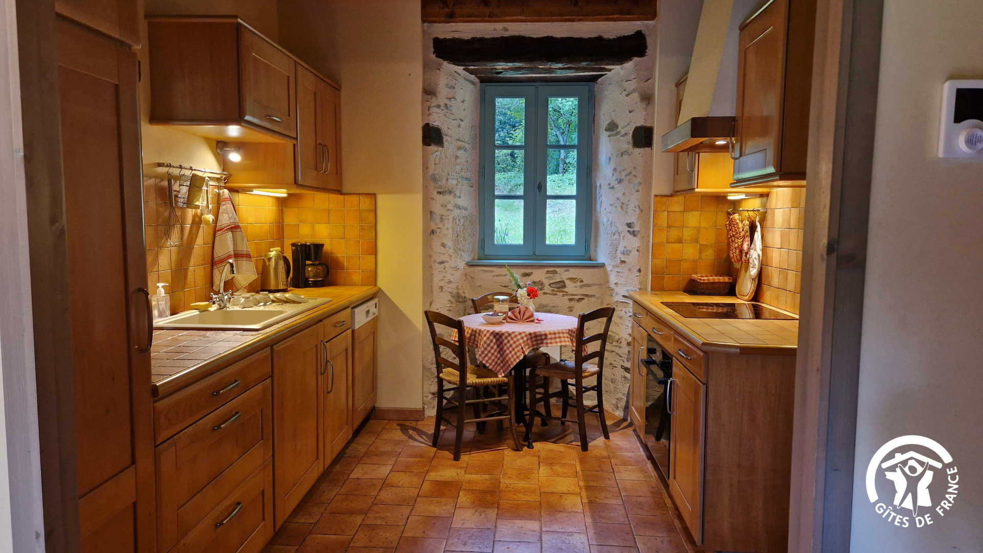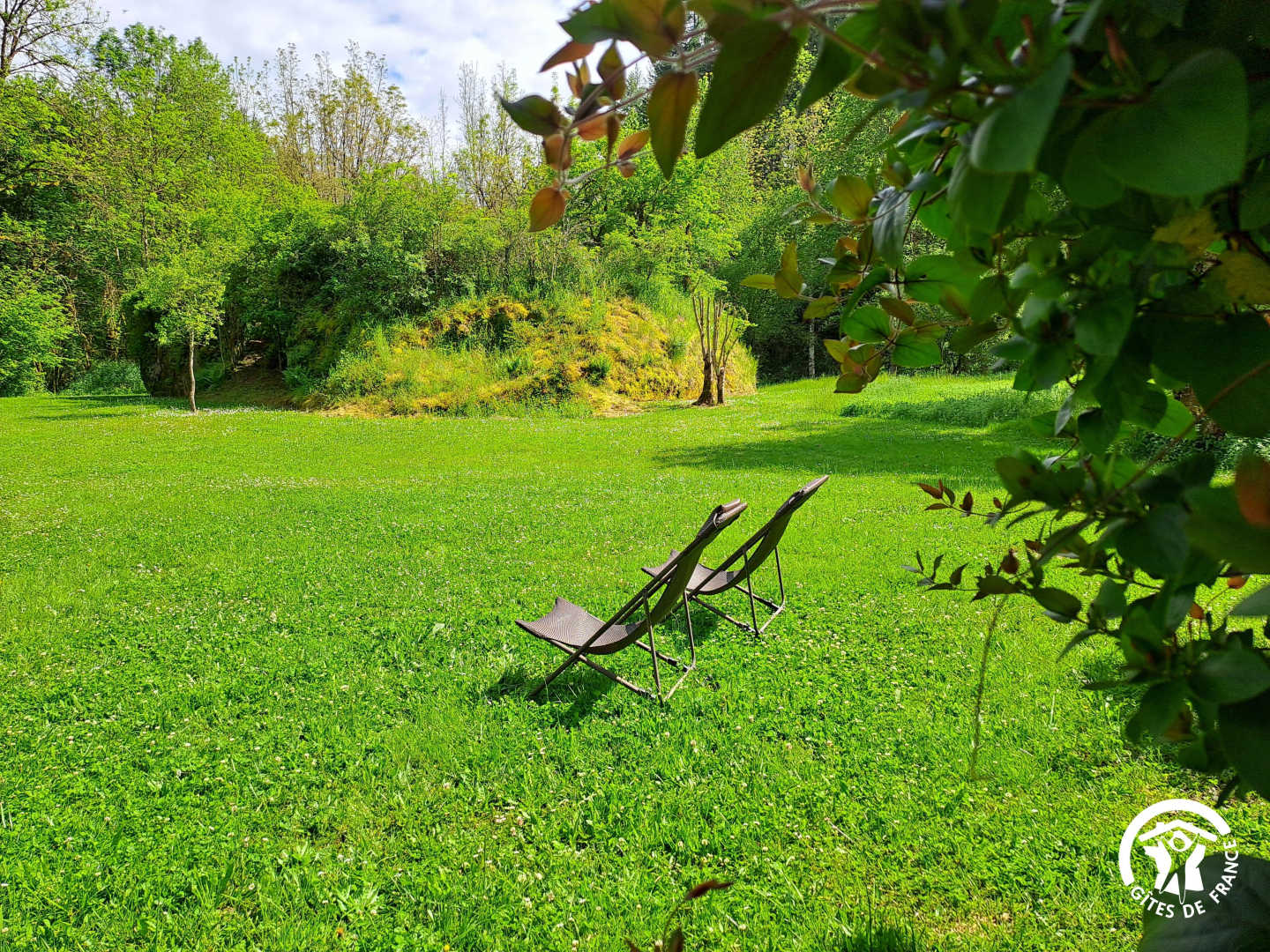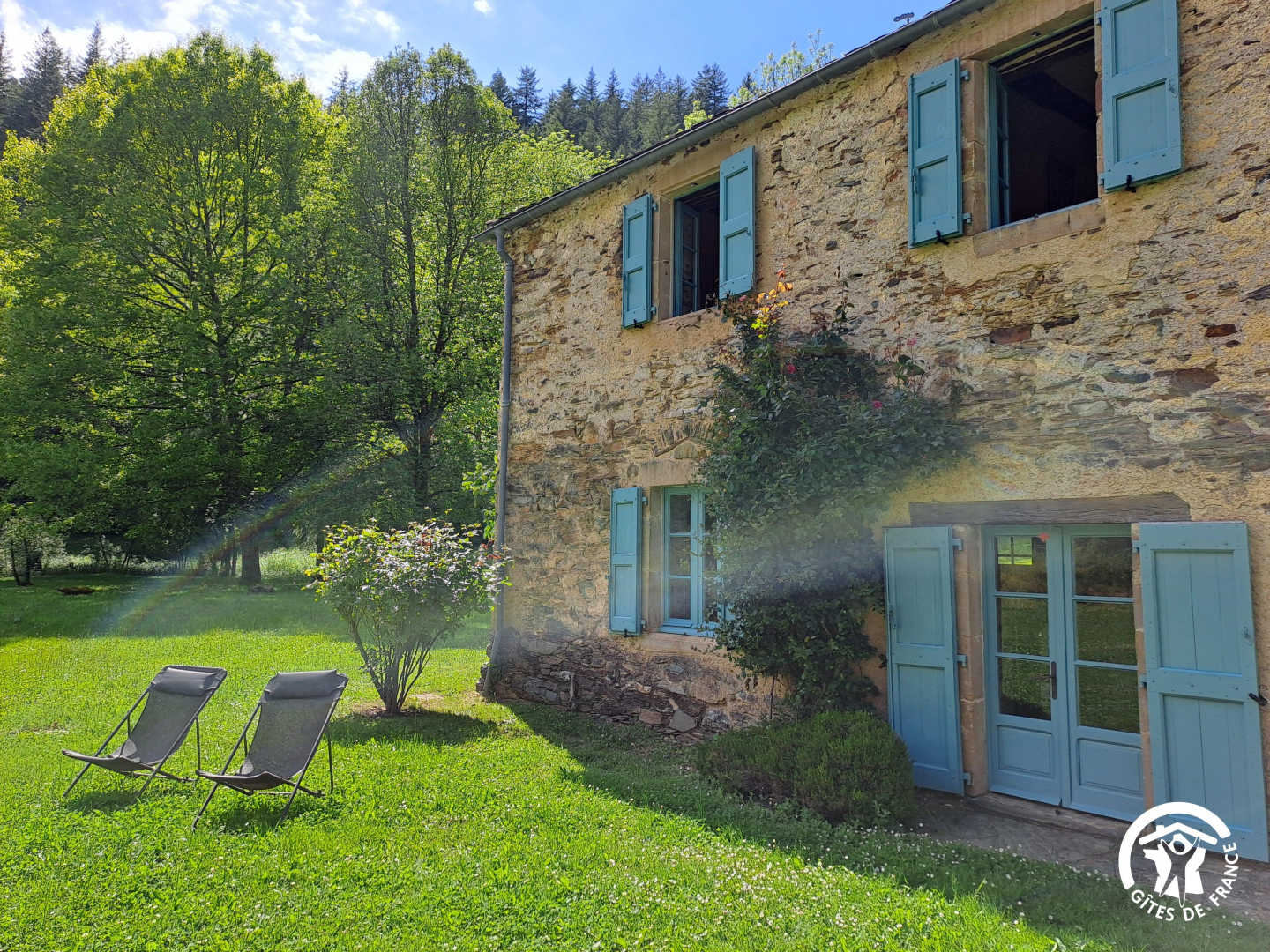 Indep. Gr. fl.: kitchen, living-rm/ dining-rm (sofa-bed), WC. 1st fl. : 3 bdrms (1 bd 5ft2, 2 twin bds 2ft6, 2 bds 3ft indep), bathrm, shower rm, WC. Electr.heating stove in open fire. Washing mach, tumble dryer, dishwasher, TV-DVD, micro-wave, telephone. Grounds, terrace, garden table & chairs, BBQ, parking. Bed linen, towels and house linen: complimentary service. Animal not allowed. 6 mountains bikes available. The house is deeply situated in full nature, in an exceptional setting, bordered by a wild trout’s river, and a hiking path. Set in a clearing surrounded with woods, one has access thru a XVIIth century embossed bridge. Comfortable, pleasant stay in any season.
