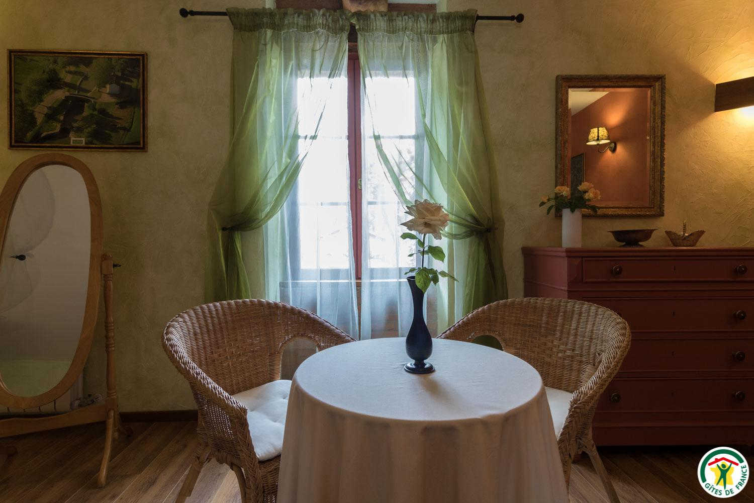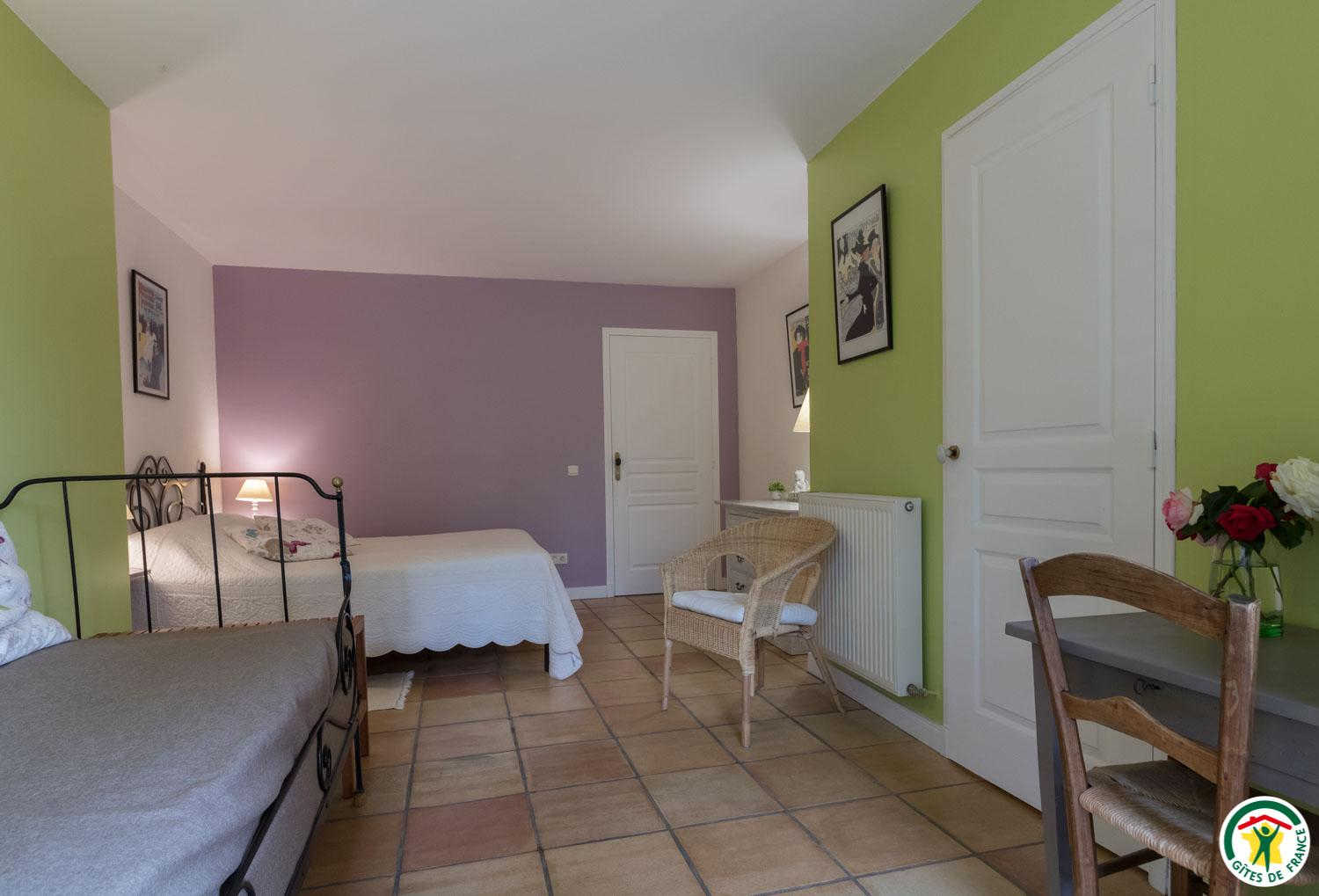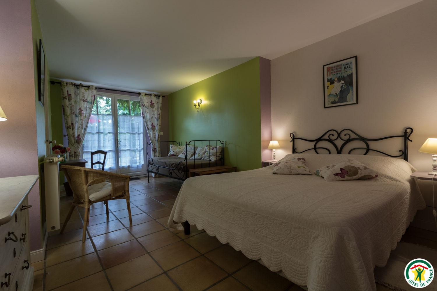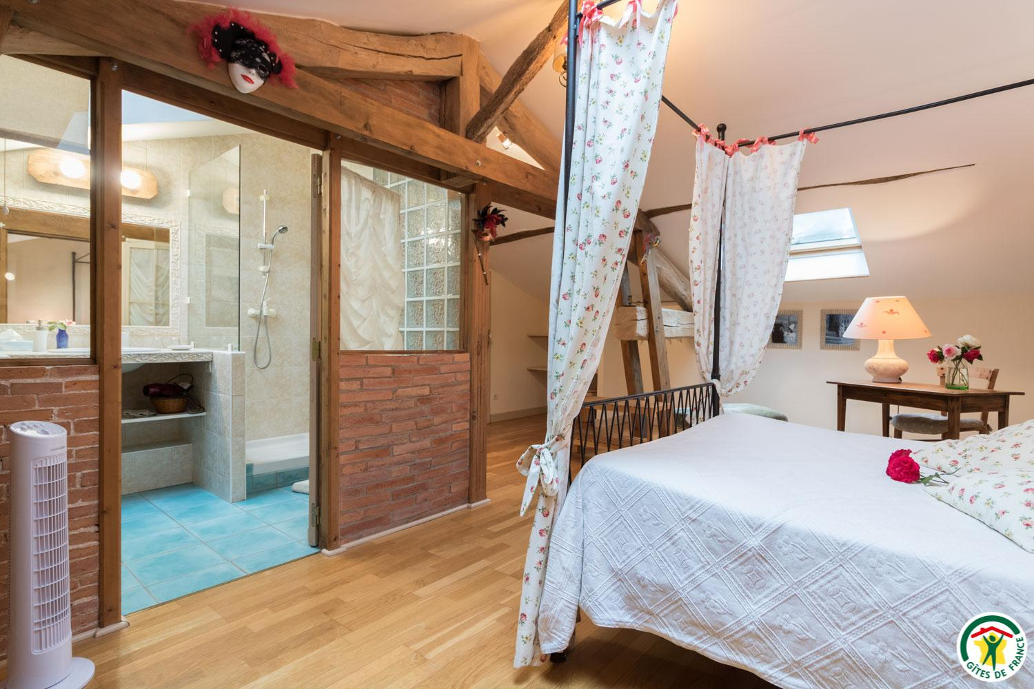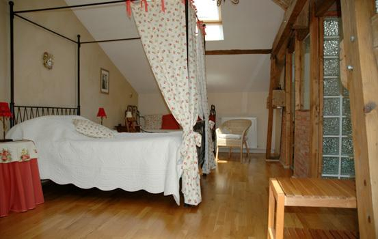 – First floor: “Venise” room with sloping ceilings (1 canopied 140cm double bed + 1 90cm single bed + bathroom, shower and WC).
