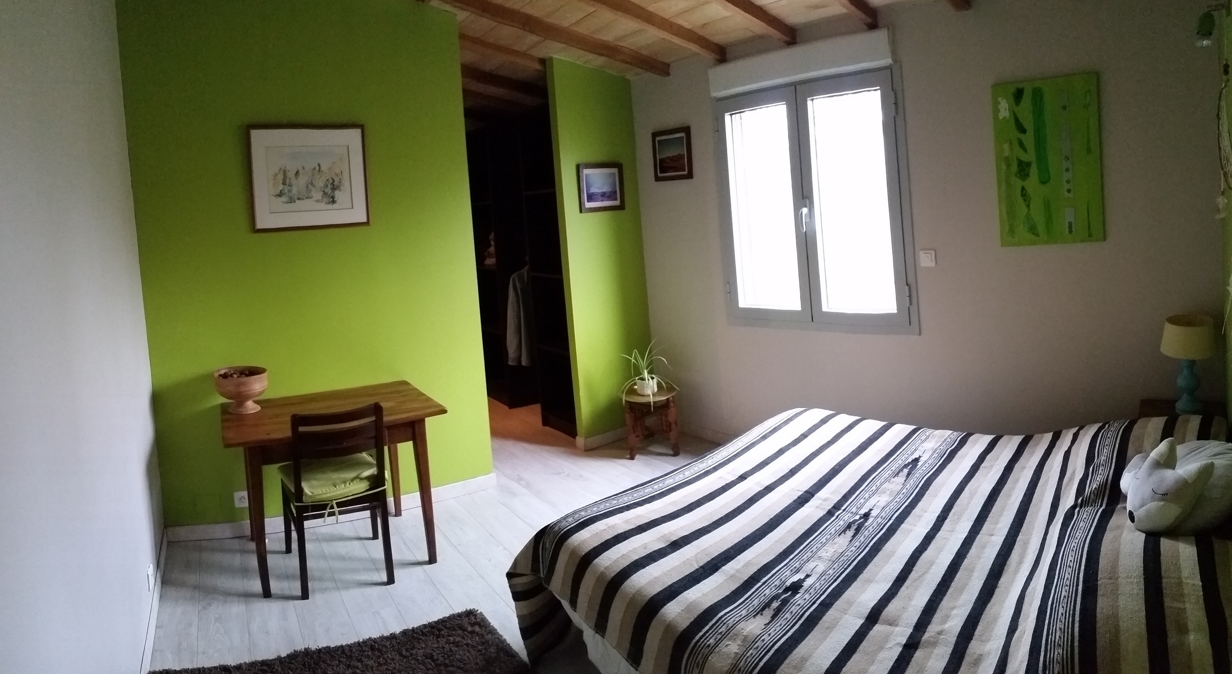 de groene kamer met 1 tweepersoonsbed + wastafel + douche